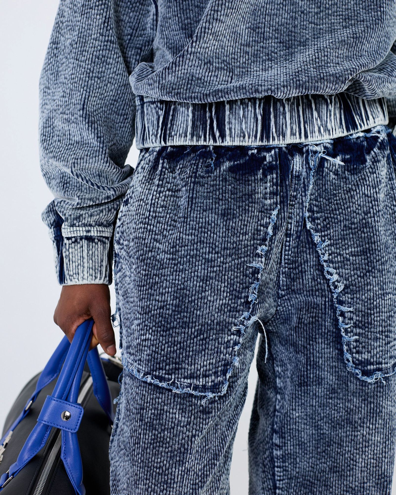 Джоггеры свободного прямого кроя выполнены из крупного фактурного вельвета с вываренным эффектом washed. Комфортная резинка на талии и кулиска с фиксатором на щиколотках с возможностью утяжки обеспечивают удобство в носке. Джоггеры дополнены логотипом и карманами с необработанным краем. Мы рекомендуем сочетать их со свитшотом washed из этого же комплекта.