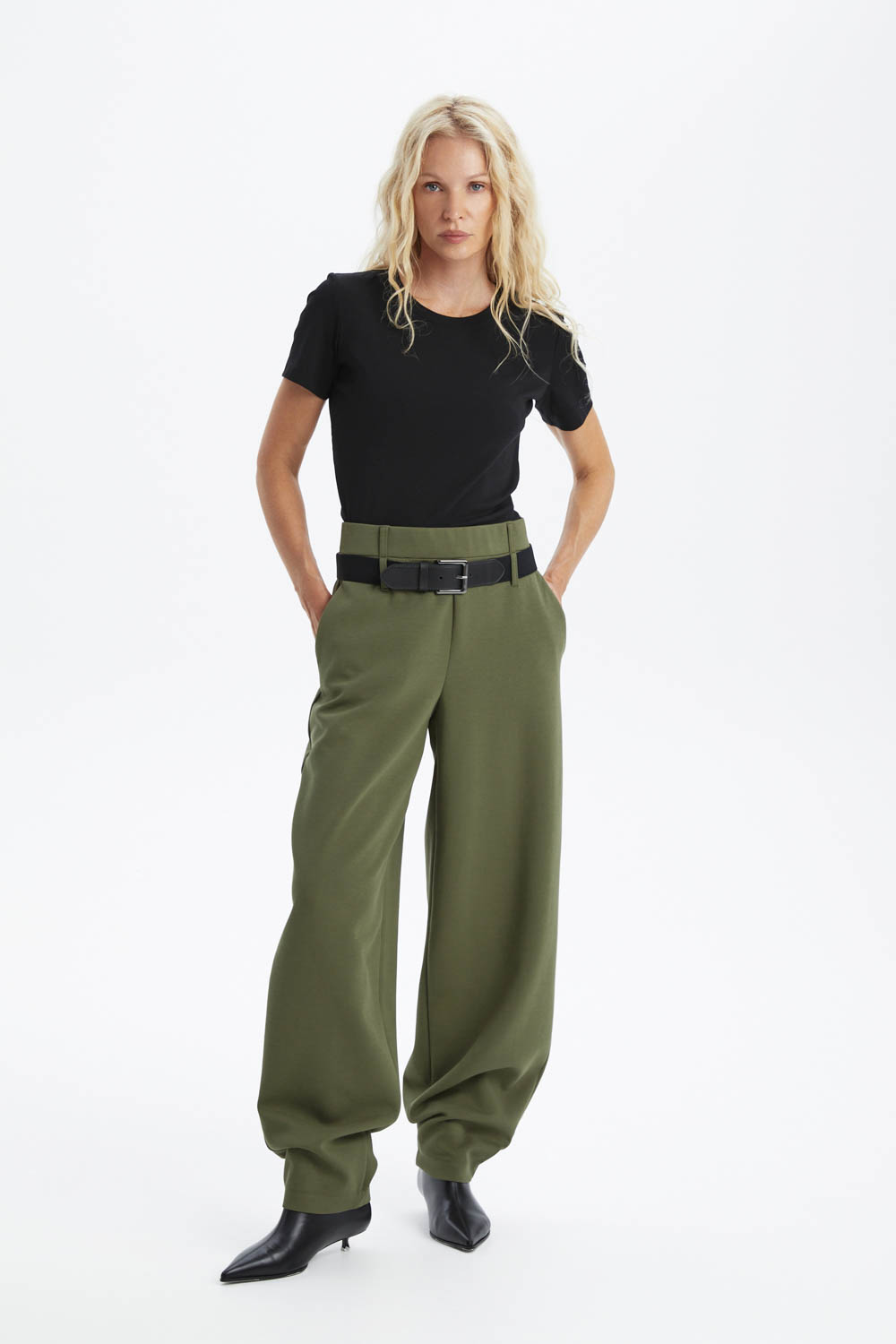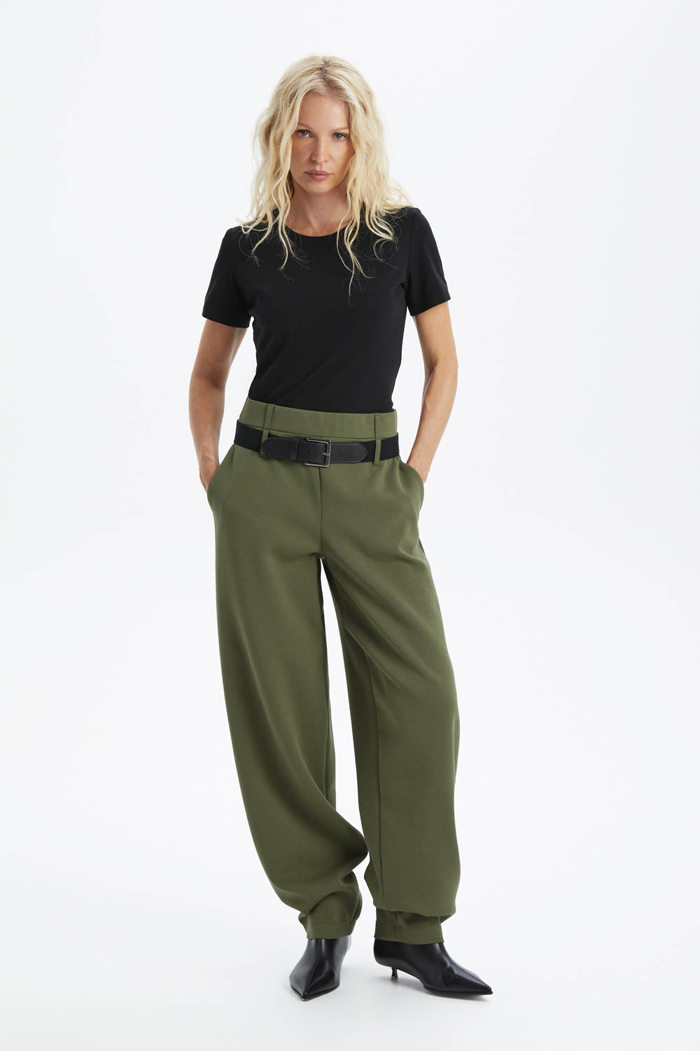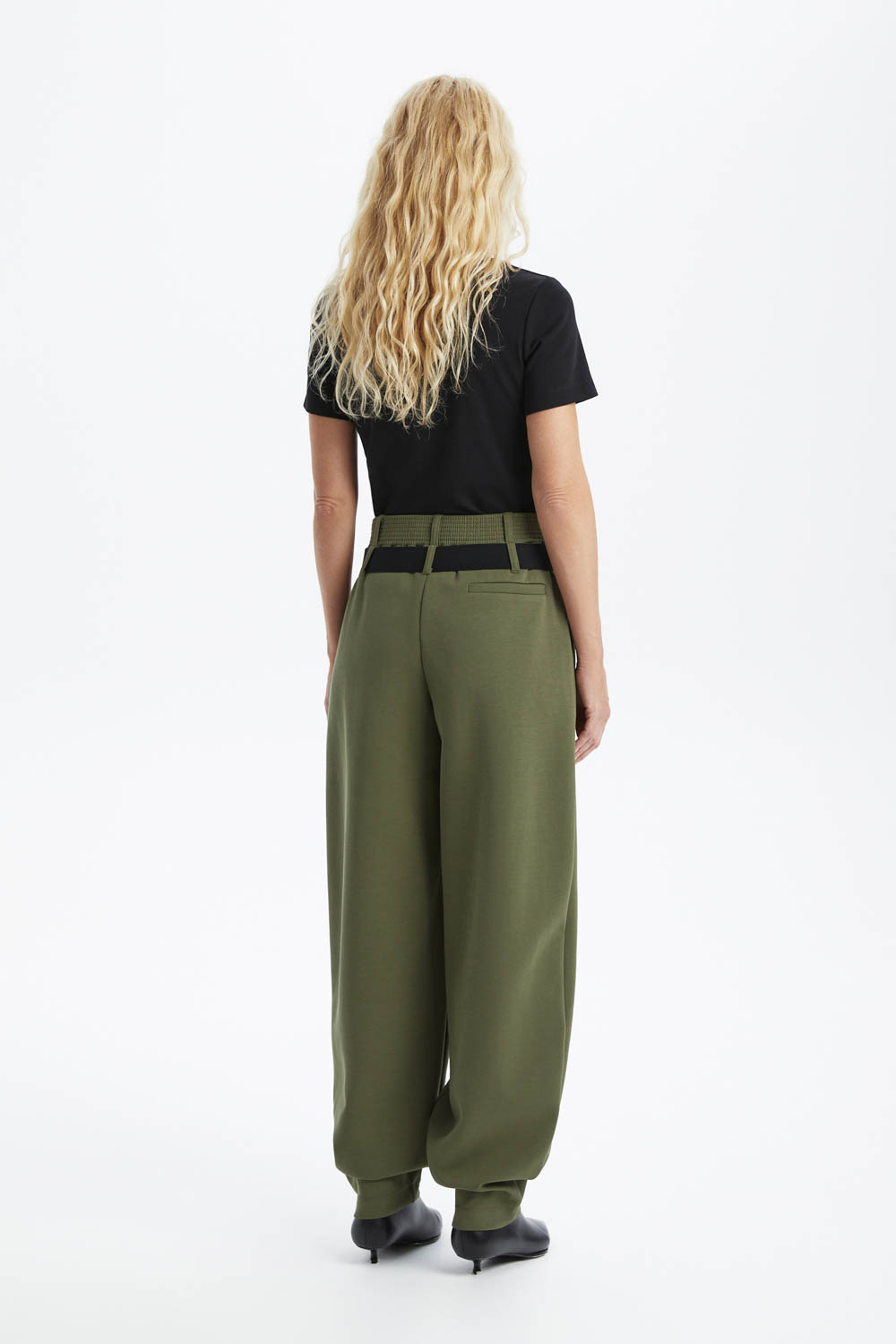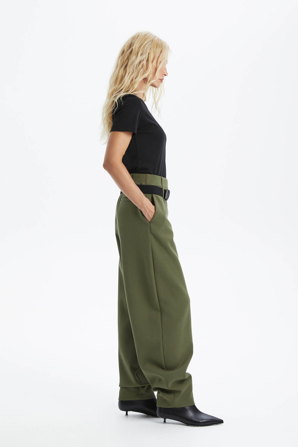 Брюки-багги выполнены из плотного трикотажного джерси мягкой костюмной фактуры глубокого оливкового оттенка, который подчёркивает современный и утончённый характер модели.