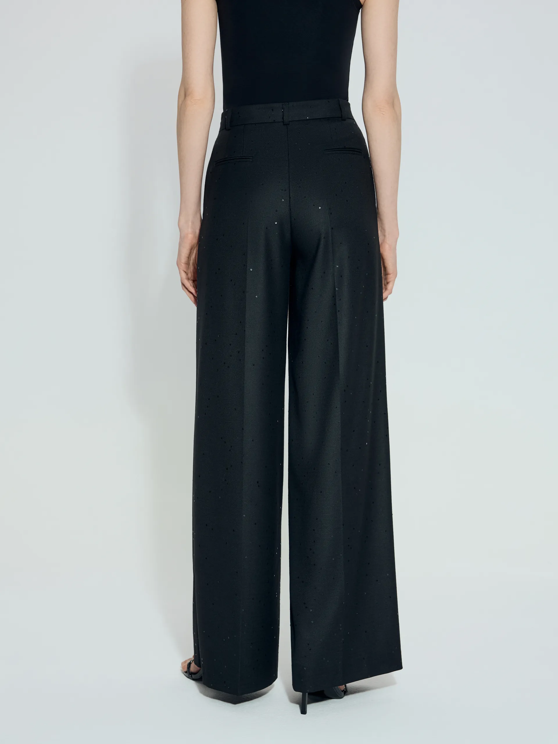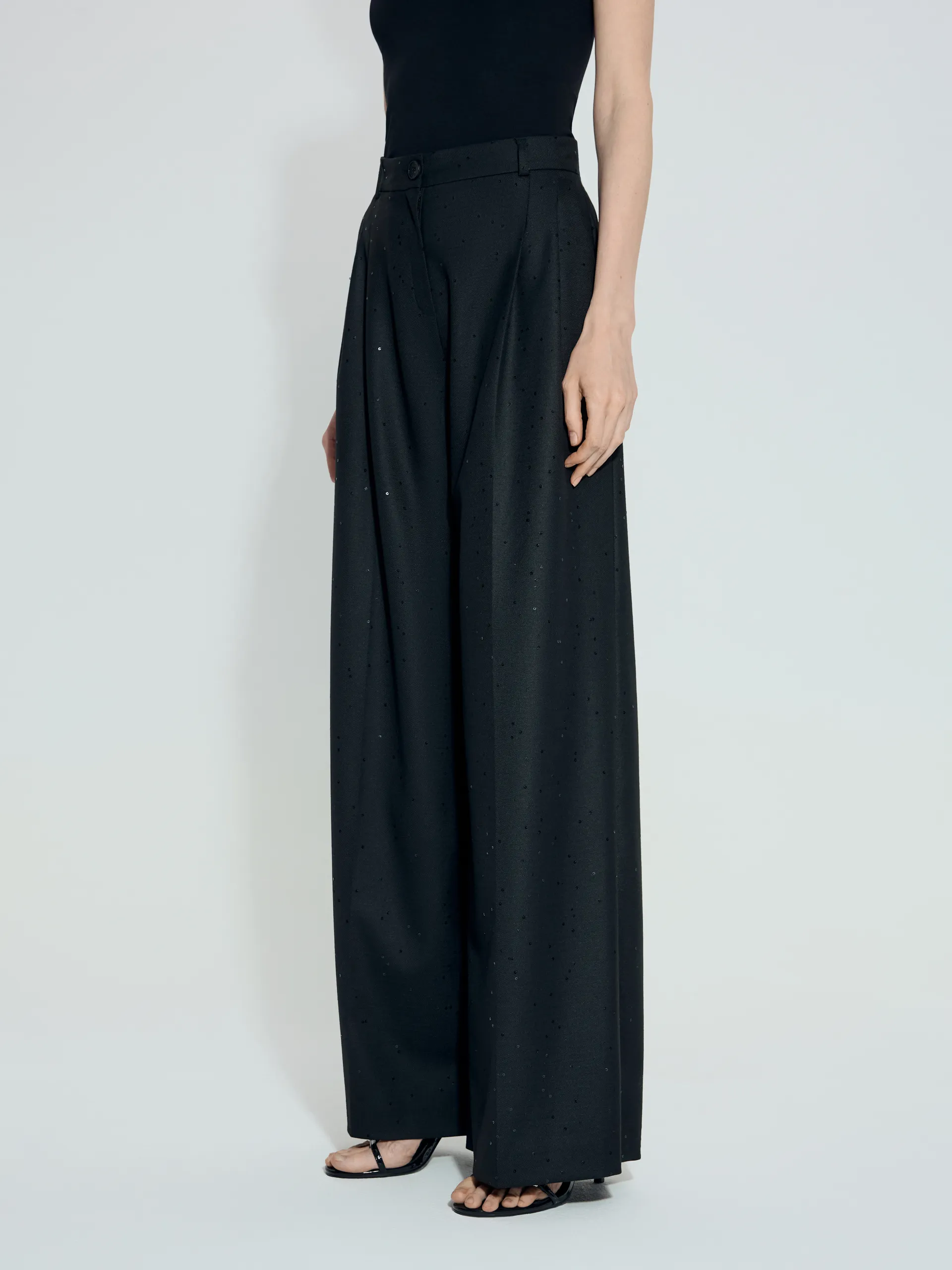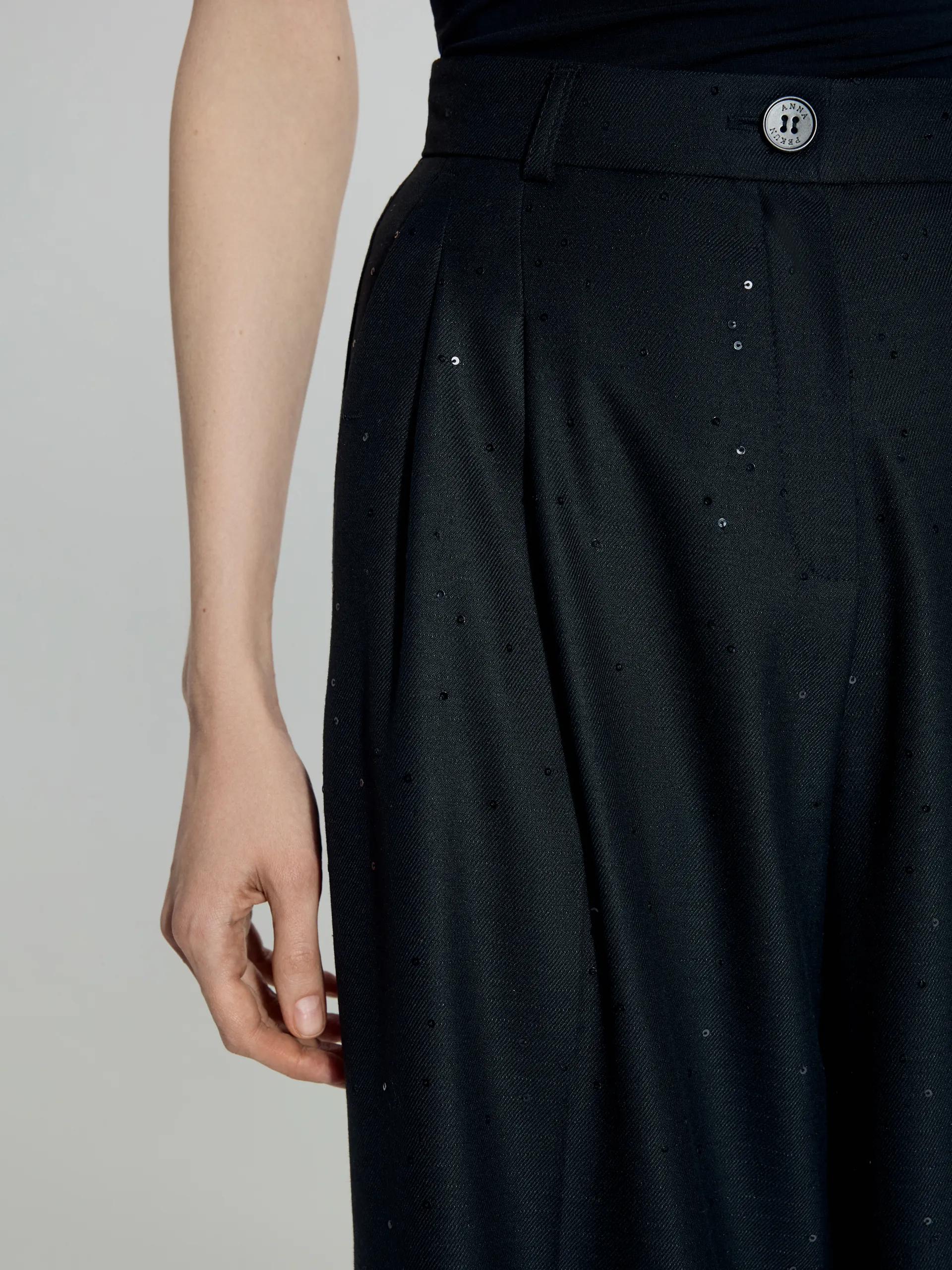 Брюки Hardi — элегантные палаццо в чёрную пайетку, одна из самых благородных моделей в коллекции. Высокая посадка визуально вытягивает силуэт и подчёркивает талию, а прямой расширенный крой делает ноги длиннее и стройнее. Пайетки выполнены деликатно, без излишнего блеска, что позволяет сохранять утончённость и носибельность образа. Идеально сочетать с жакетом Hugo для выразительного комплектного образа, а также с лаконичными топами или корсетами для более минималистичных акцентных сочетаний.