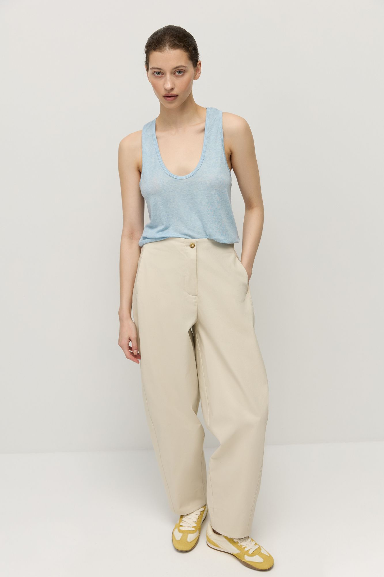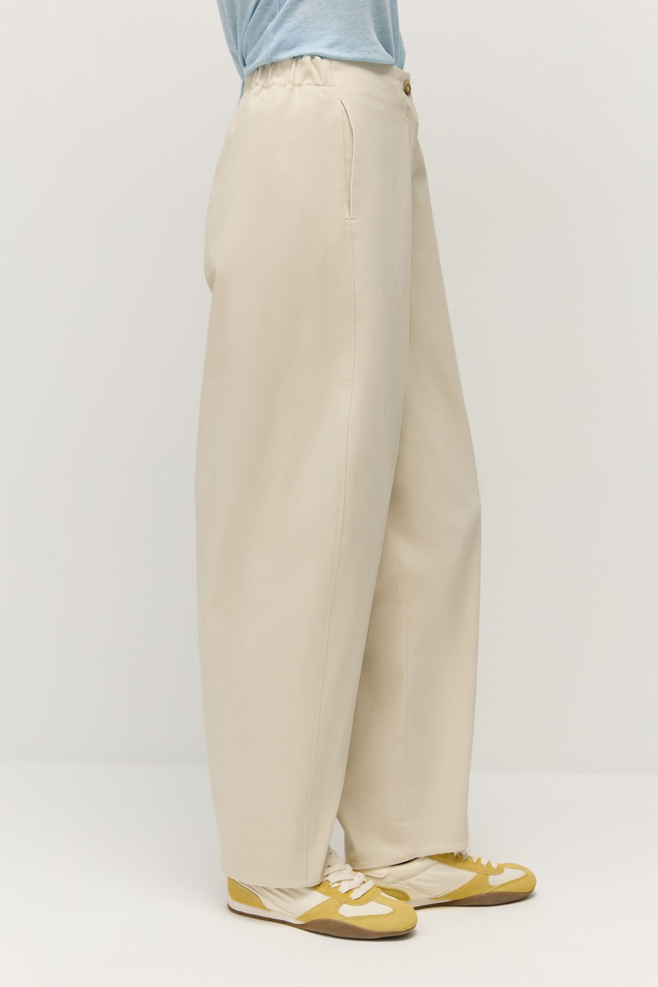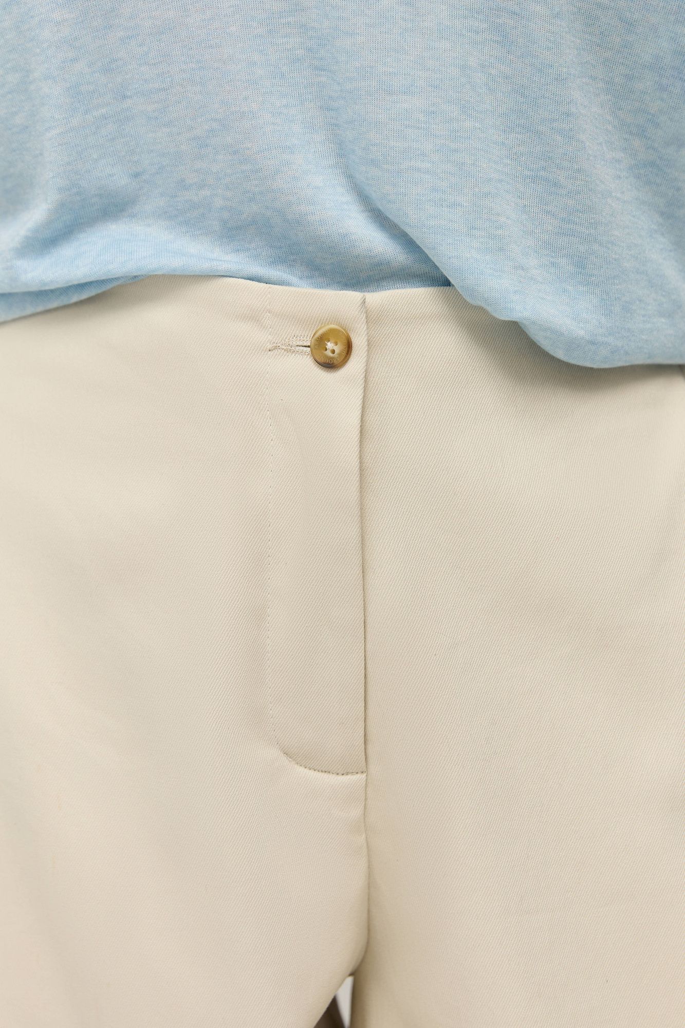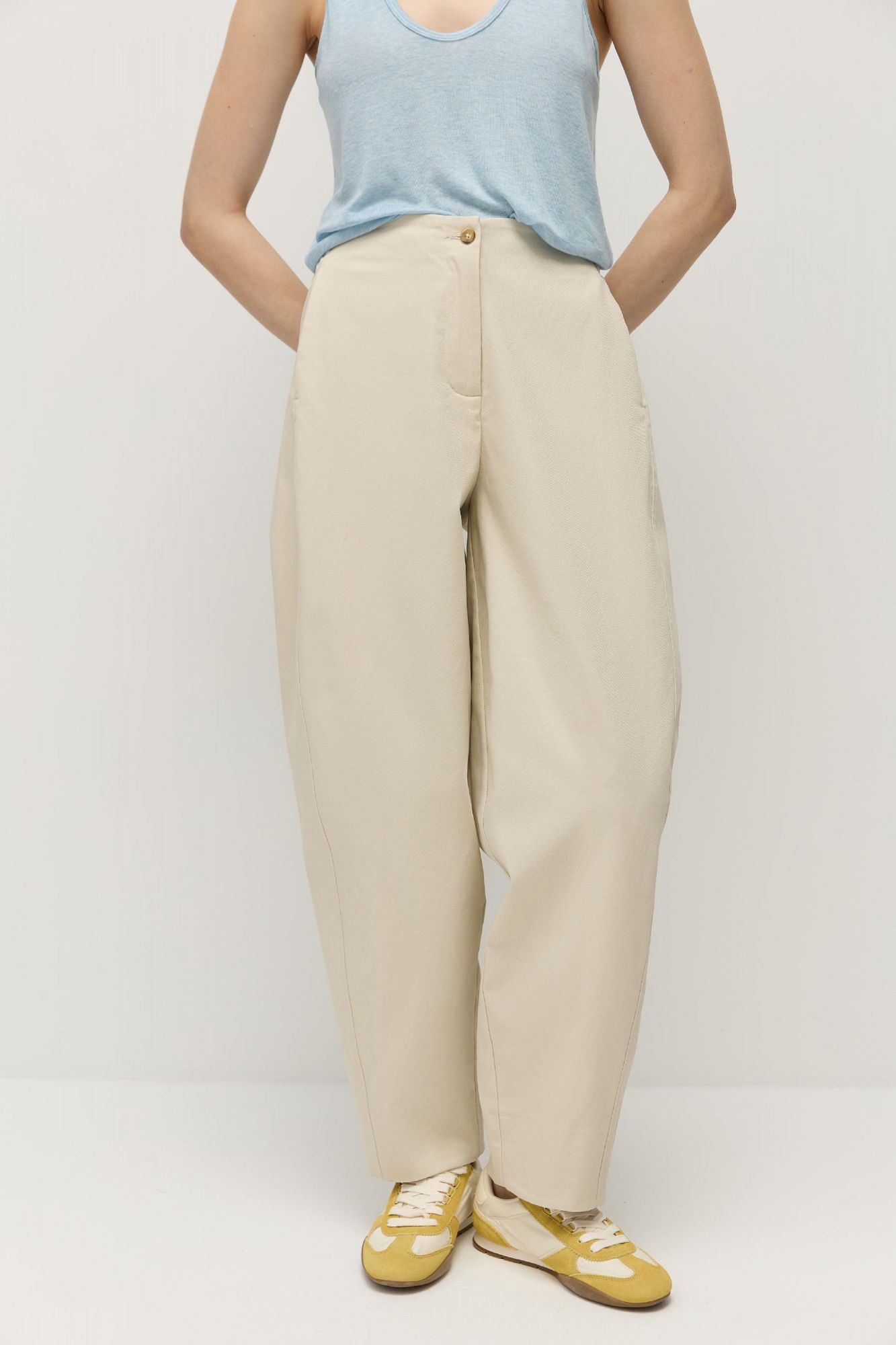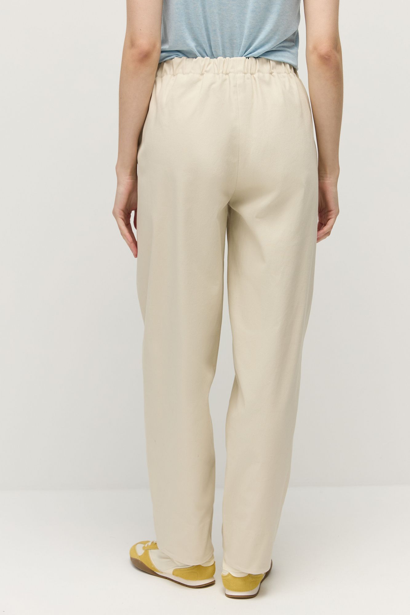 Брюки сшиты из натурального твилового хлопка в мелкий диагональный рубчик.