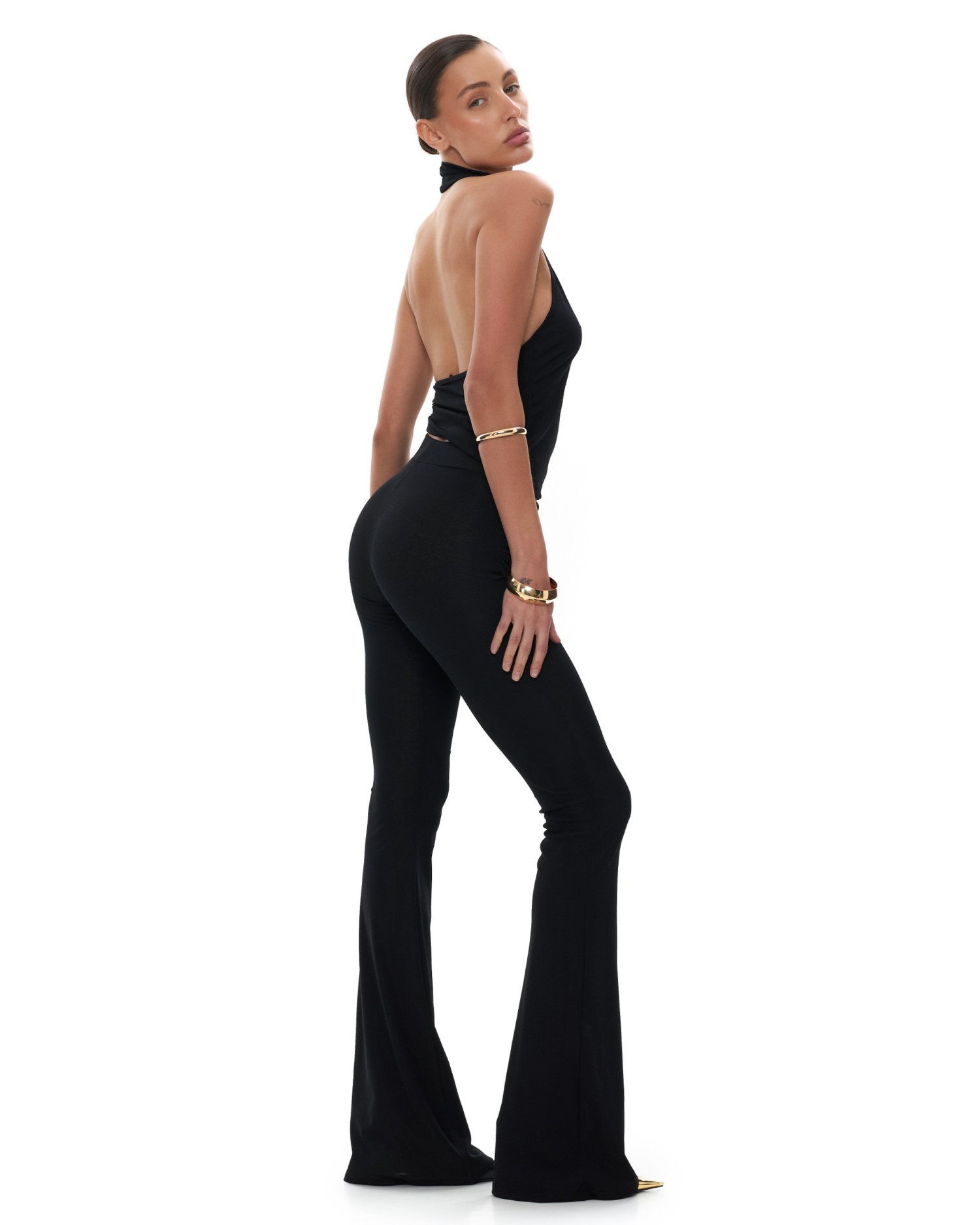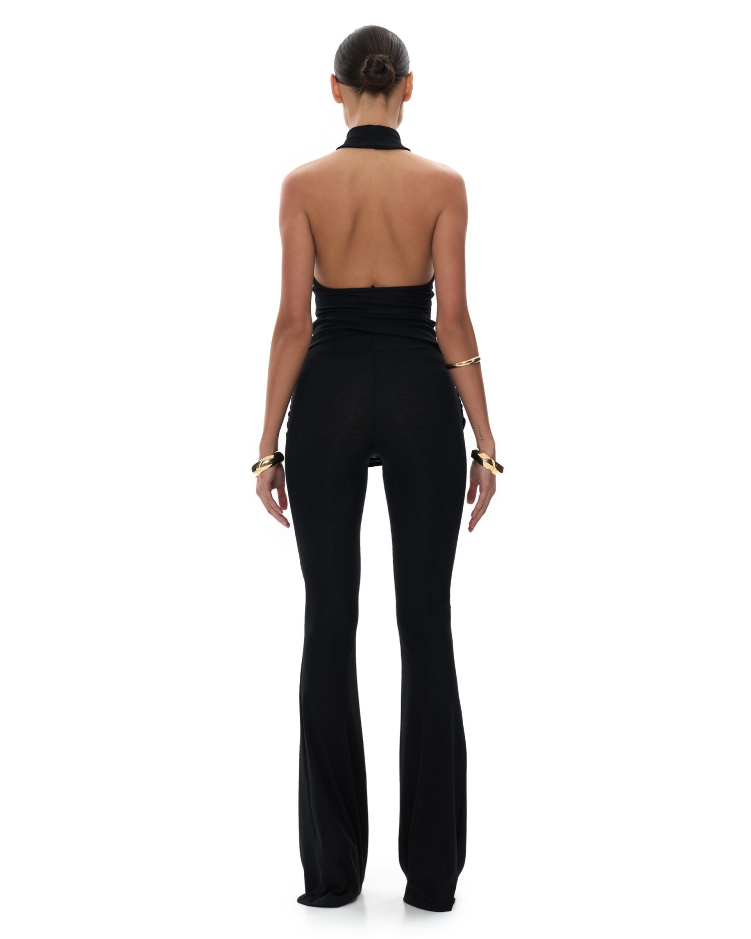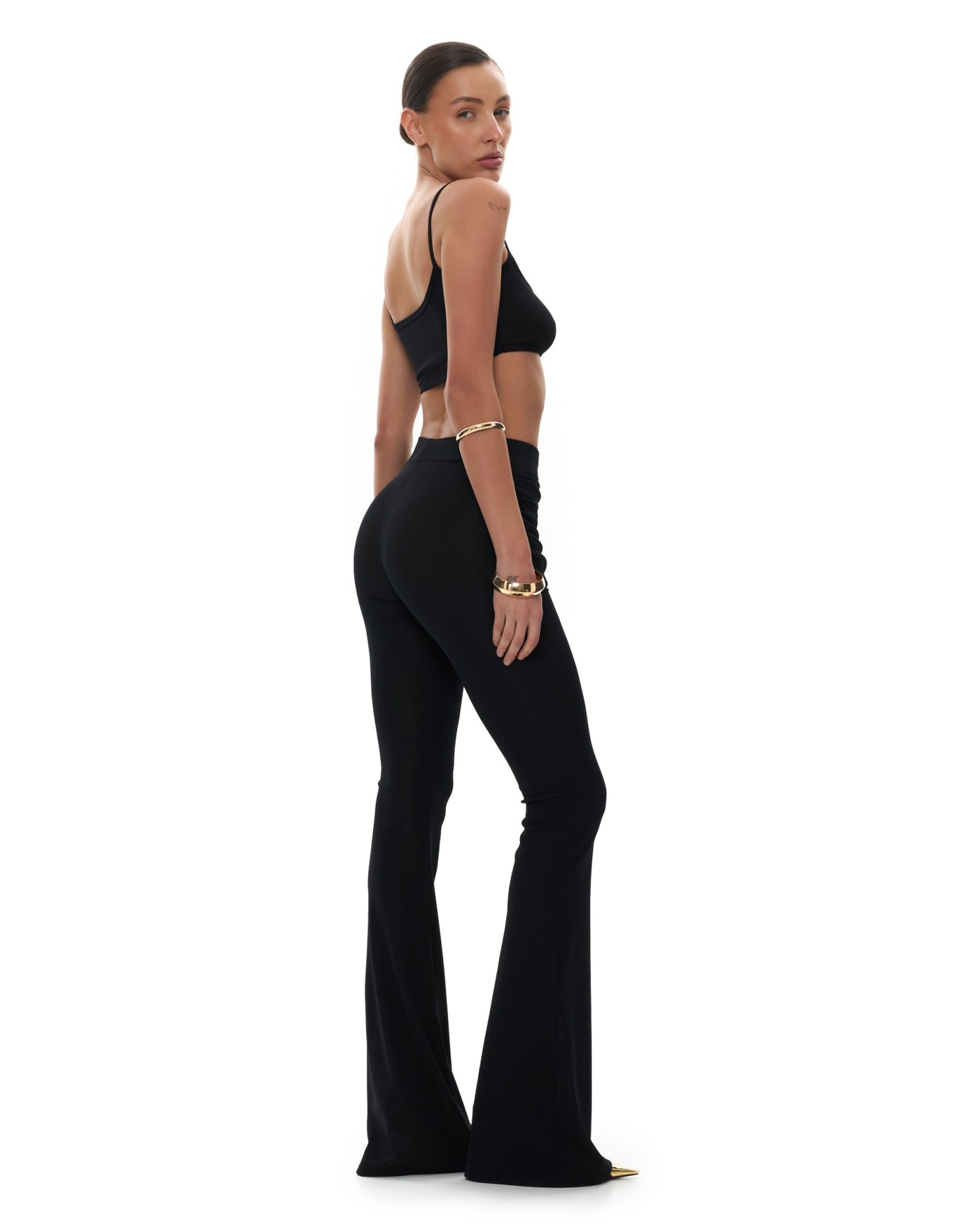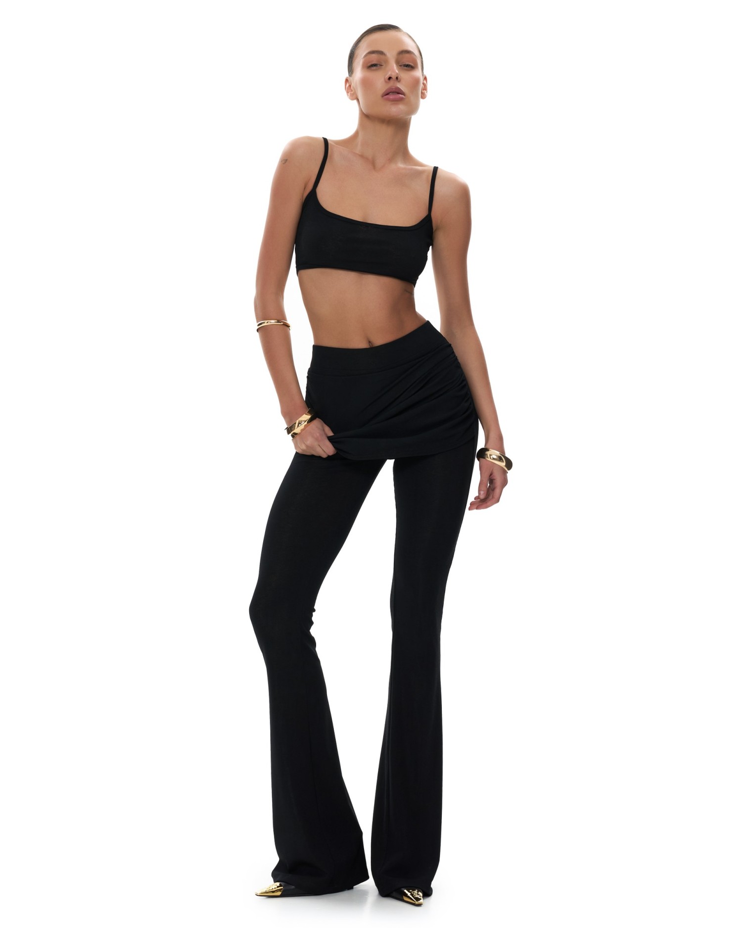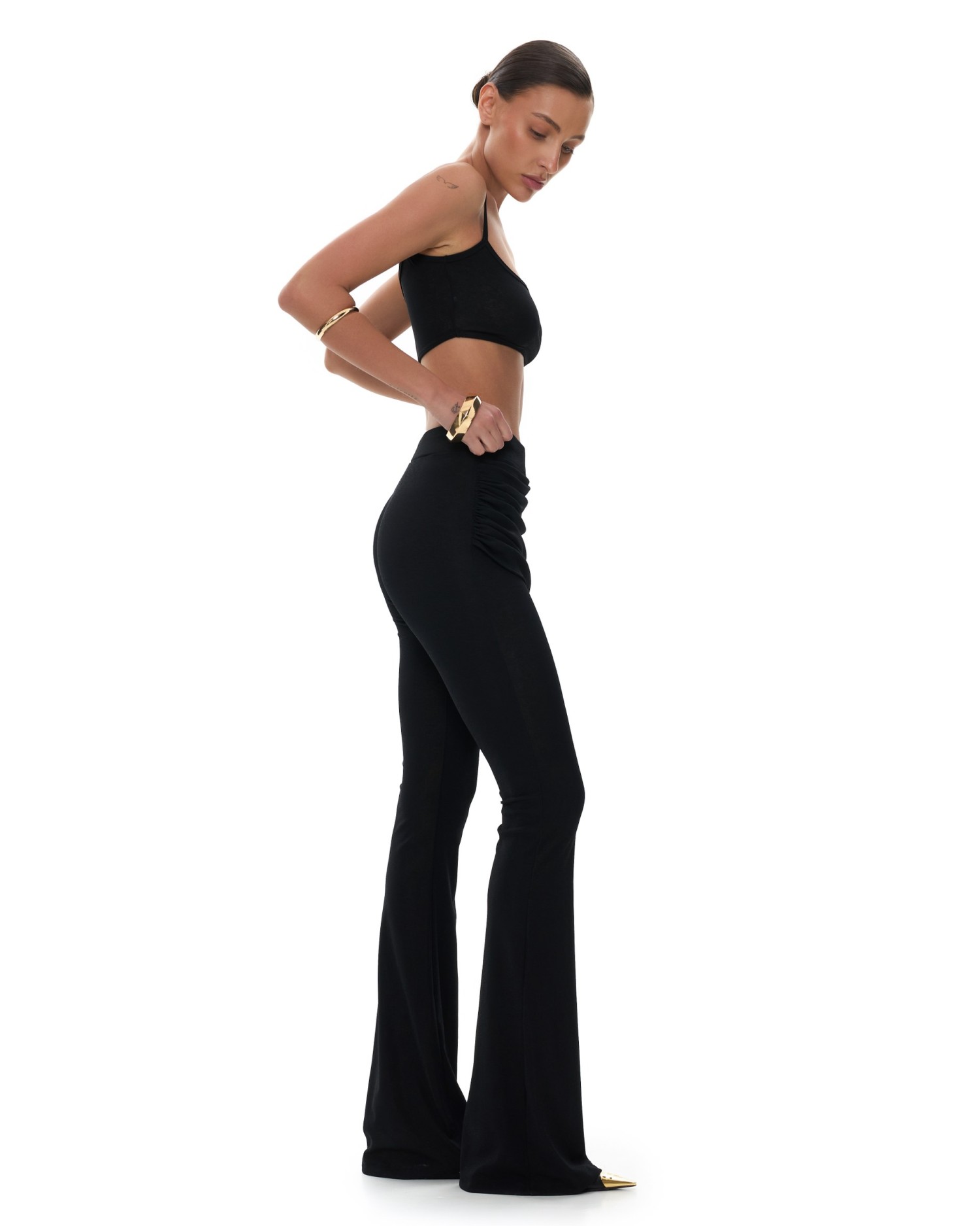 Брюки-клеш из полупрозрачного трикотажа с акцентной драпировкой на бедрах.