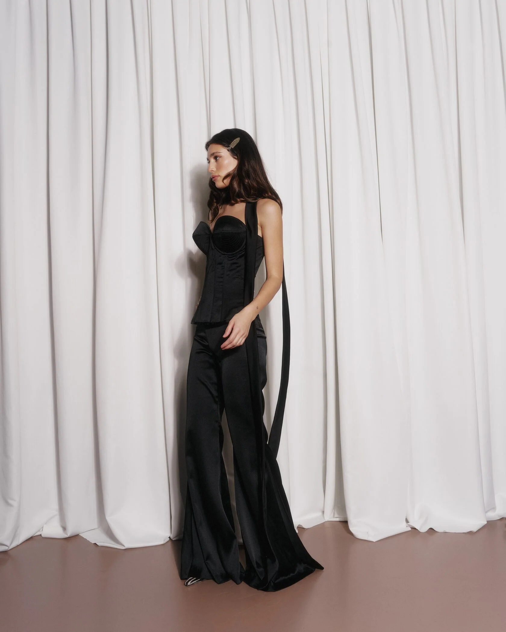 Стильные брюки из легкого струящегося шелка идеально подойдут для создания элегантного образа. Модель с клеш придает изысканность и свободу движений, а универсальный черный цвет делает их подходящими для любых случаев — от повседневных образов до вечерних мероприятий