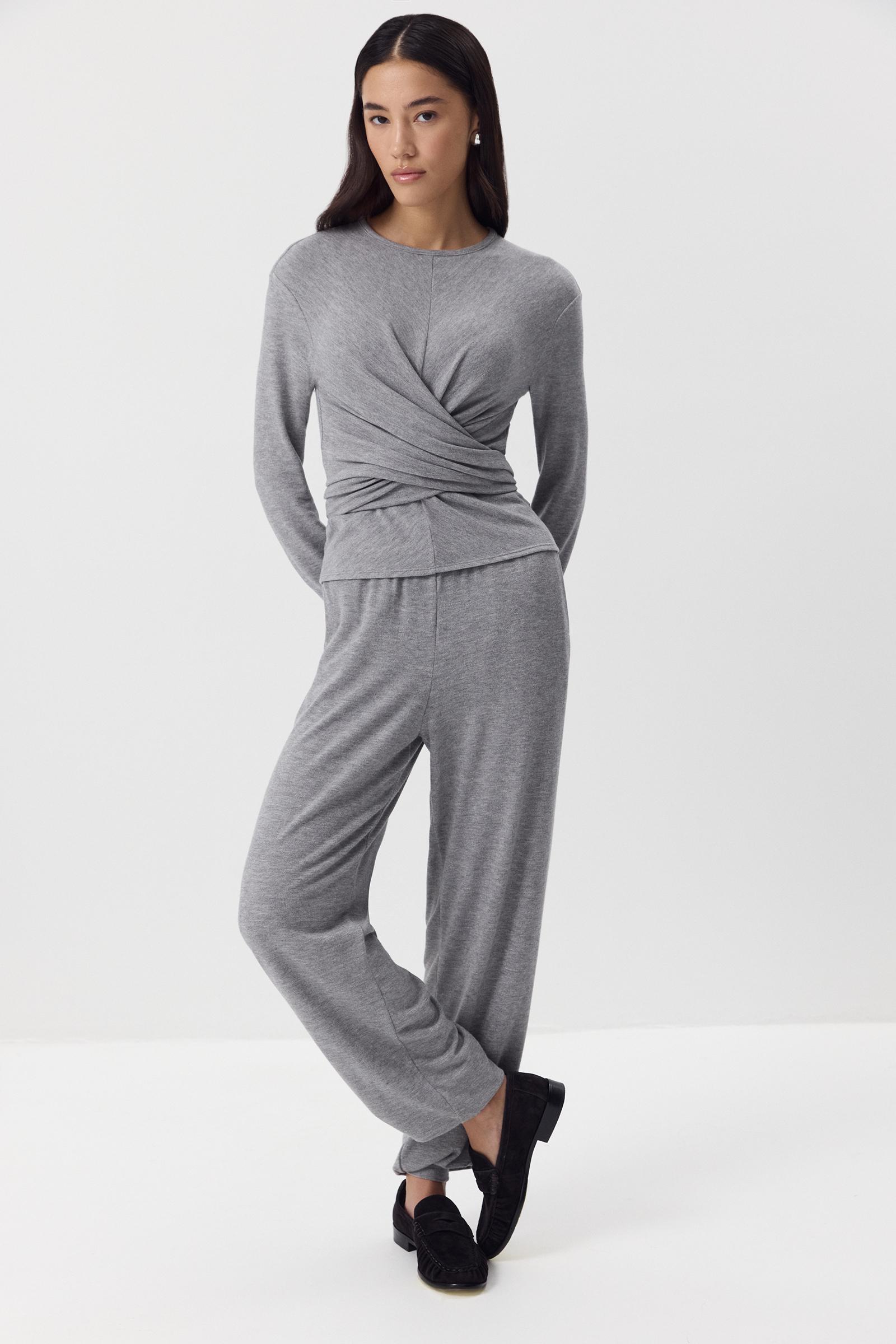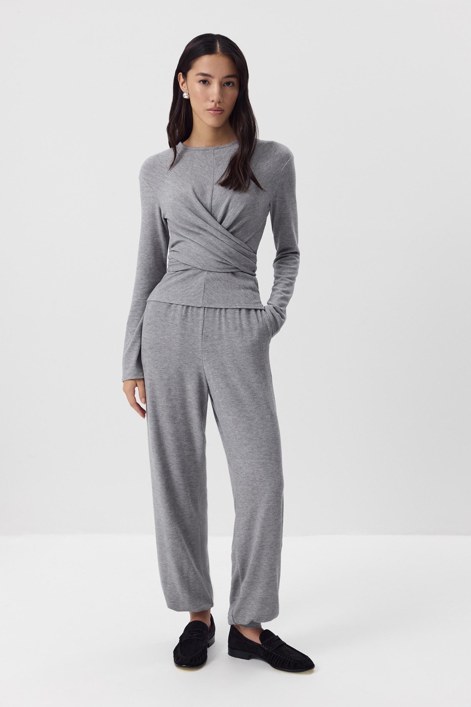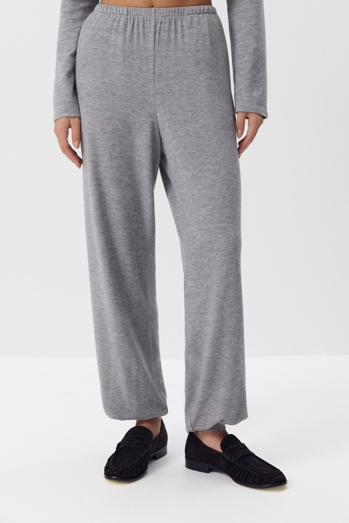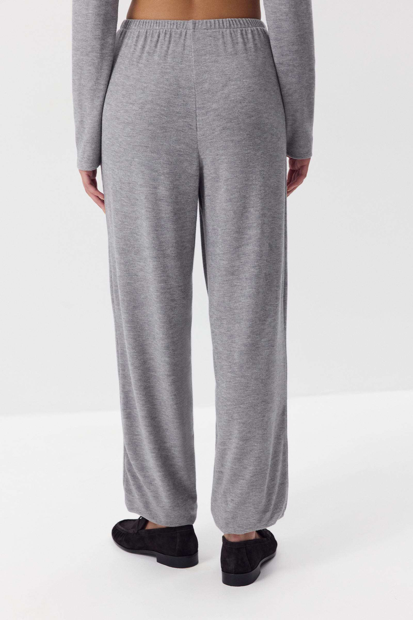 Брюки джоггеры из мягкого свитерного трикотажа. Объемный силуэт, который формируют широкие манжеты по низу. Брюки на тонком поясе с резинкой внутри.