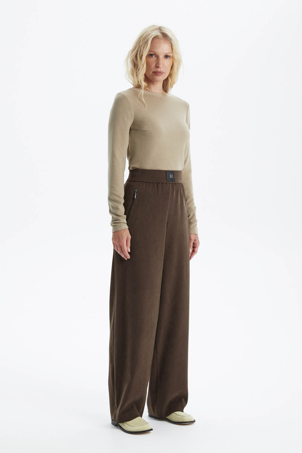 Высокая посадка с широкой эластичной поясной лентой-резинкой обеспечивает комфорт и подчёркивает талию, а прямые широкие штанины визуально вытягивают силуэт, создавая лёгкость образа. Удобные боковые карманы на молниях дополняют практичность модели.