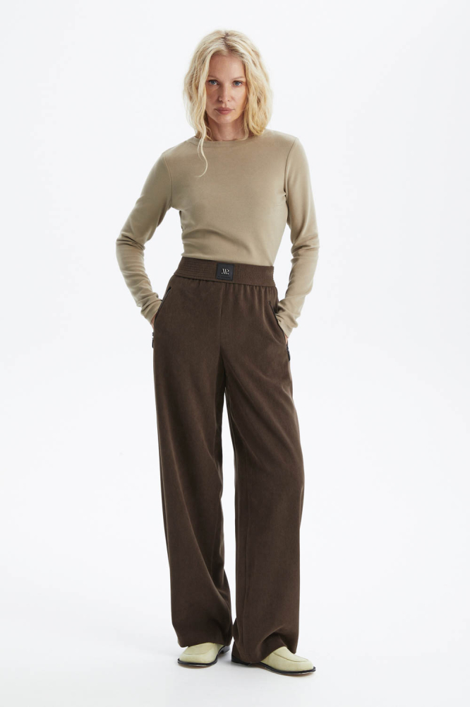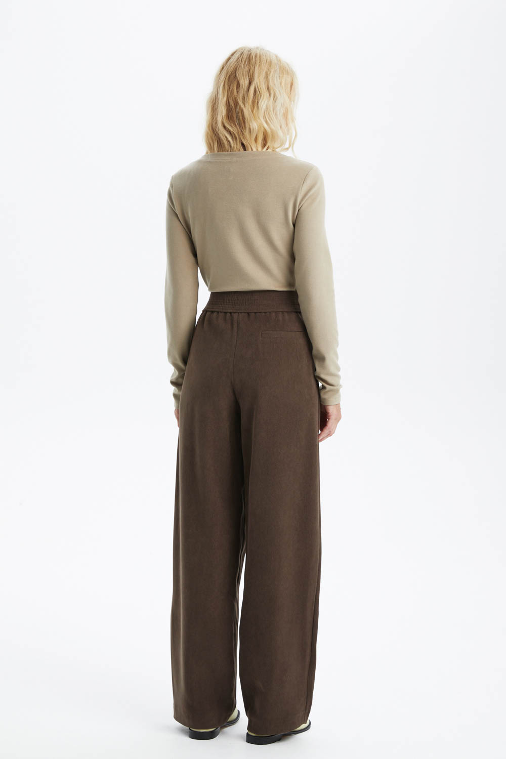 Прямые брюки выполнены из плотной мягкой ткани с лёгким ворсом благородного оттенка мокка, который подчёркивает элегантность и универсальность модели.