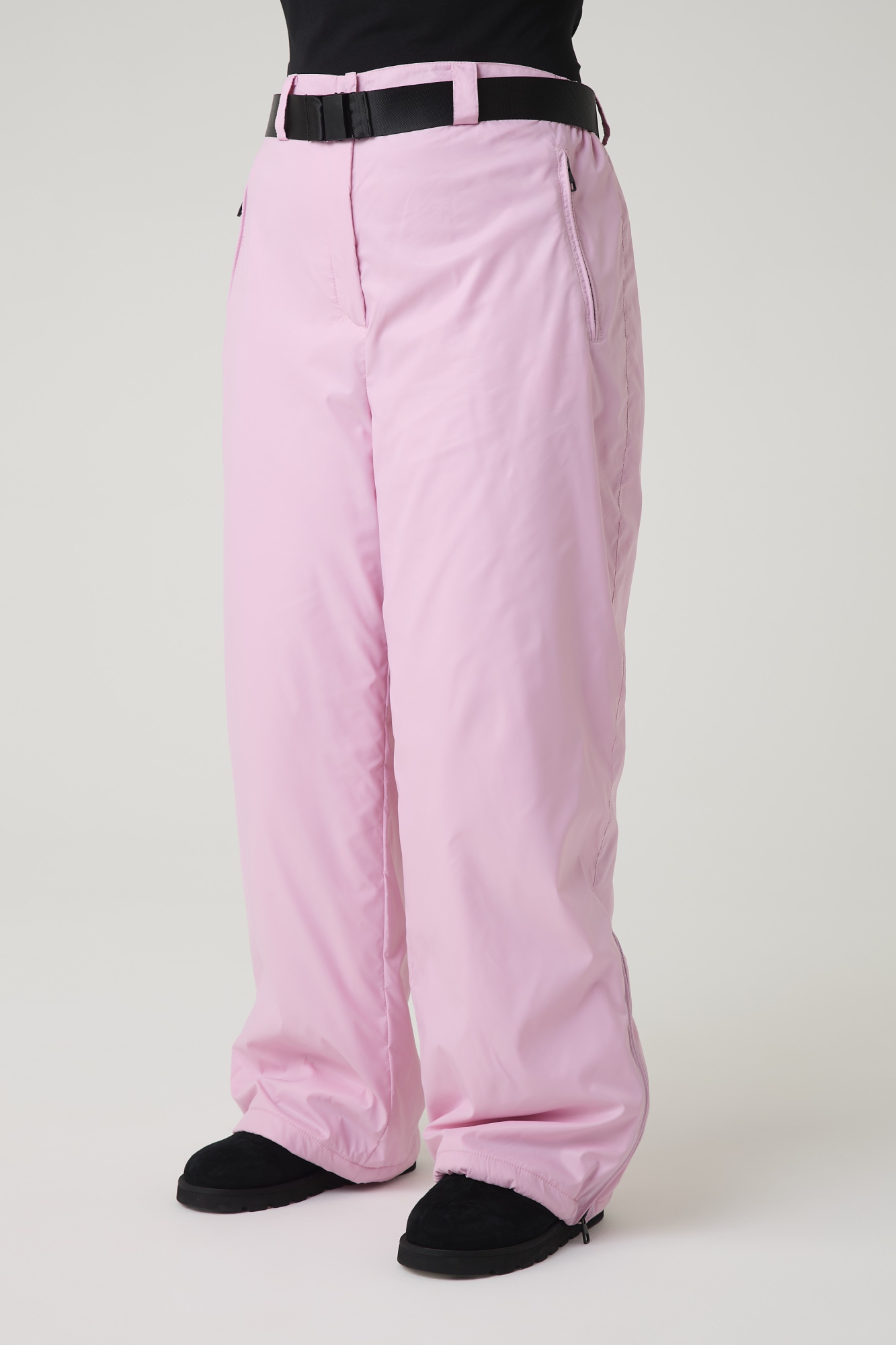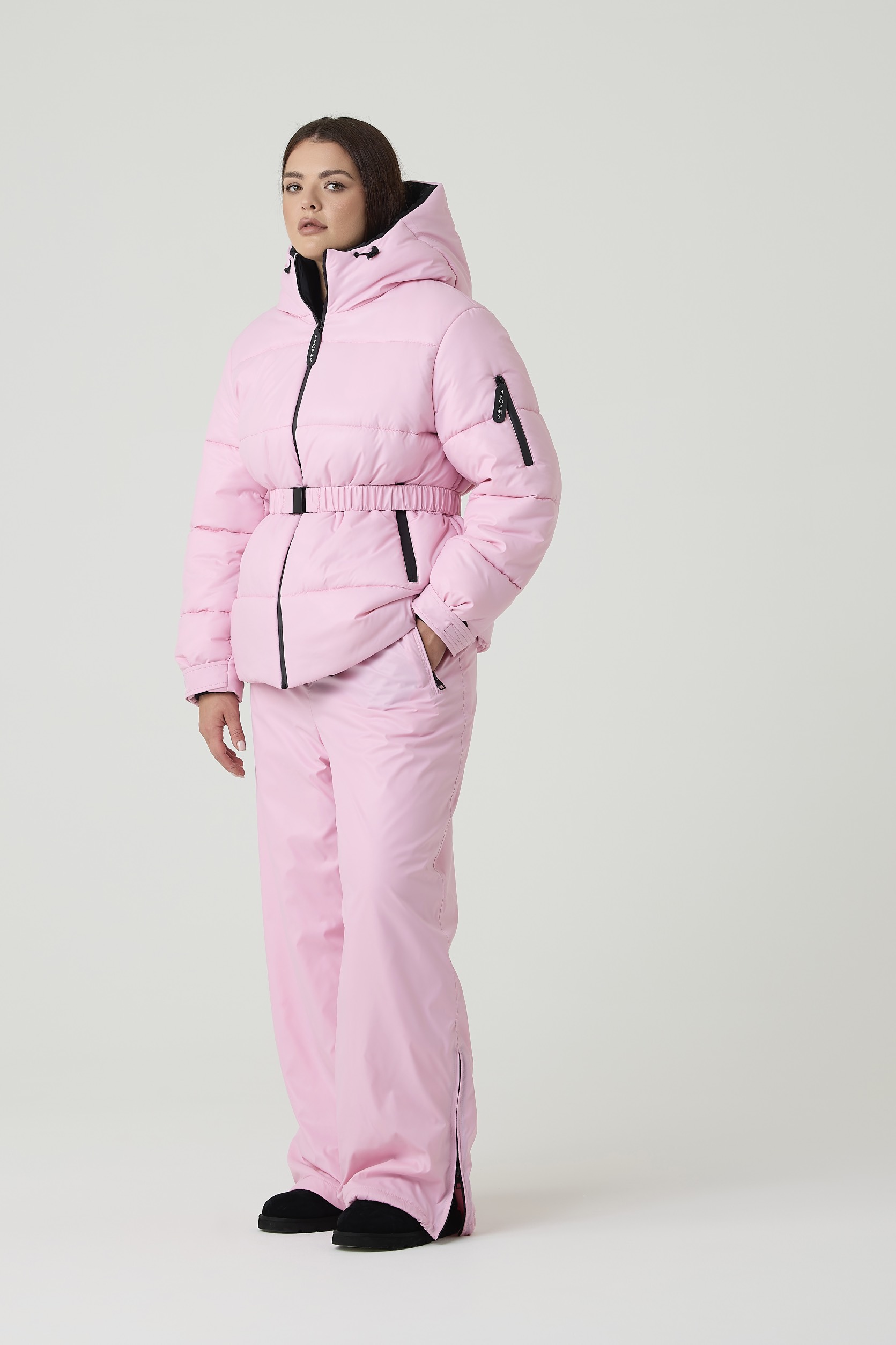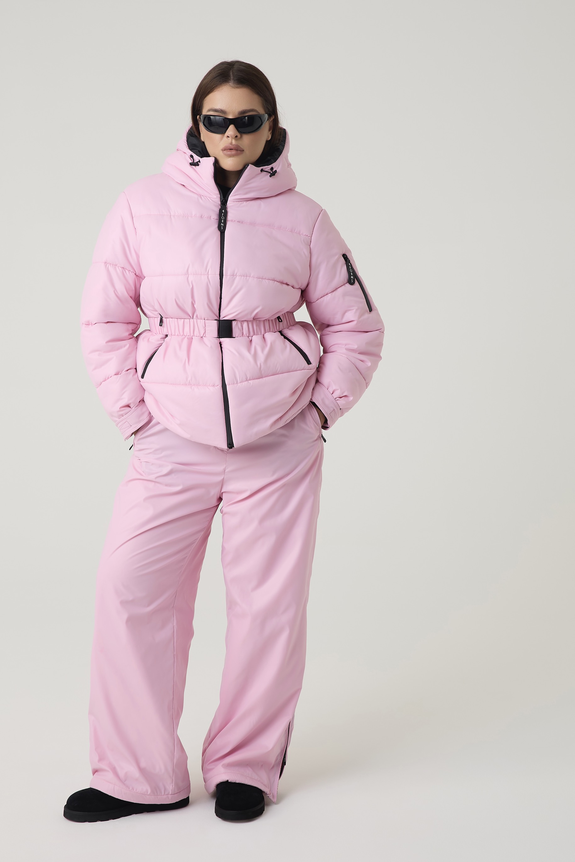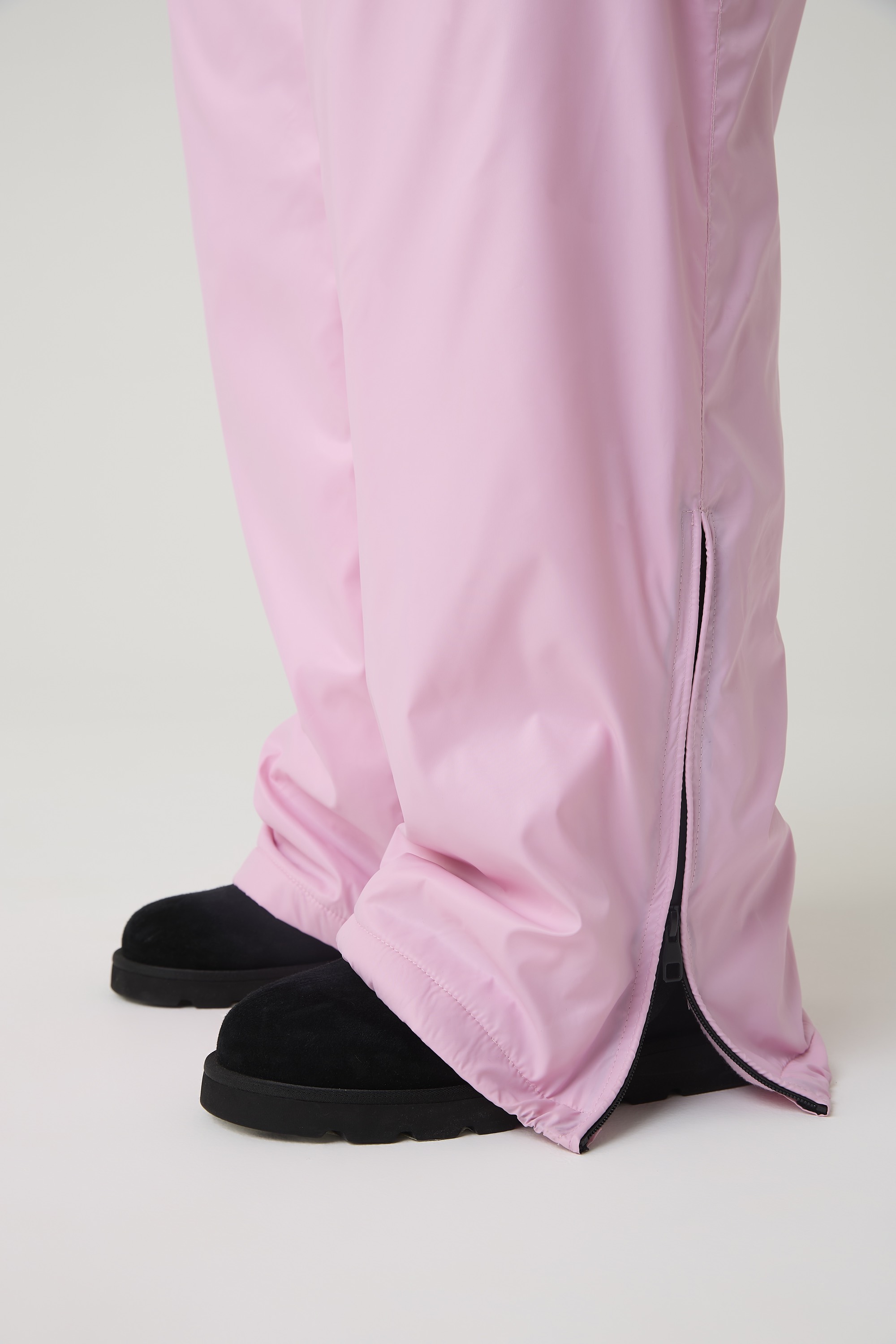 Женские утеплённые брюки свободного силуэта светло-розового цвета . Модель имеет эластичный пояс с резинкой для комфортной посадки. Брюки оснащены двумя боковыми врезными карманами на молниях.