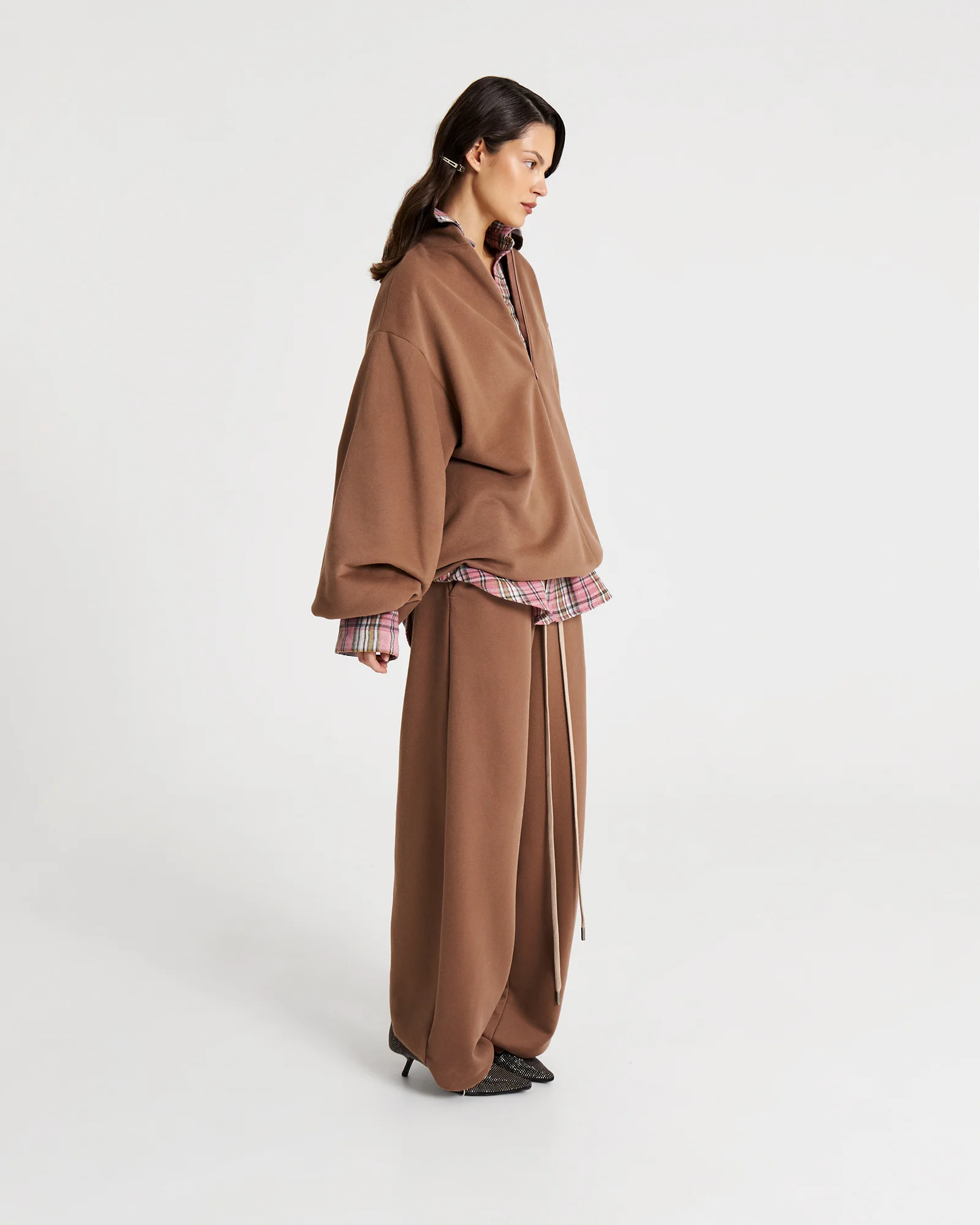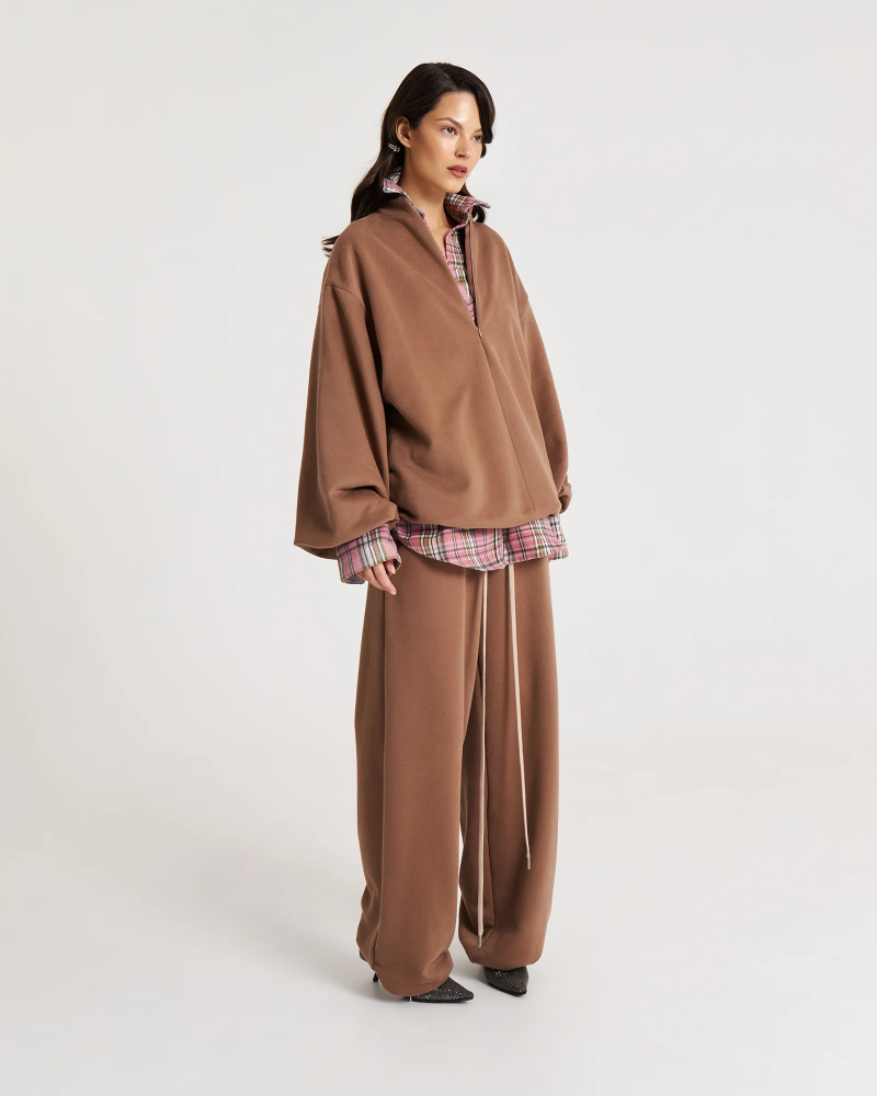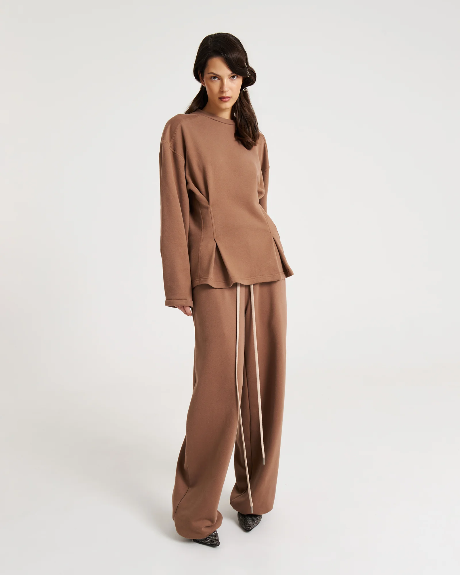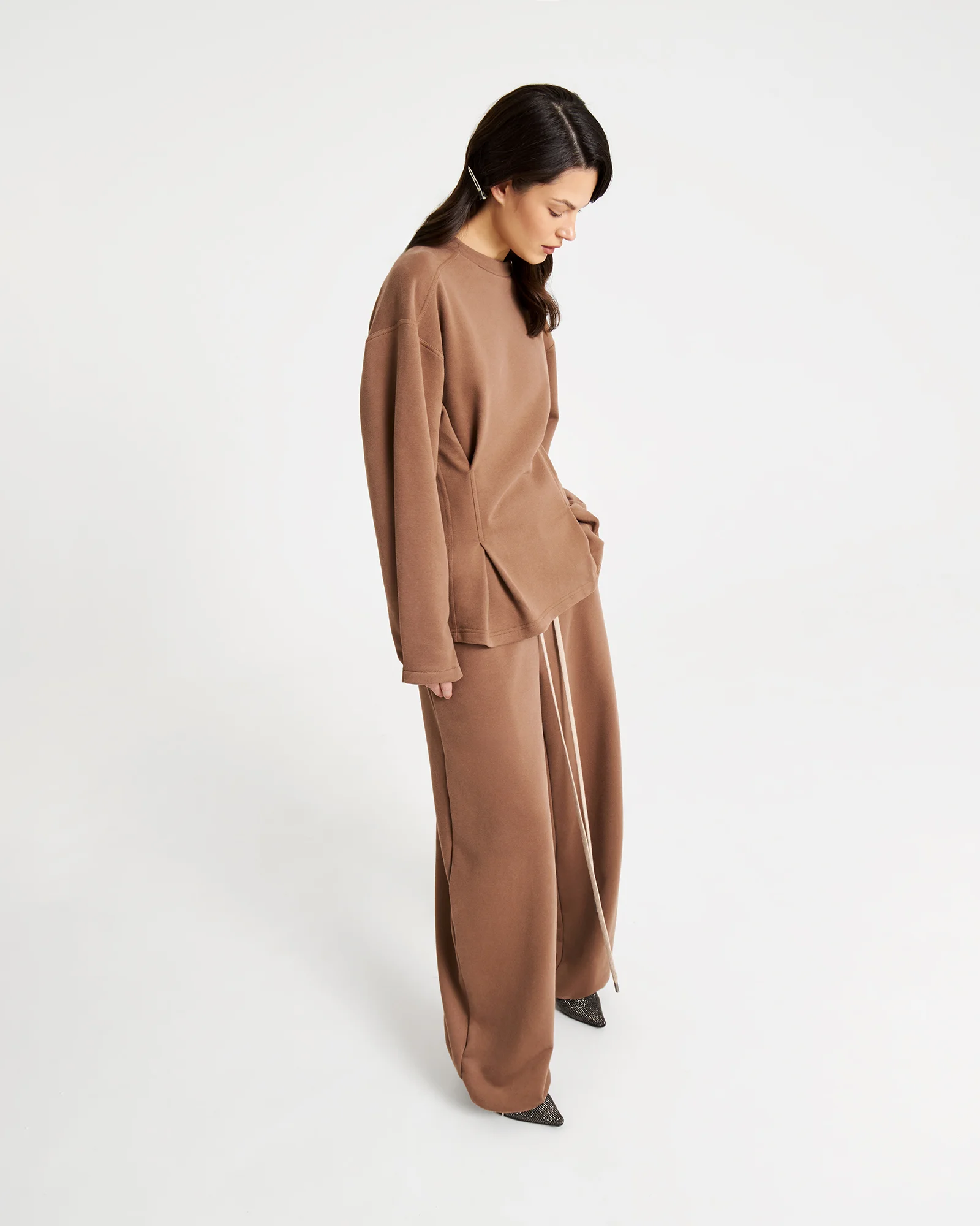Брюки с эффектом велюра — это стильная и комфортная модель для создания модных образов. Нейтральный коричневый цвет позволяет сочетать их с различными элементами гардероба. Брюки идеально подойдут для повседневного ношения, добавляя образу элегантность и уют.