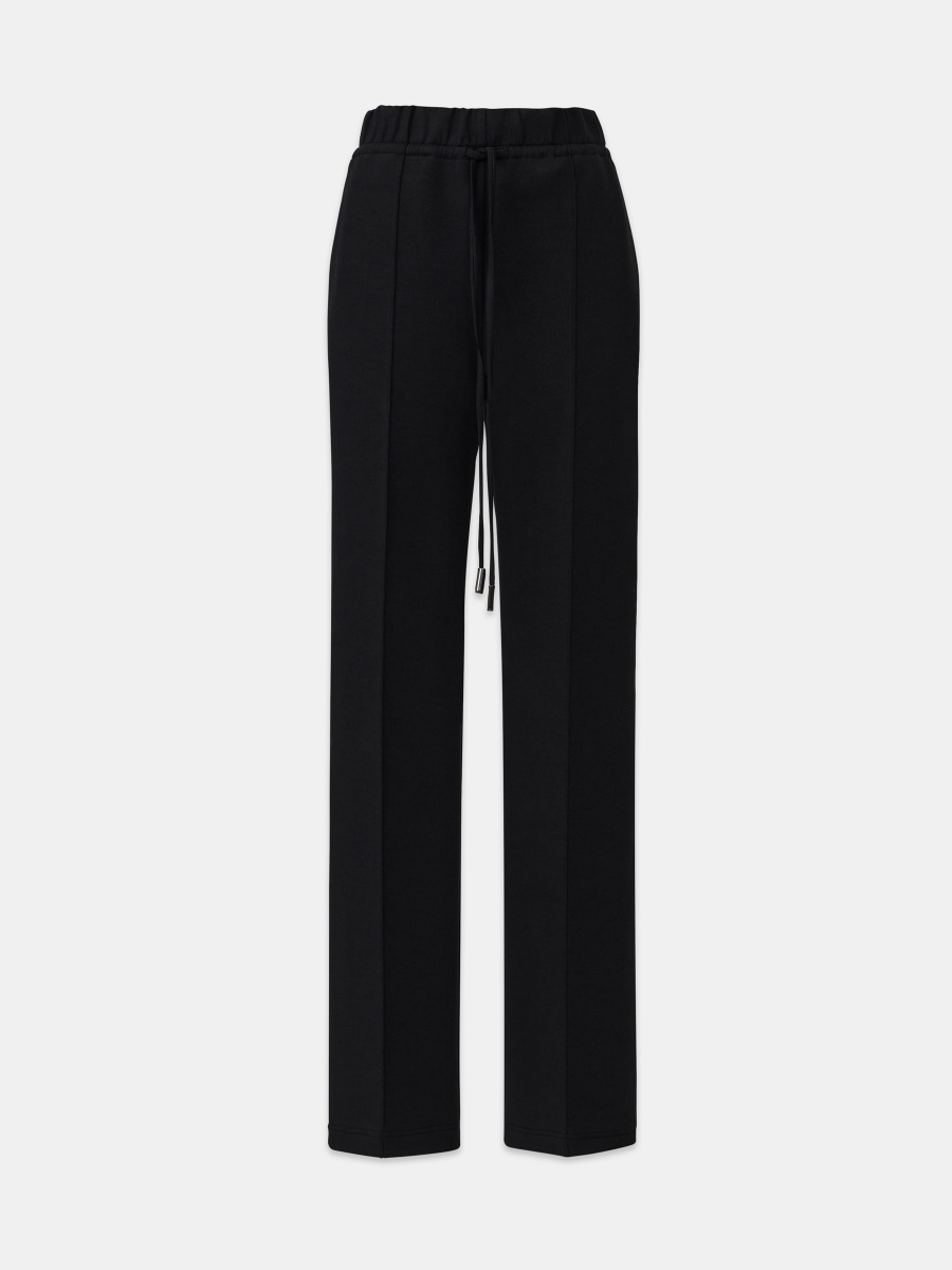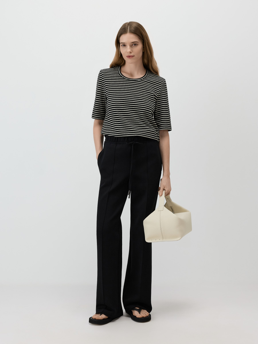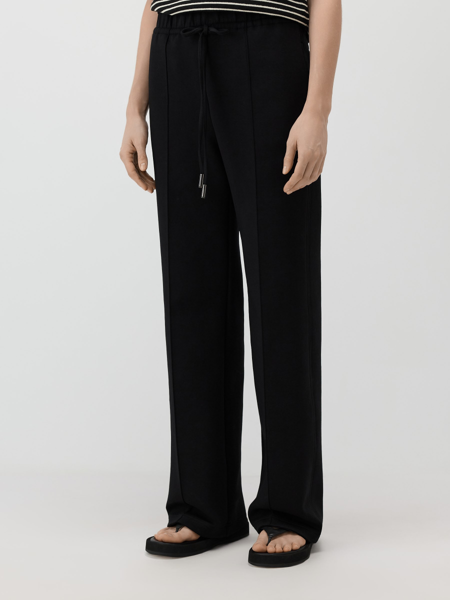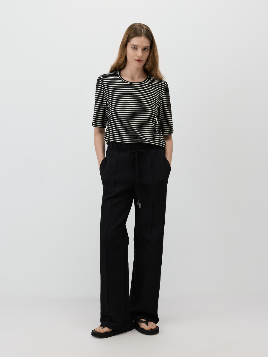 Прямые свободные брюки из мягкого неофутера на основе хлопка. Эластичный пояс со шнуром позволяет легко регулировать посадку. Модель сочетает комфорт спортивного стиля и эстетику классической посадки — по передней части проходят застроченные стрелки. Изделие хорошо держит форму и создает аккуратный силуэт. В боковых швах — потайные карманы, на спинке — имитация карманов.