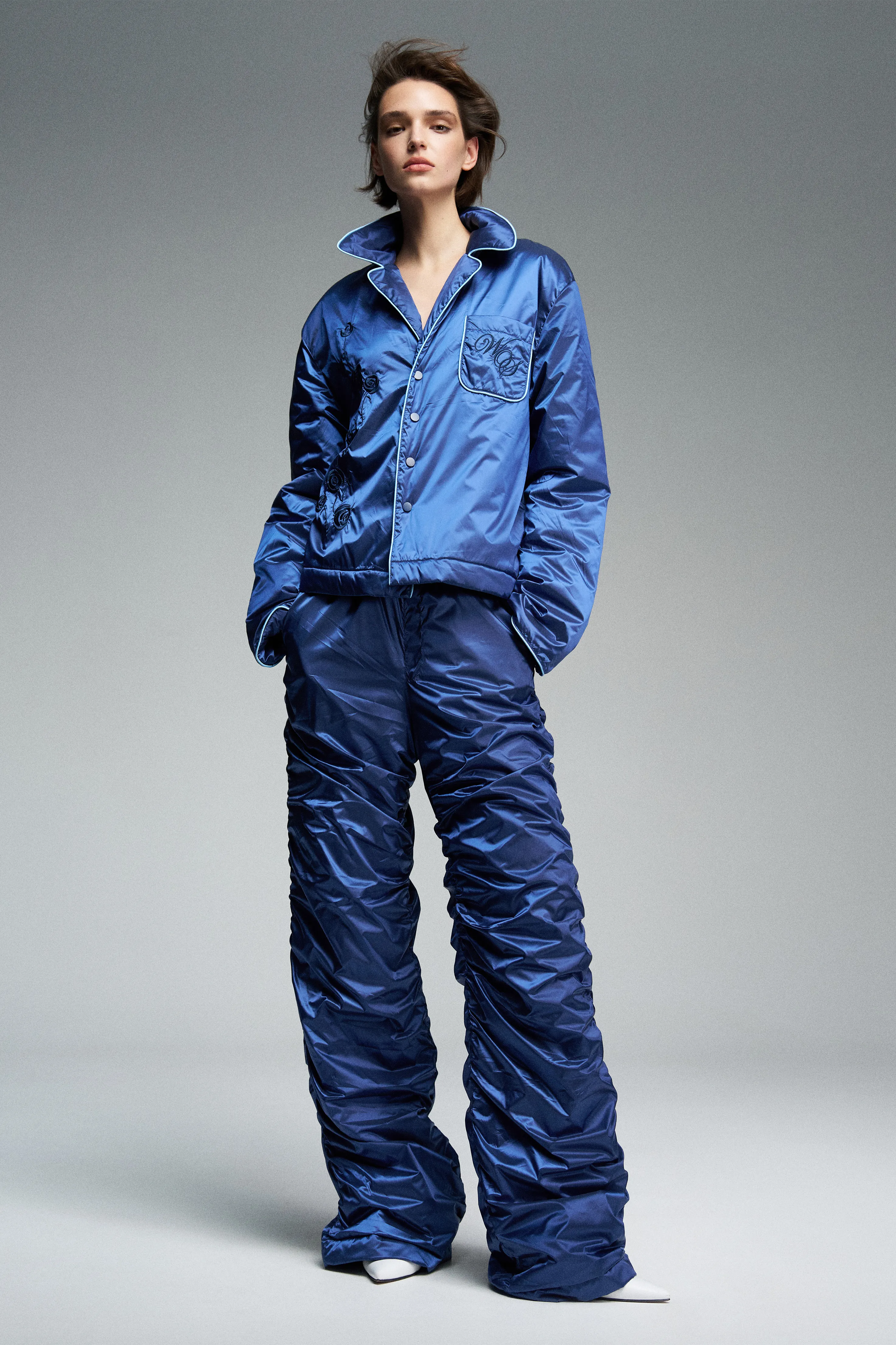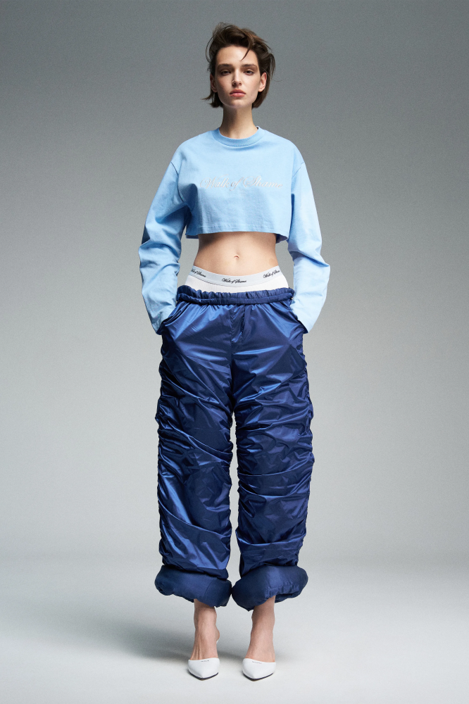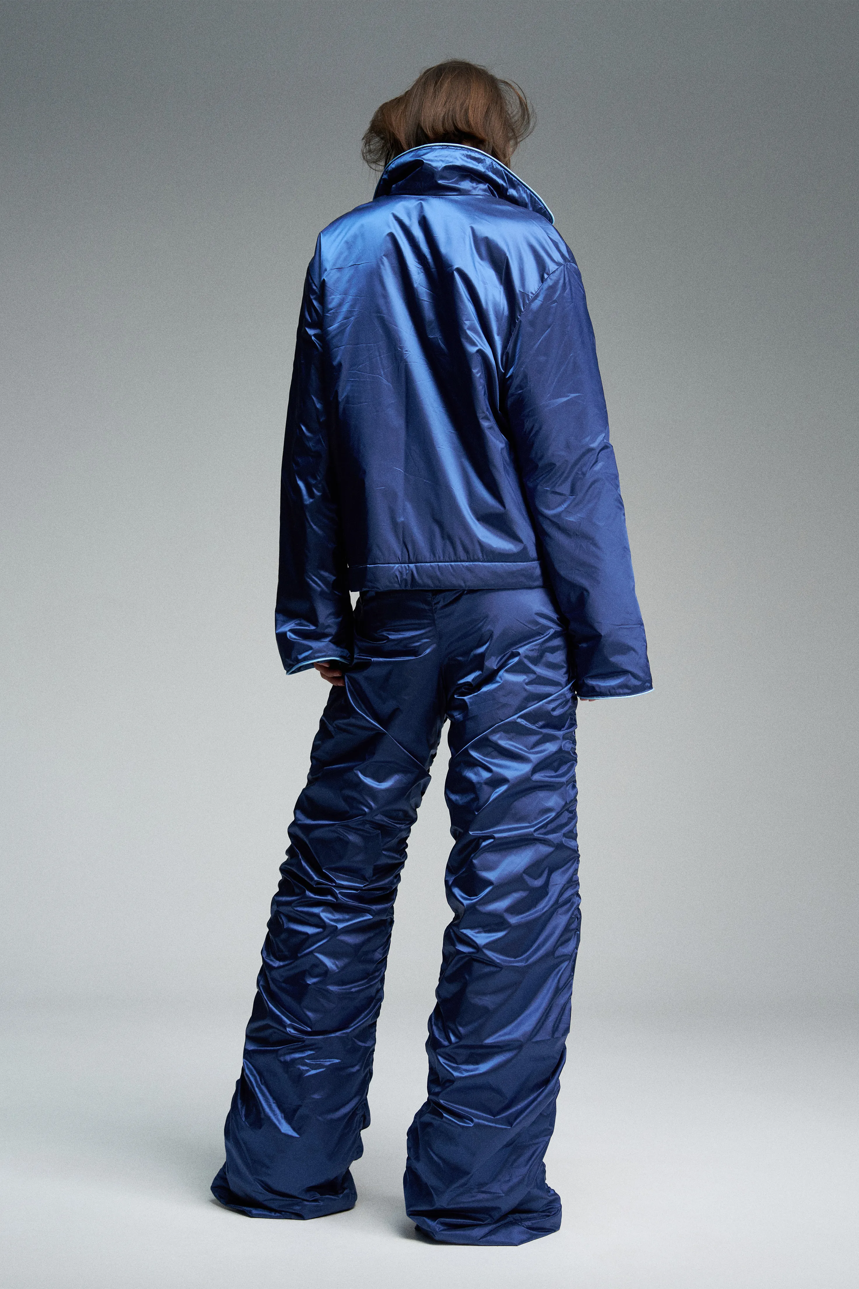 Дутые штаны с шелковым наполнителем, поддерживающим комфортную температуру тела. Сборка по бокам штанин и эластичный пояс обеспечивают удобную посадку.