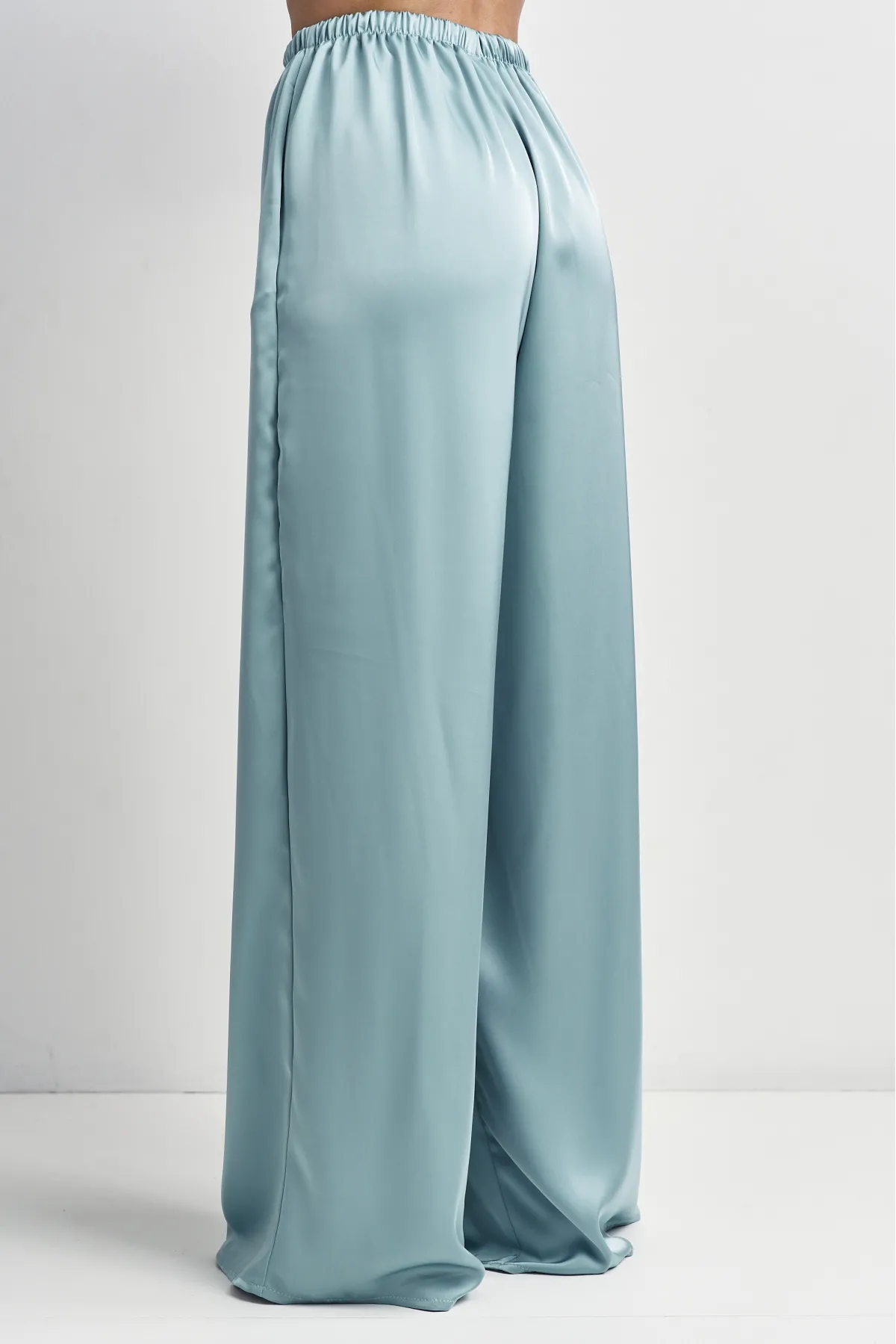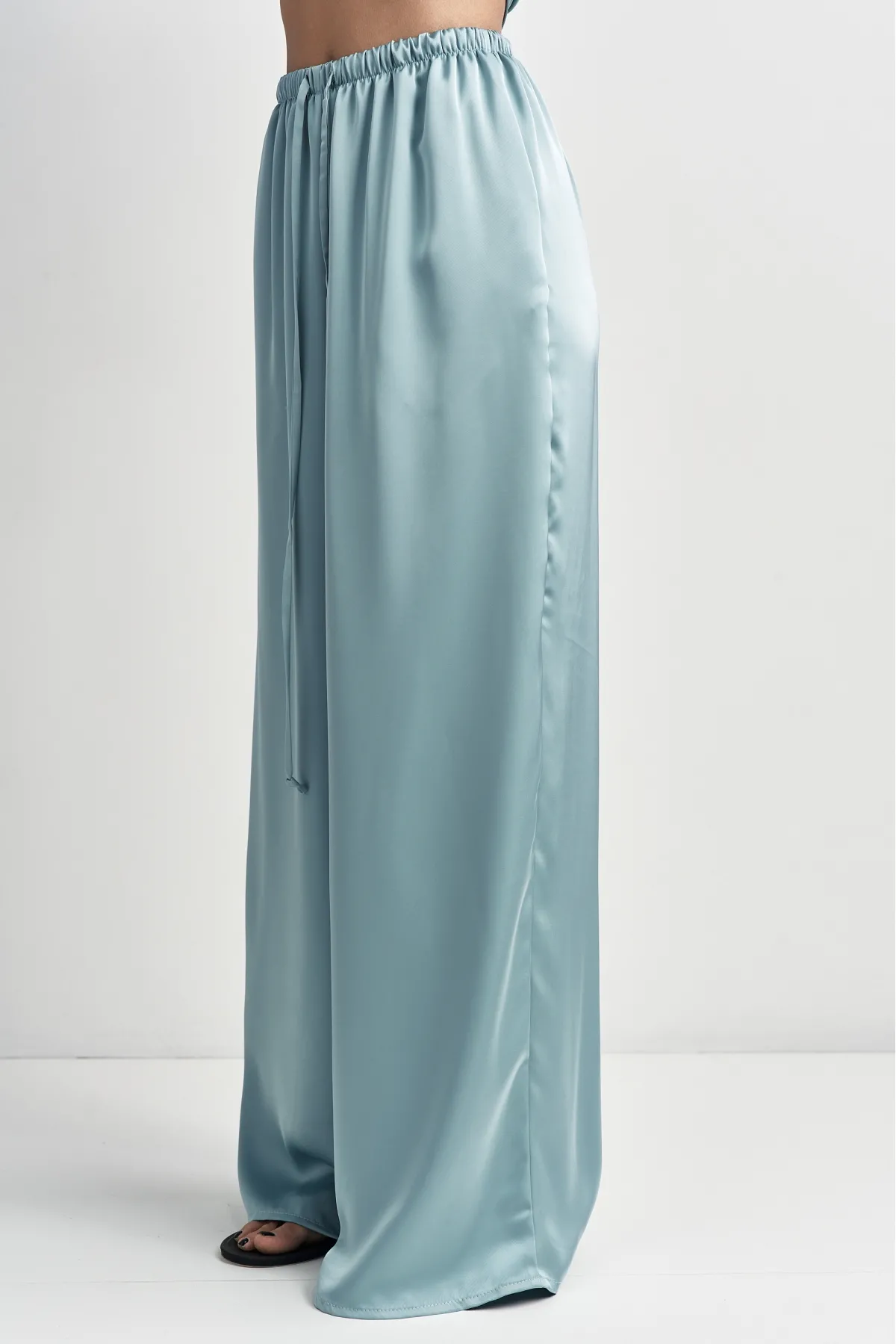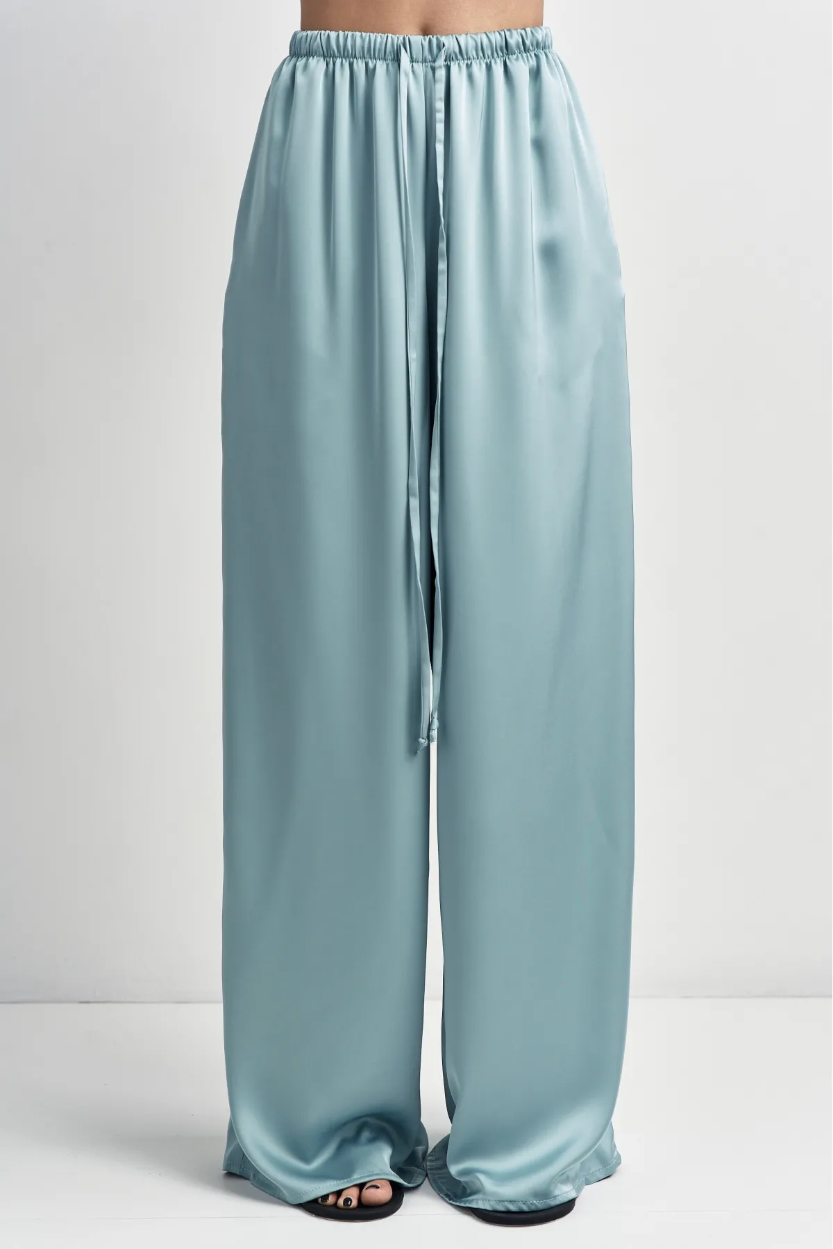 Широкий силуэт и гладкий блеск атласа создают легкий и расслабленный образ. Аккуратная линия талии с узкой резинкой и регулируемым шнурком обеспечивает посадку и свободу движений, а практичные карманы делают брюки удобными в повседневной носке. Носите как комплект с атласным топом, с лёгким трикотажем или с расслабленной футболкой для более повседневного образа.