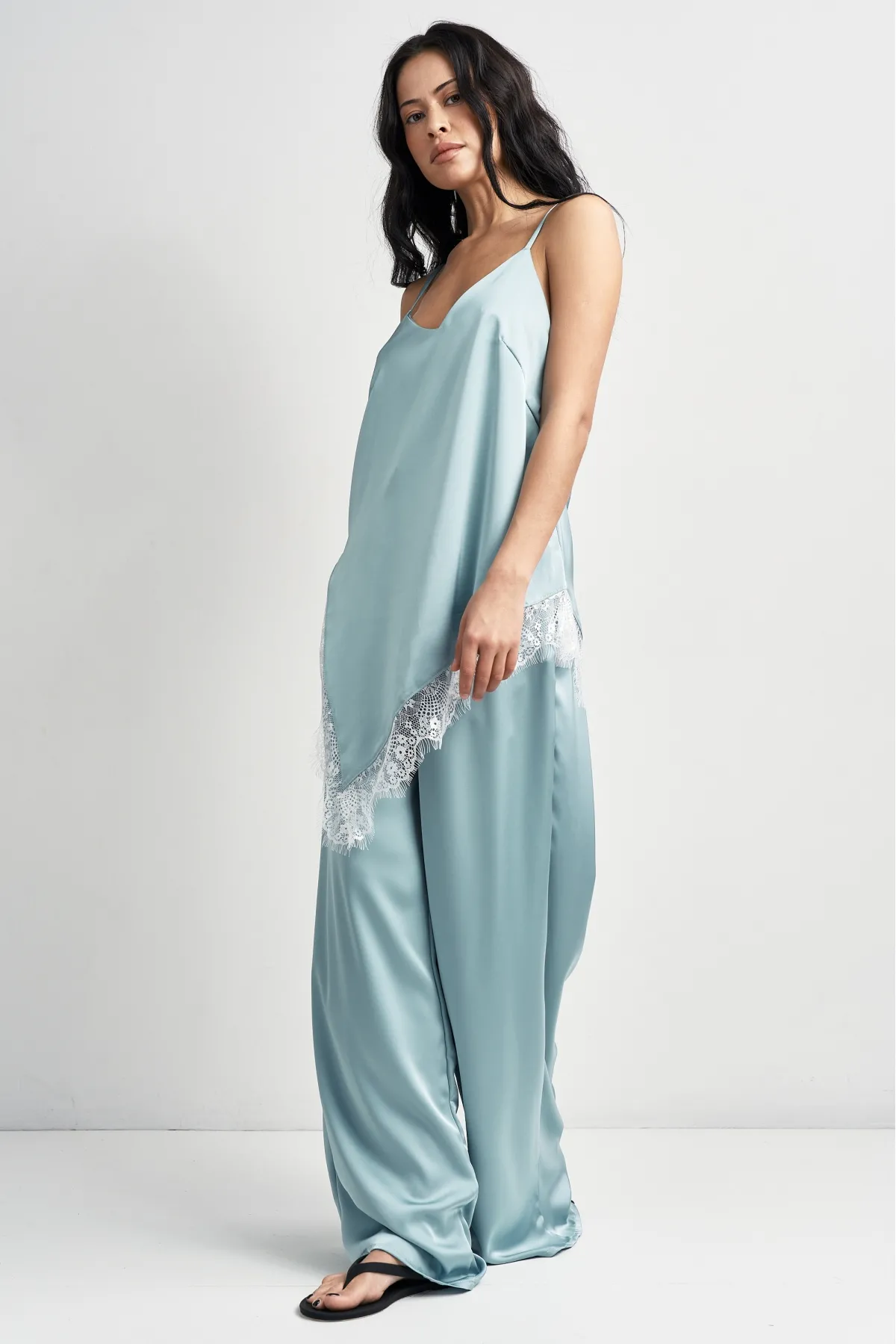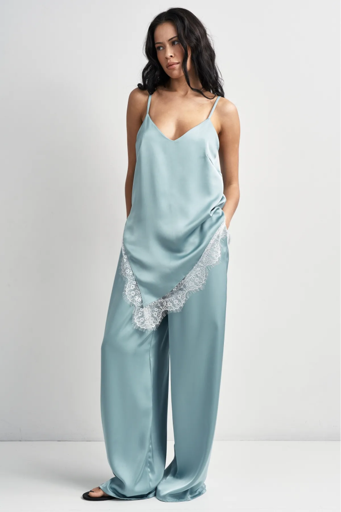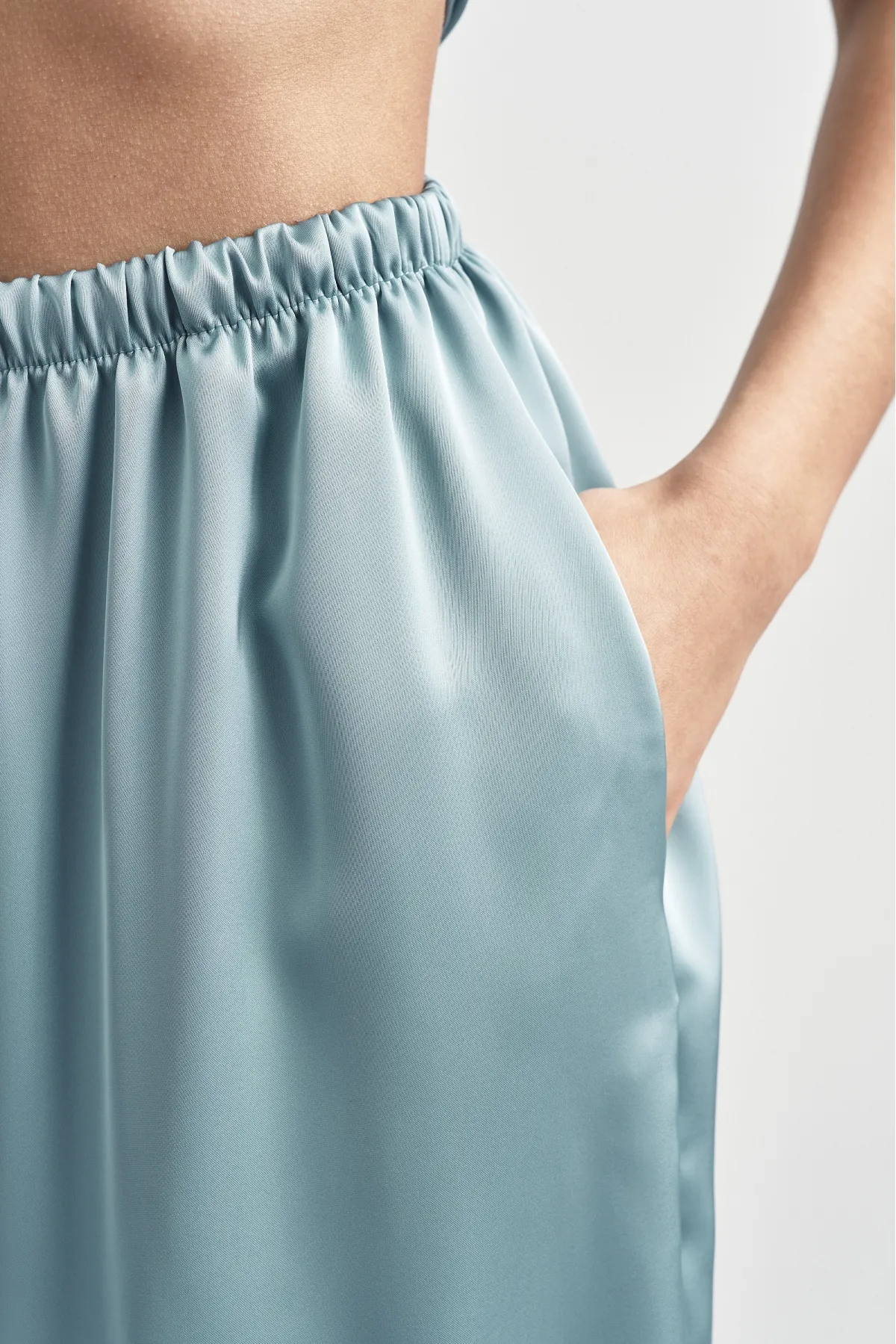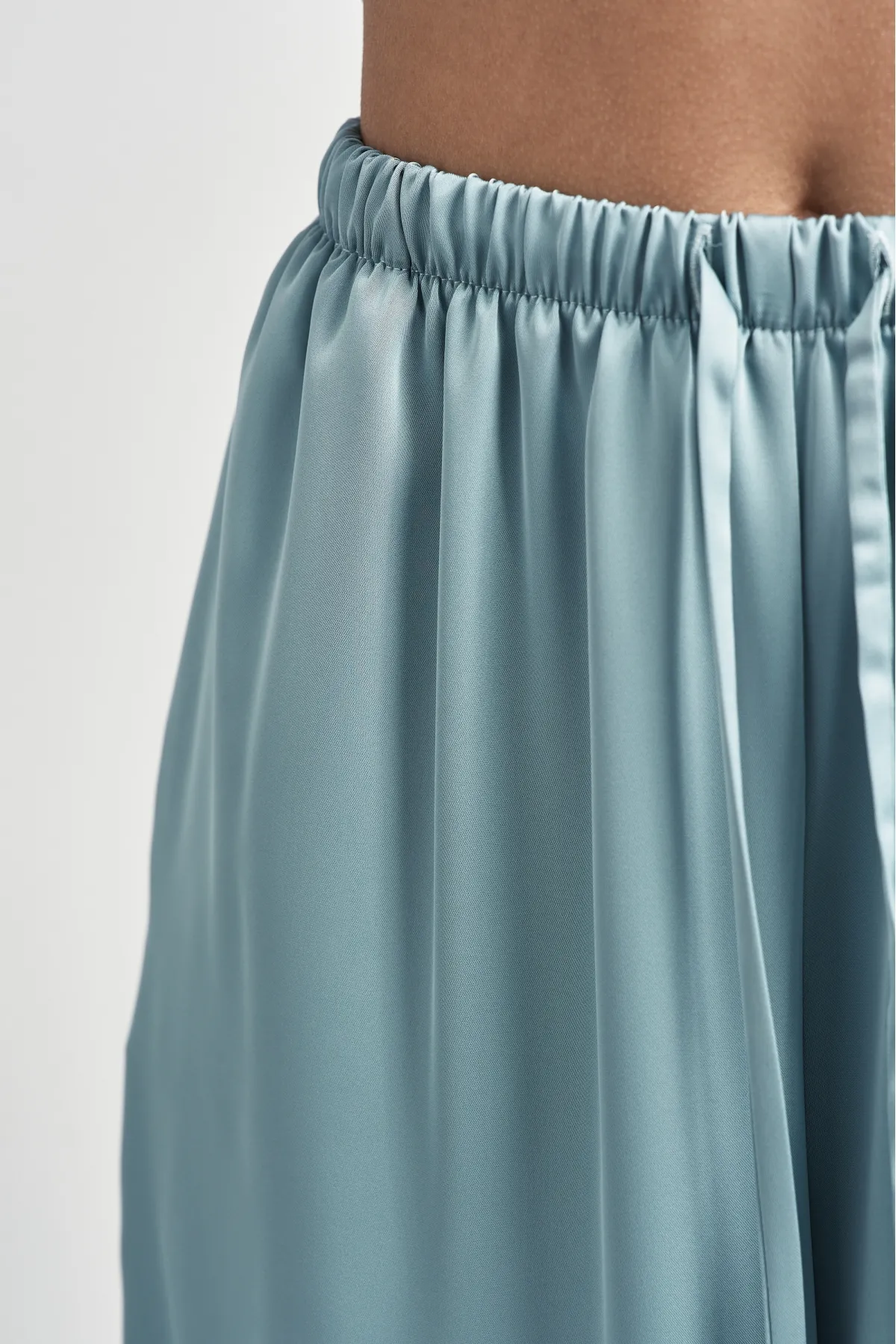 Широкий силуэт и гладкий блеск атласа создают легкий и расслабленный образ. Аккуратная линия талии с узкой резинкой и регулируемым шнурком обеспечивает посадку и свободу движений, а практичные карманы делают брюки удобными в повседневной носке. Носите как комплект с атласным топом, с лёгким трикотажем или с расслабленной футболкой для более повседневного образа.
