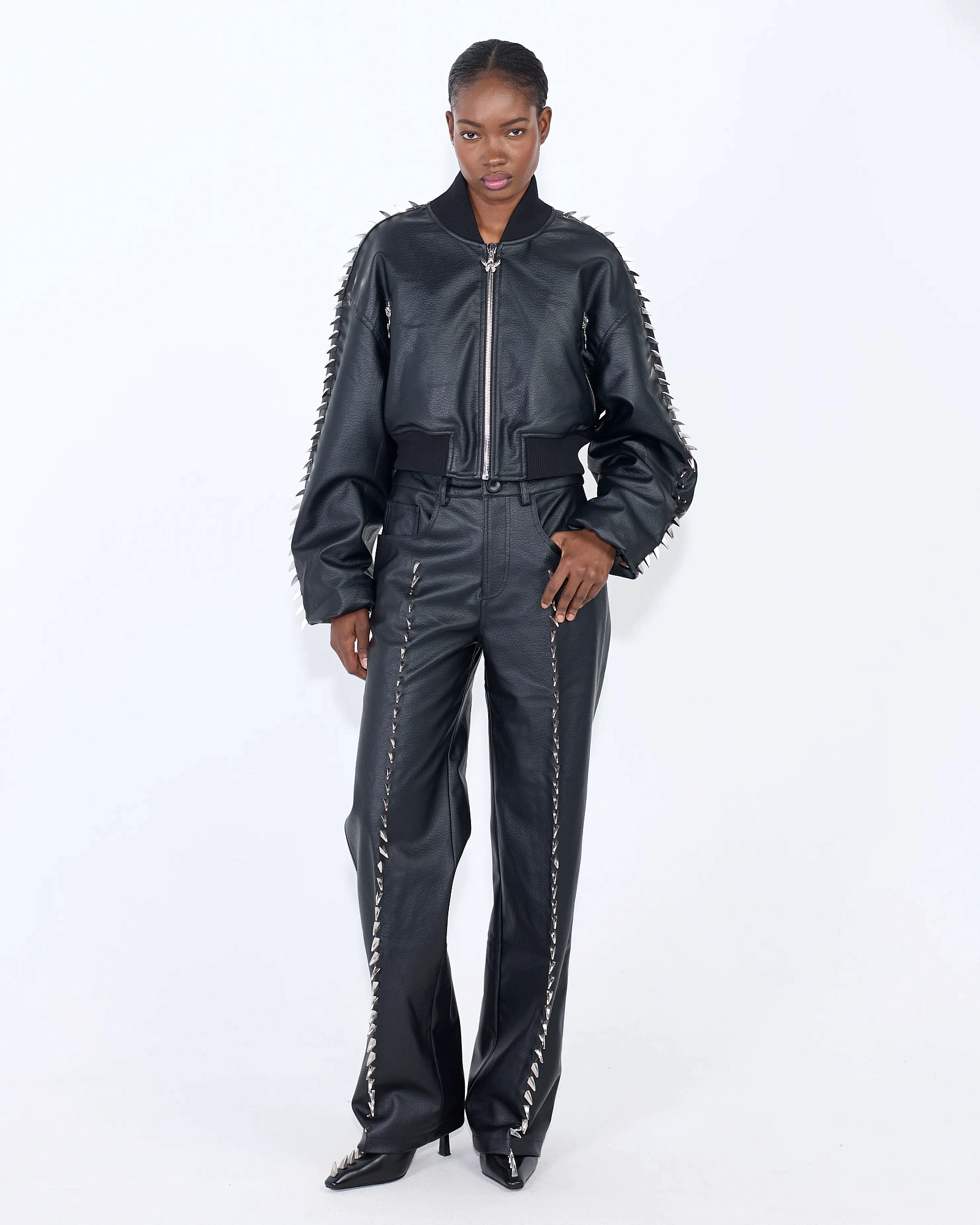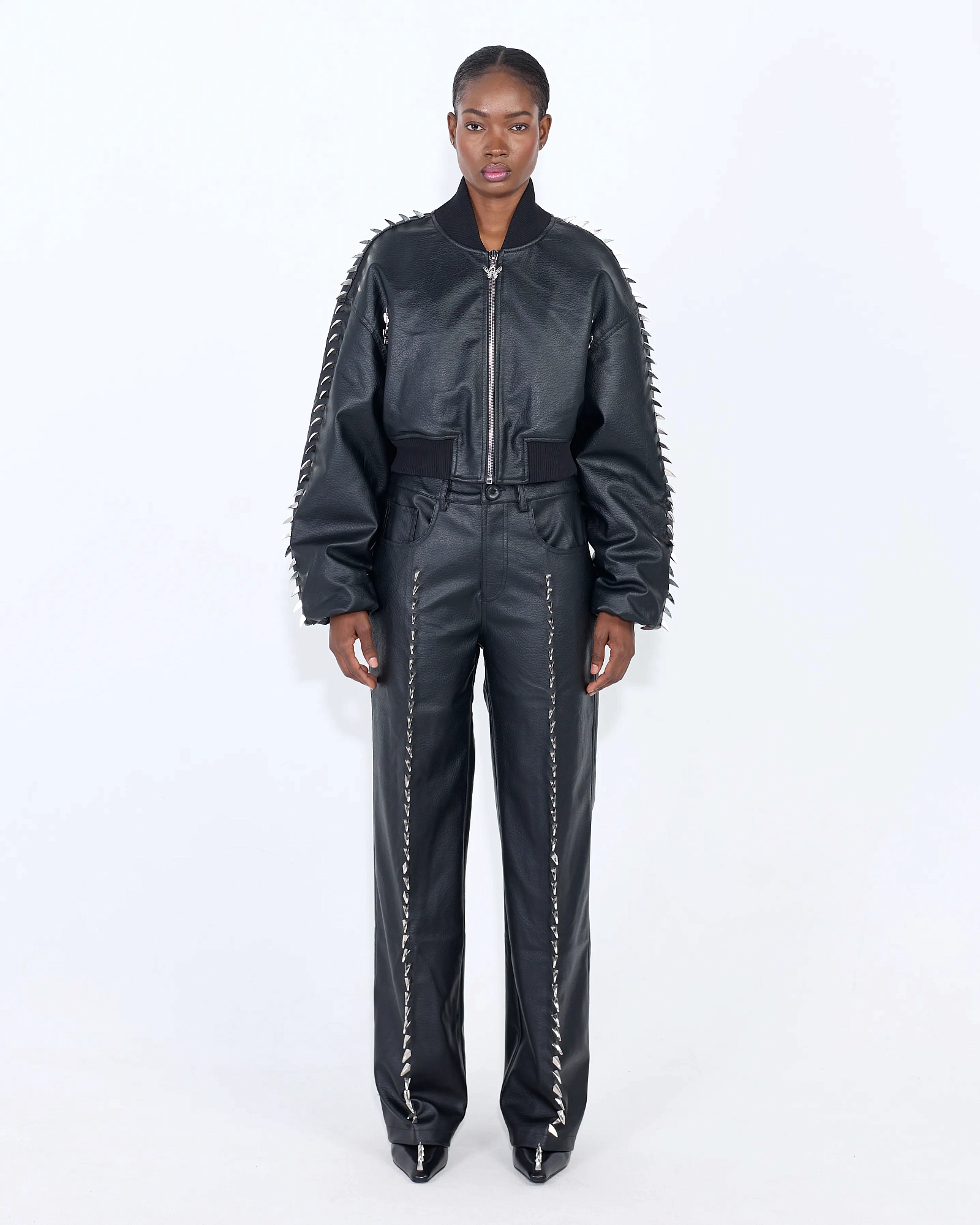 Брюки из плотной фактурной экокожи прямого кроя. Модель на средней посадке прямого кроя дополнена декоративными металлическими шипами вдоль передних швов в виде когтей, создающими четкий вертикальный акцент. Материал держит форму и подчёркивает силуэт.