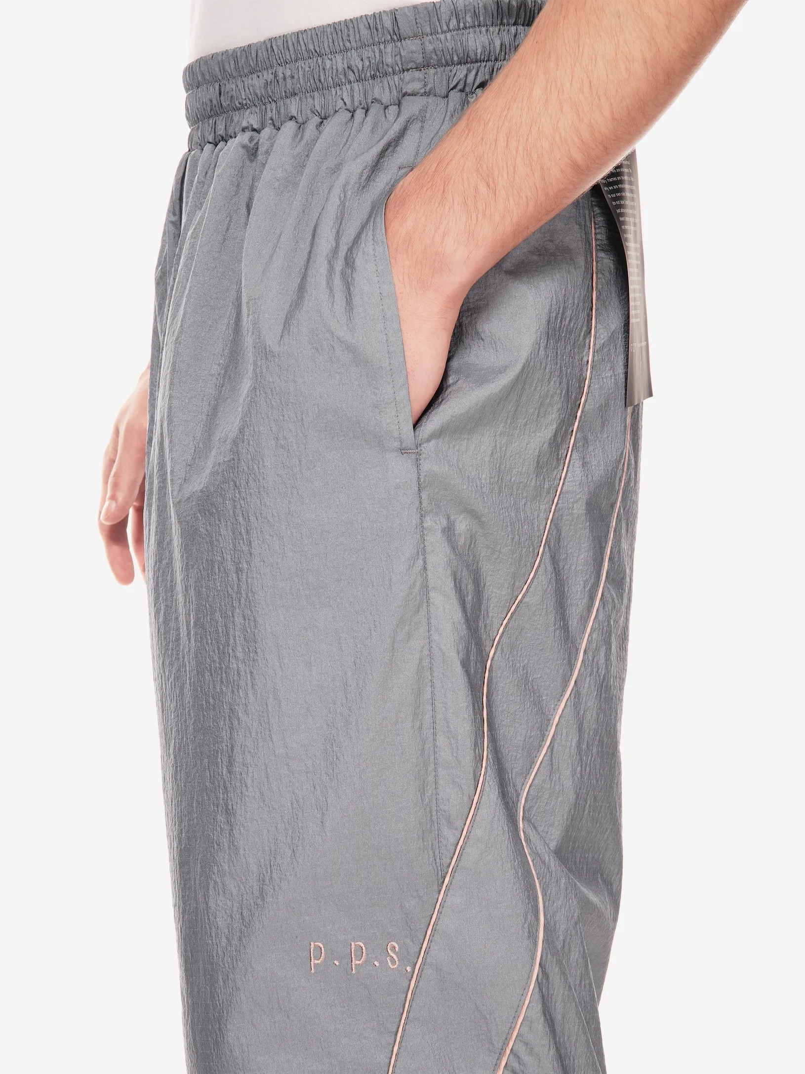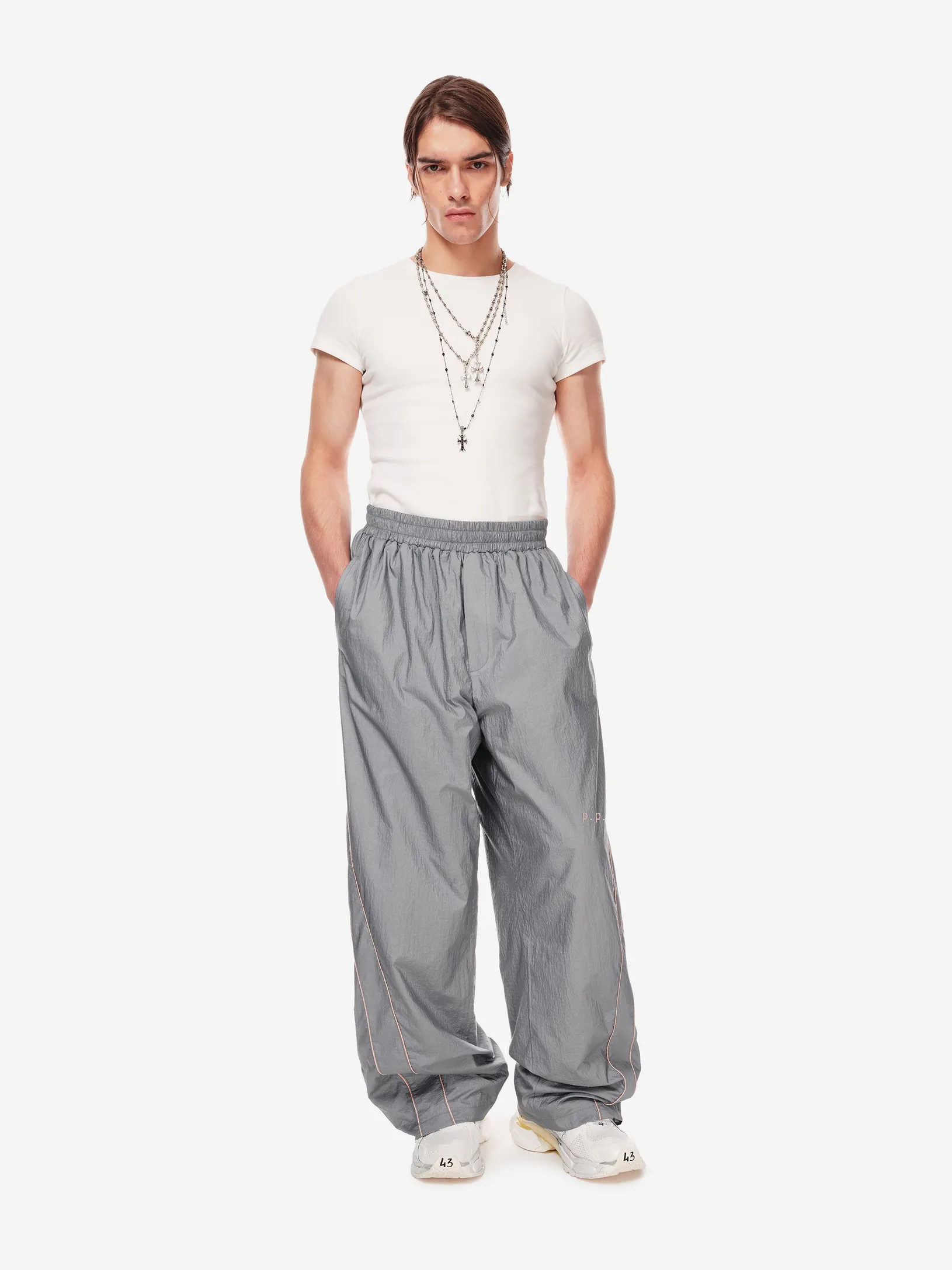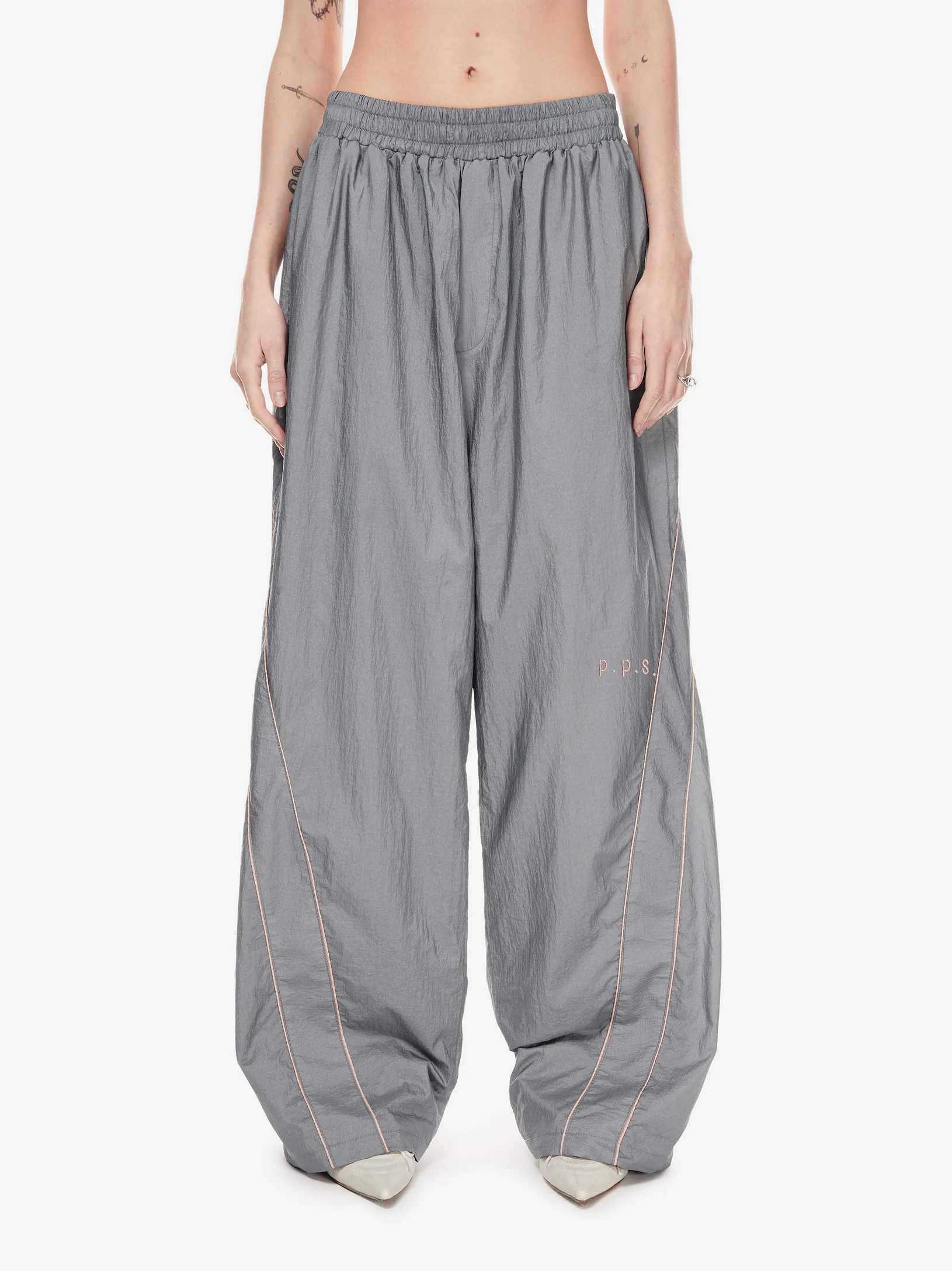 Брюки Loop Comfy: широкий крой, контрастные вставки, регулируемый низ. фирменные детали — вышитые скобки и патч-манифест. новый код в коллекции от post post scriptum.