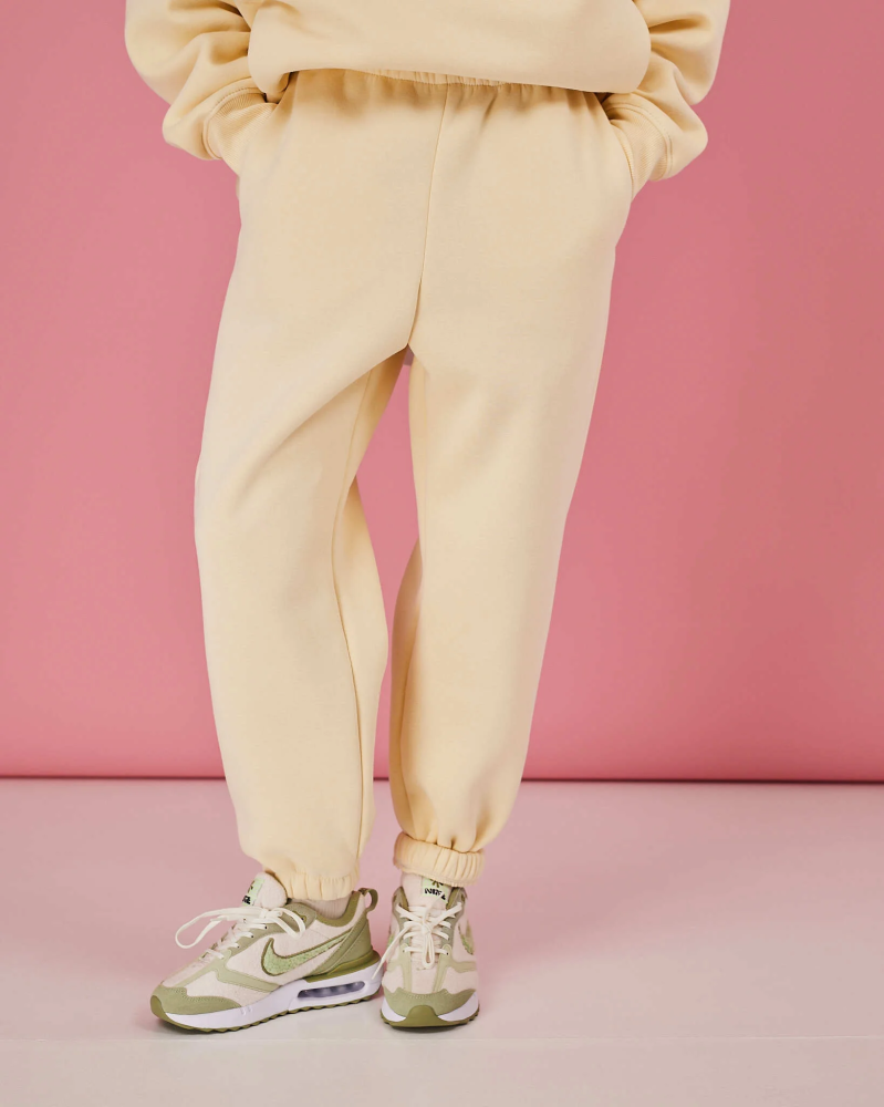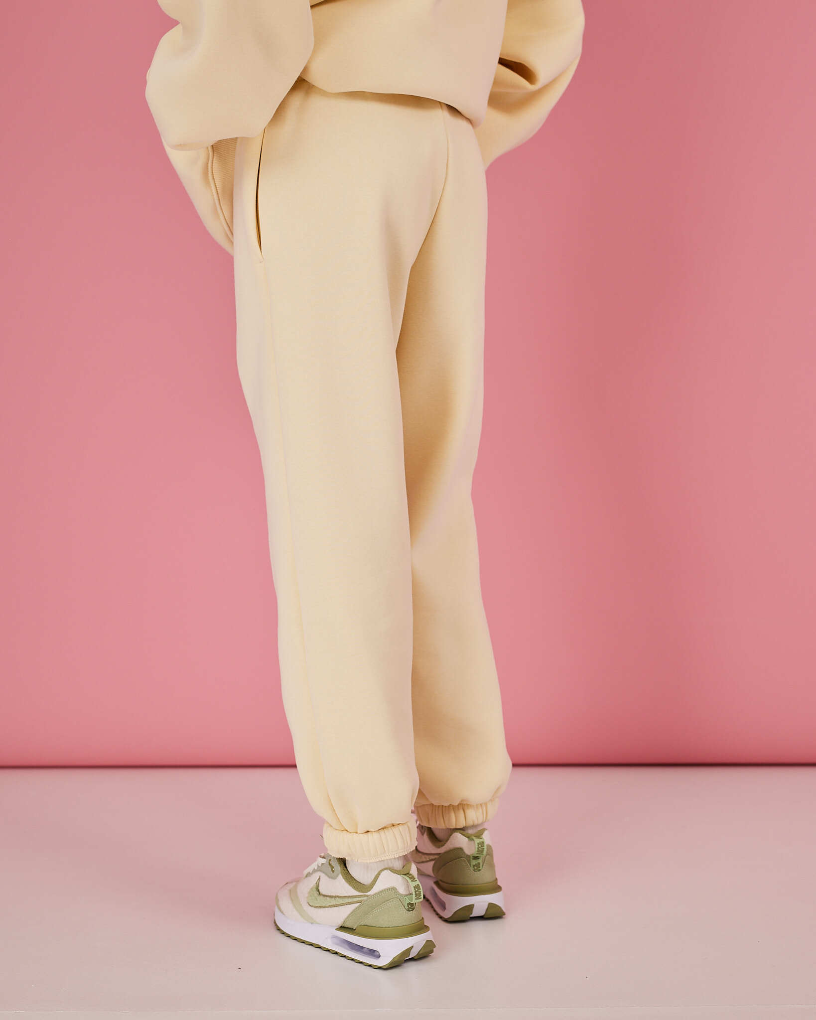 Джоггеры выполнены из плотного петельного футера с эффектом велюра высшего качества. Обратите внимание, что оттенок изделия не совпадает табухами аналогичного цвета из КАПСУЛЫ.