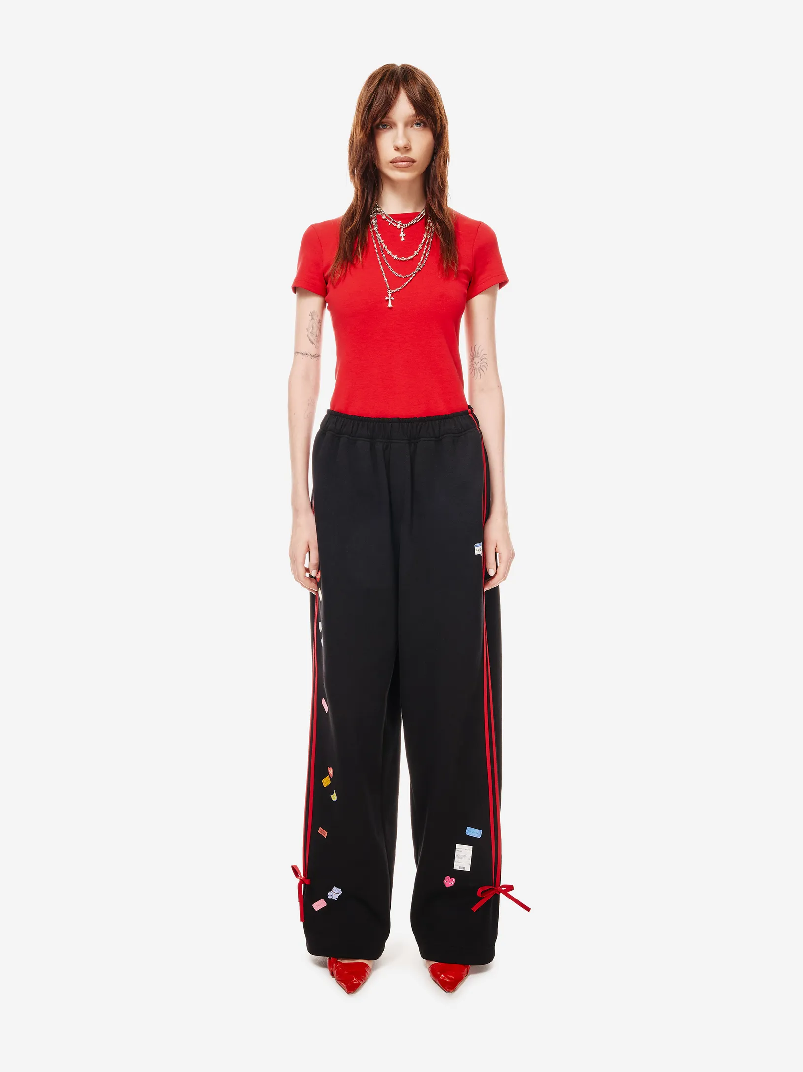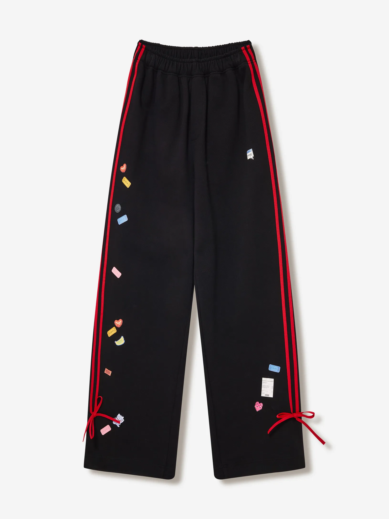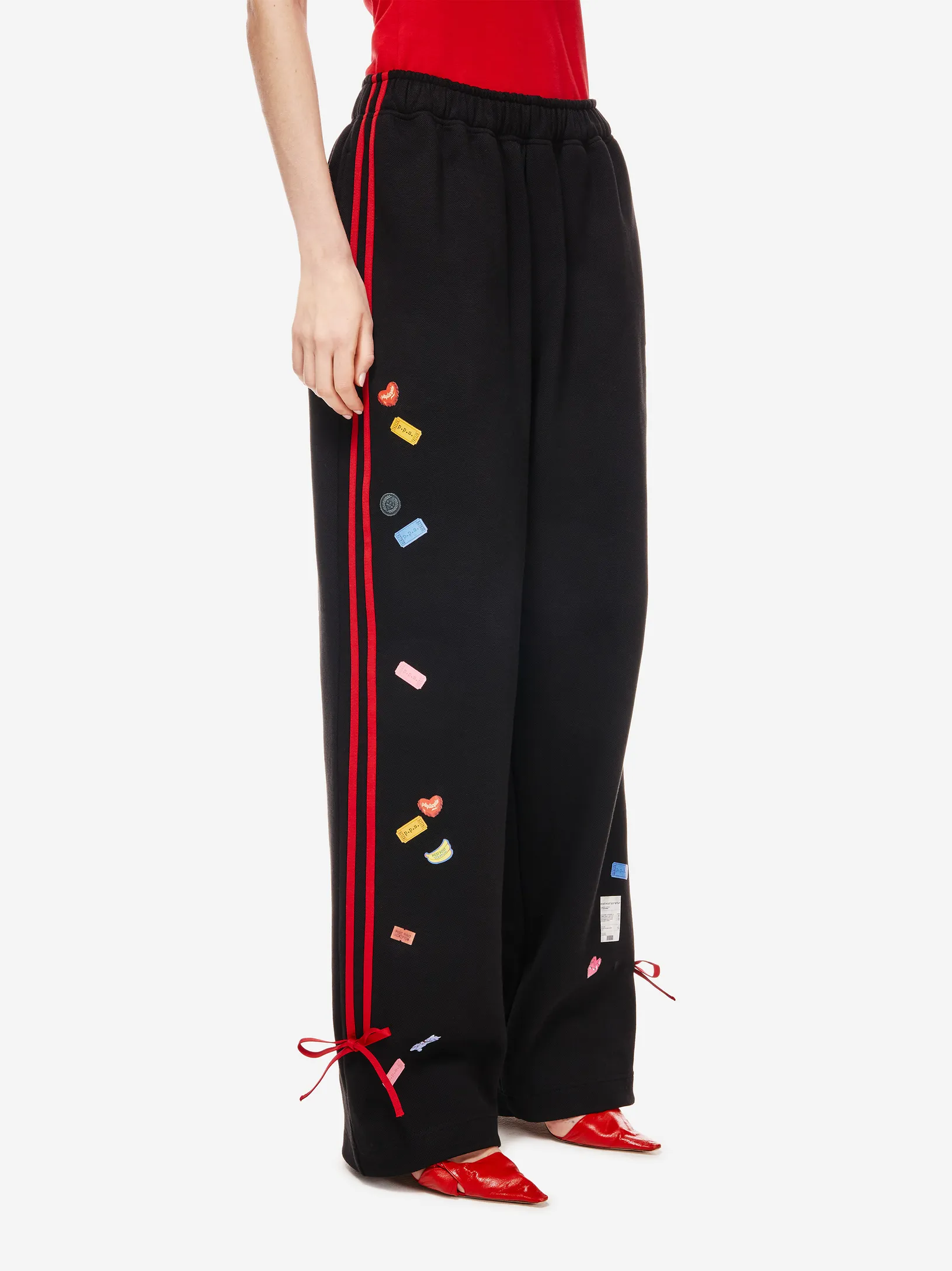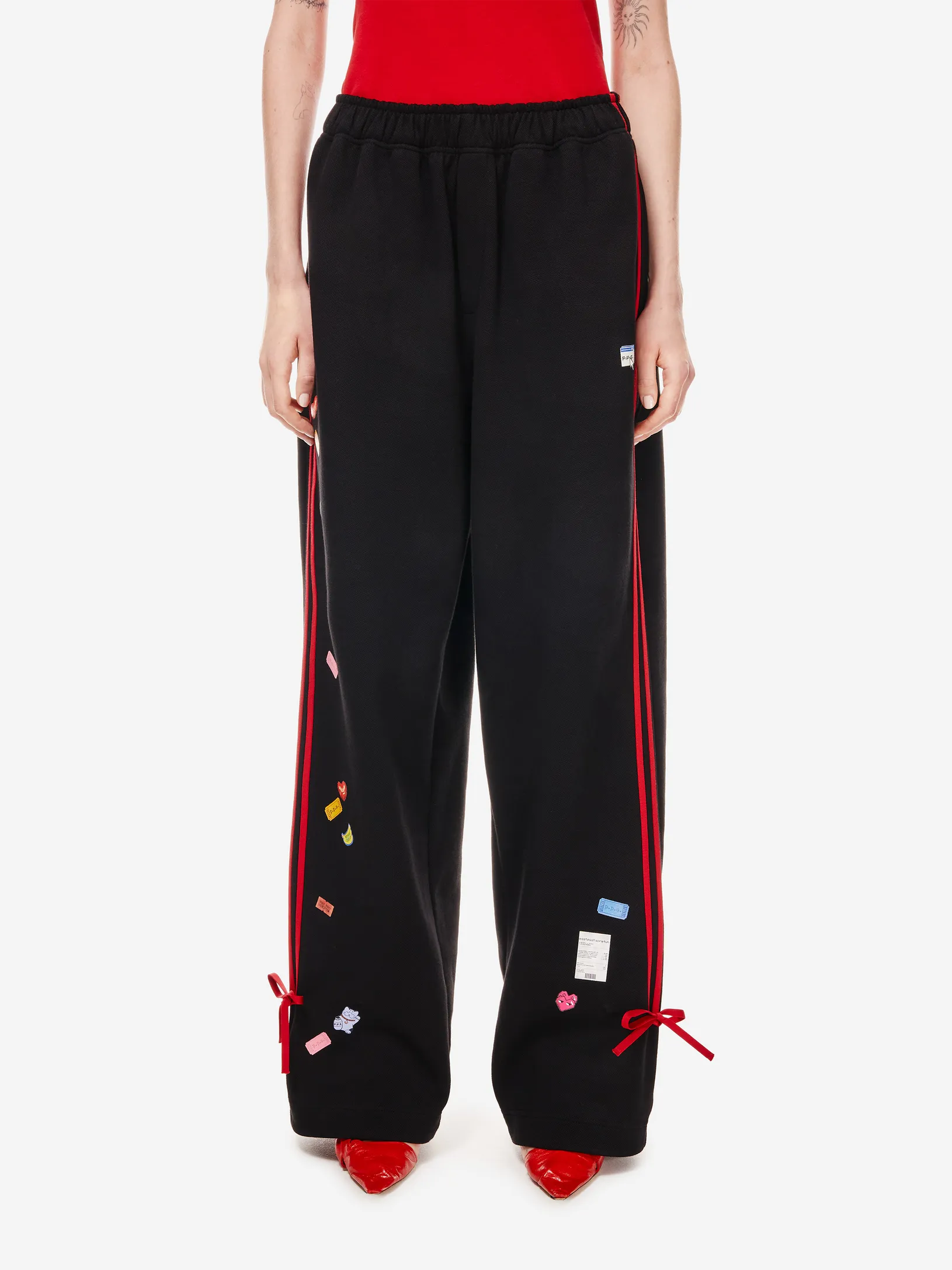 При пошиве брюк свободного кроя с широким эластичным поясом взяли мягкий хлопок. модель объединила в себе спортивные элементы в виде контрастных лампасов по бокам и легкую романтичность, которую обеспечили бантики снизу. левую брючину украсили небольшой контрастной вышивкой с логотипом бренда.