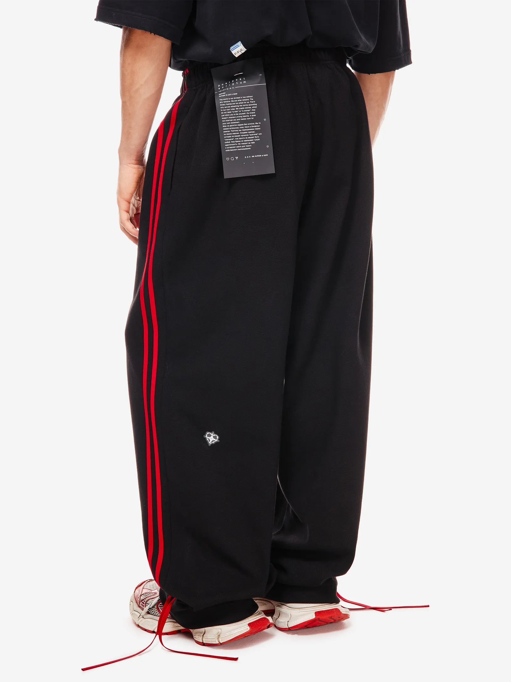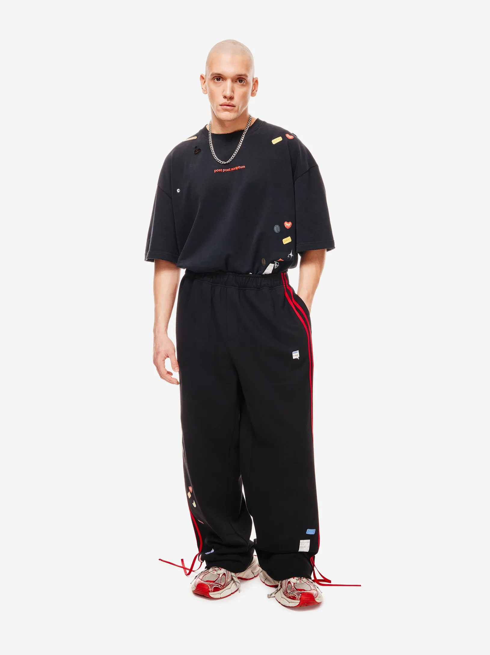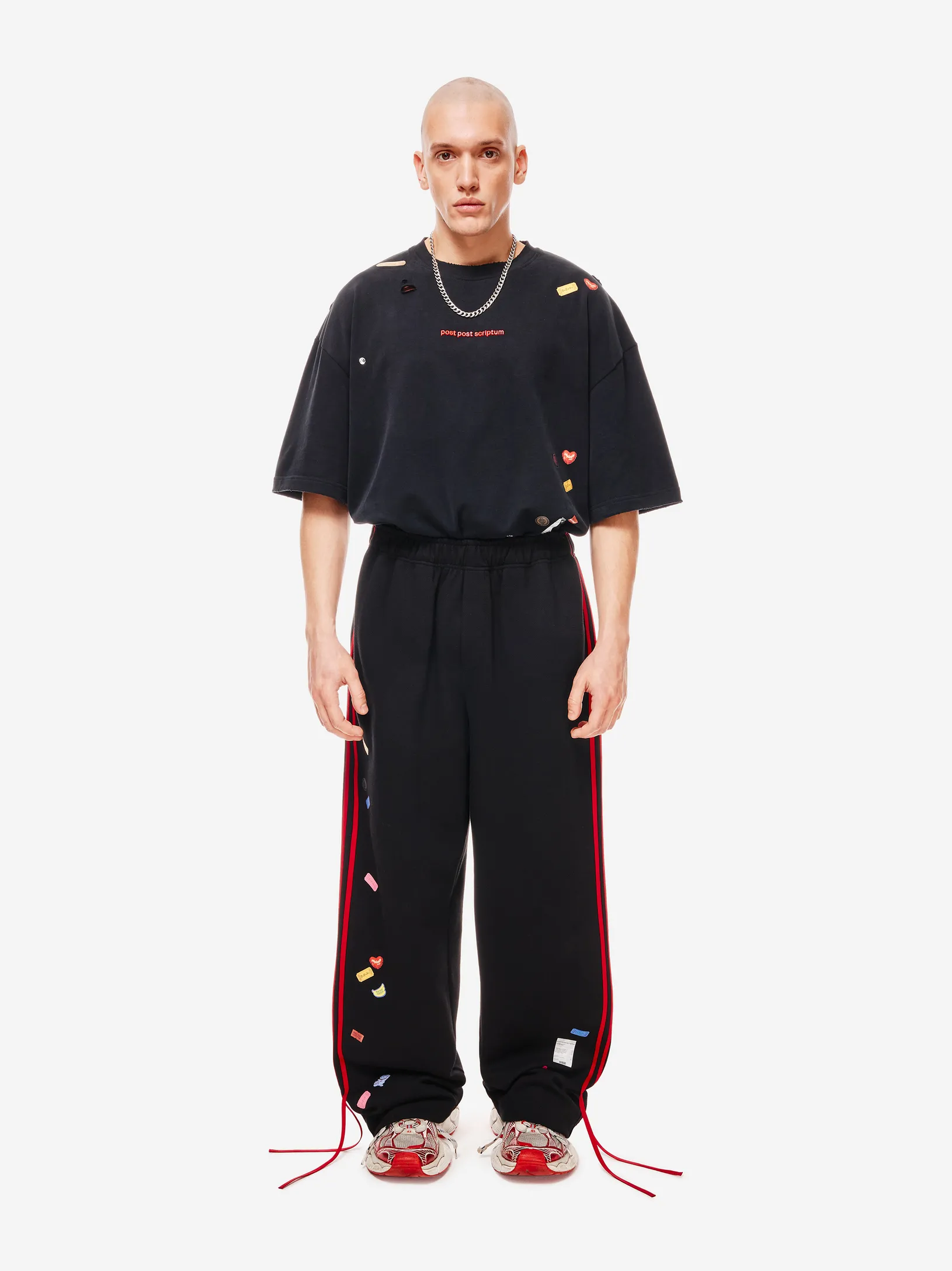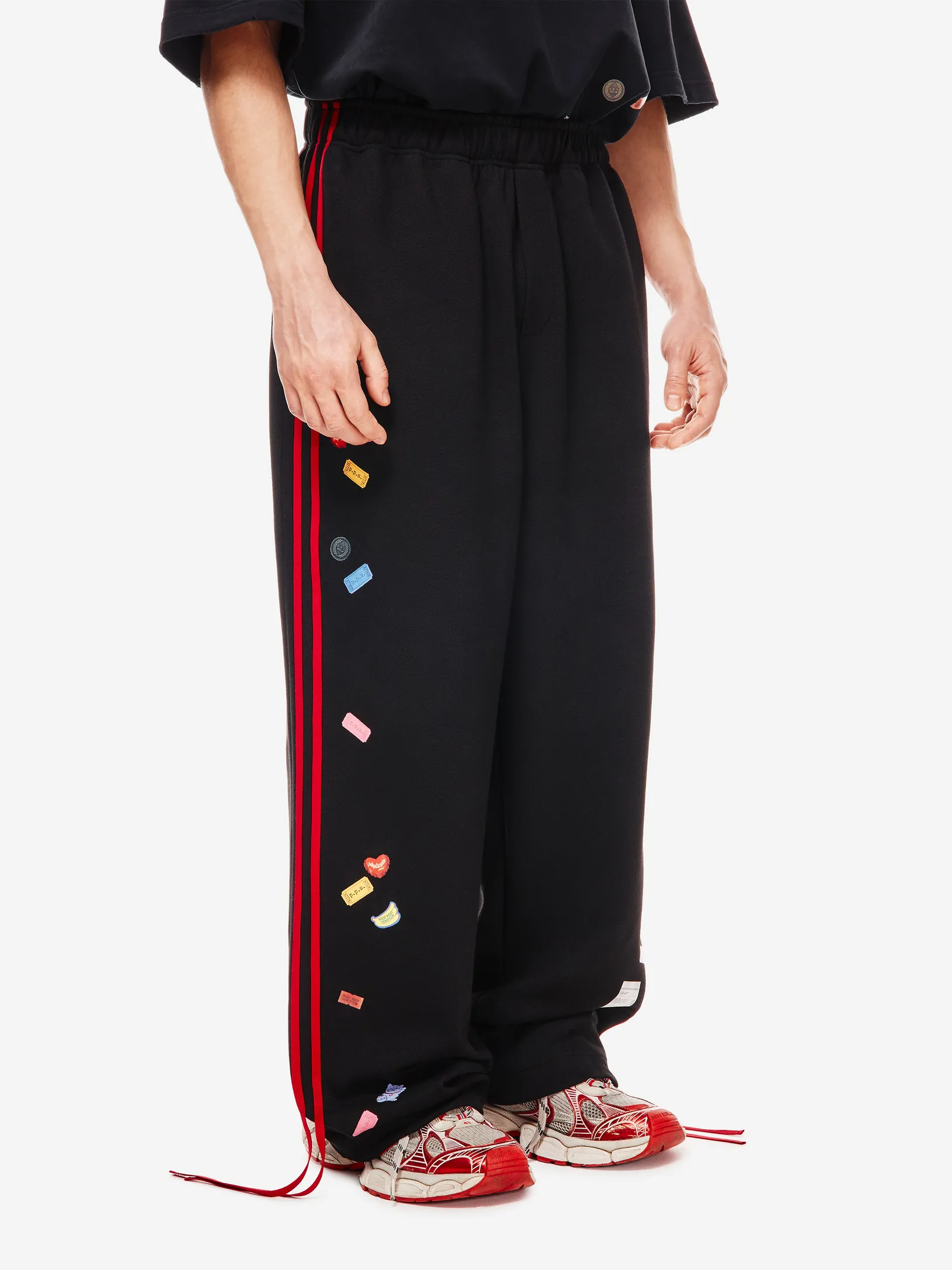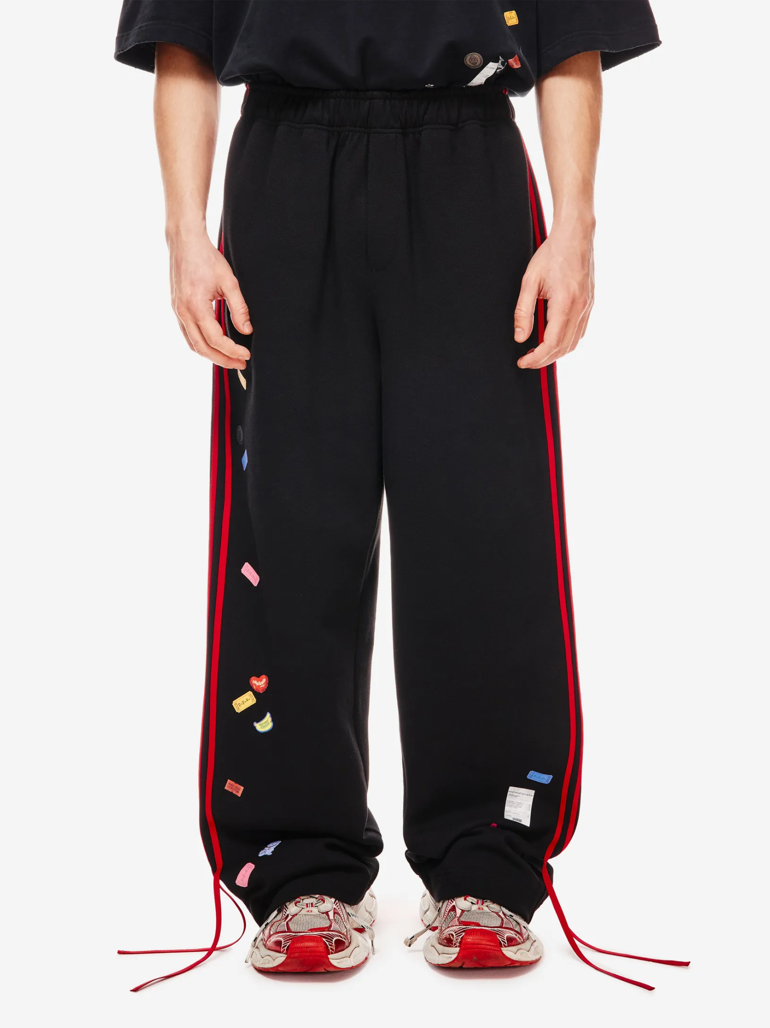 При пошиве брюк свободного кроя с широким эластичным поясом взяли мягкий хлопок. модель объединила в себе спортивные элементы в виде контрастных лампасов по бокам и легкую романтичность, которую обеспечили бантики снизу. левую брючину украсили небольшой контрастной вышивкой с логотипом бренда.