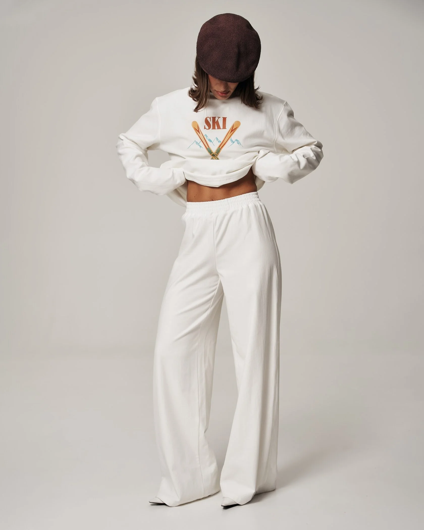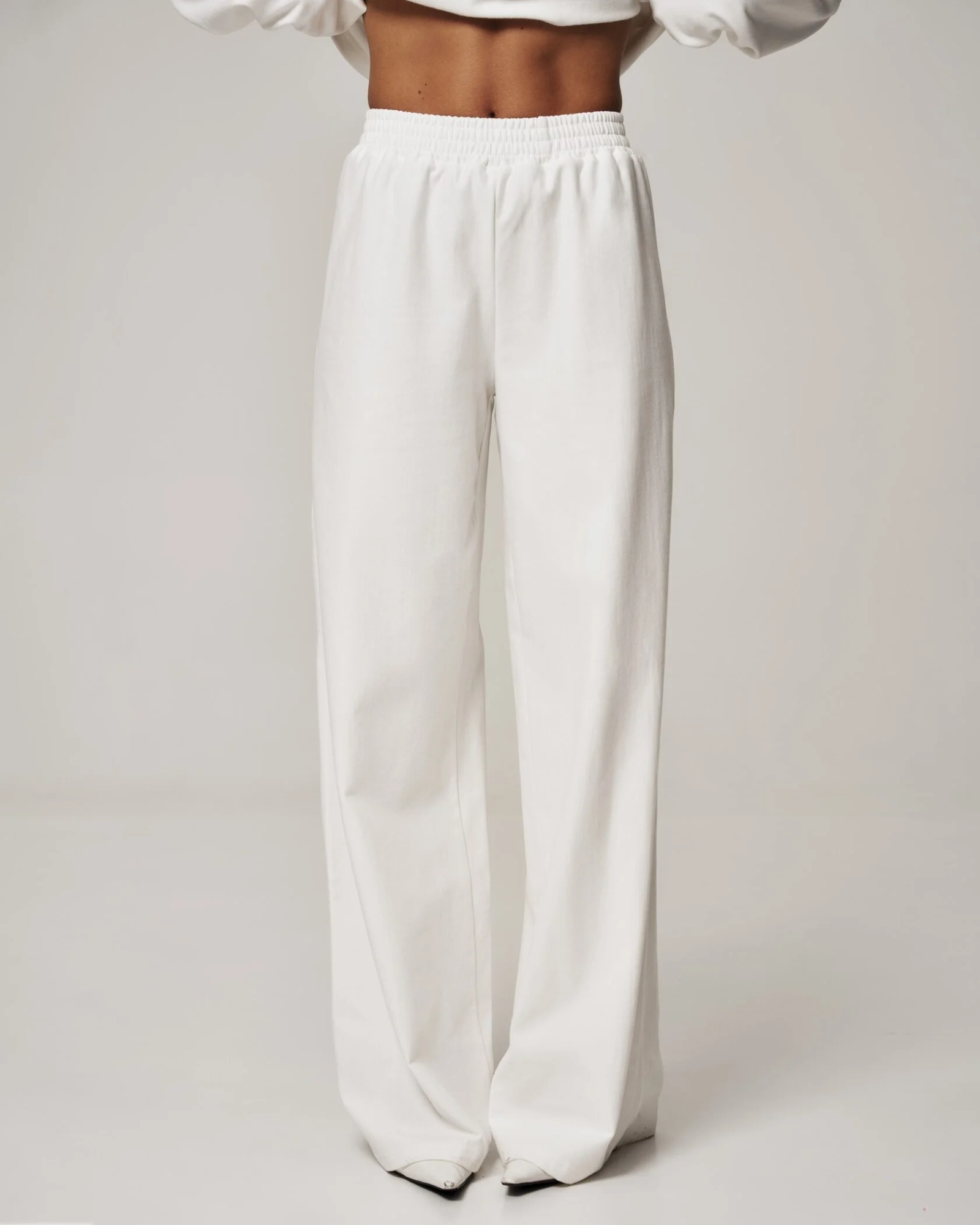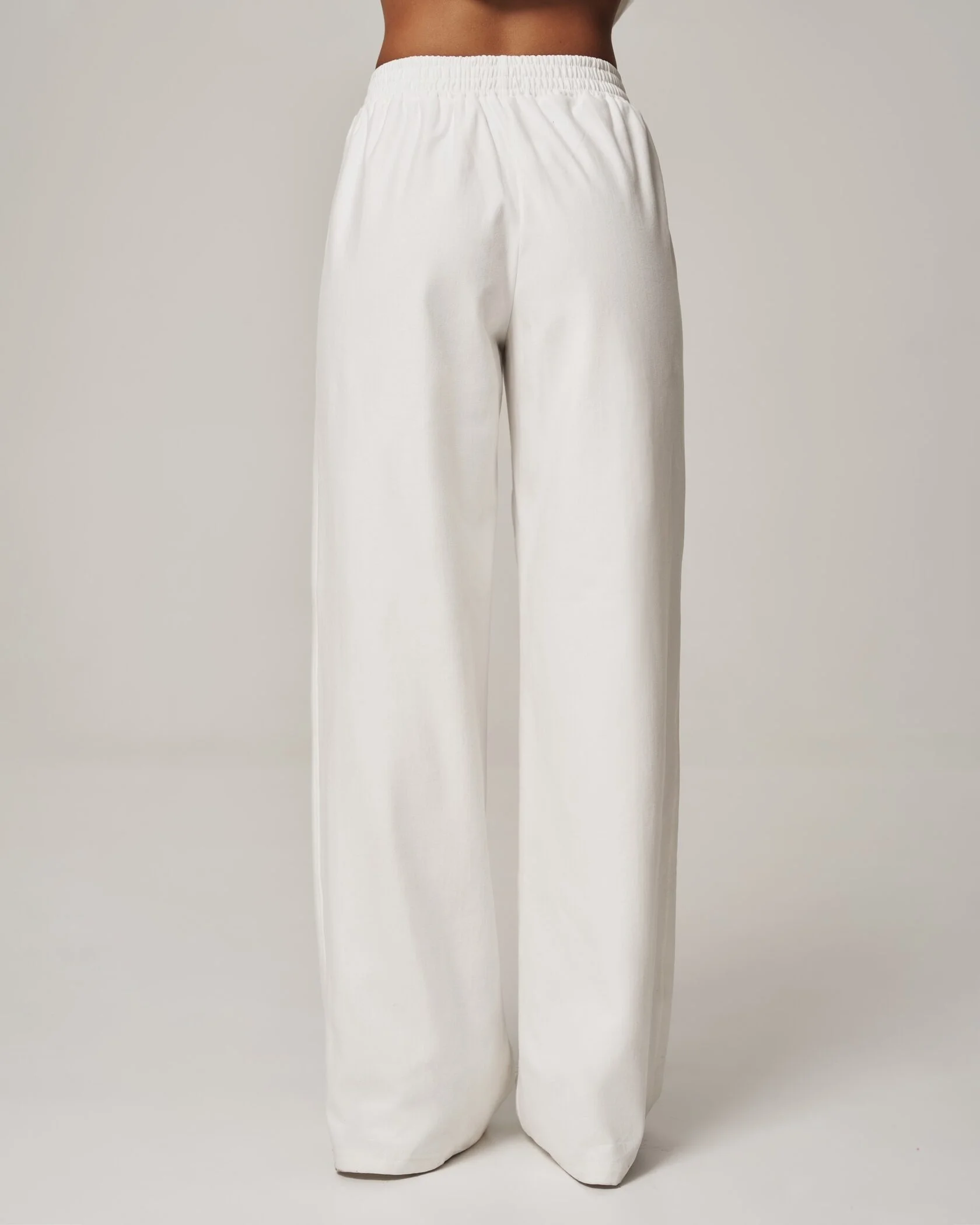 Свободный прямой силуэт с широкими штанинами создаёт эффект плавной драпировки и визуально удлиняет ноги. Эластичный пояс обеспечивает комфорт и удобную посадку без необходимости ремня. Палаццо выполнены в мягком молочном оттенке — универсальном и лёгком для комбинирования с разными вещами