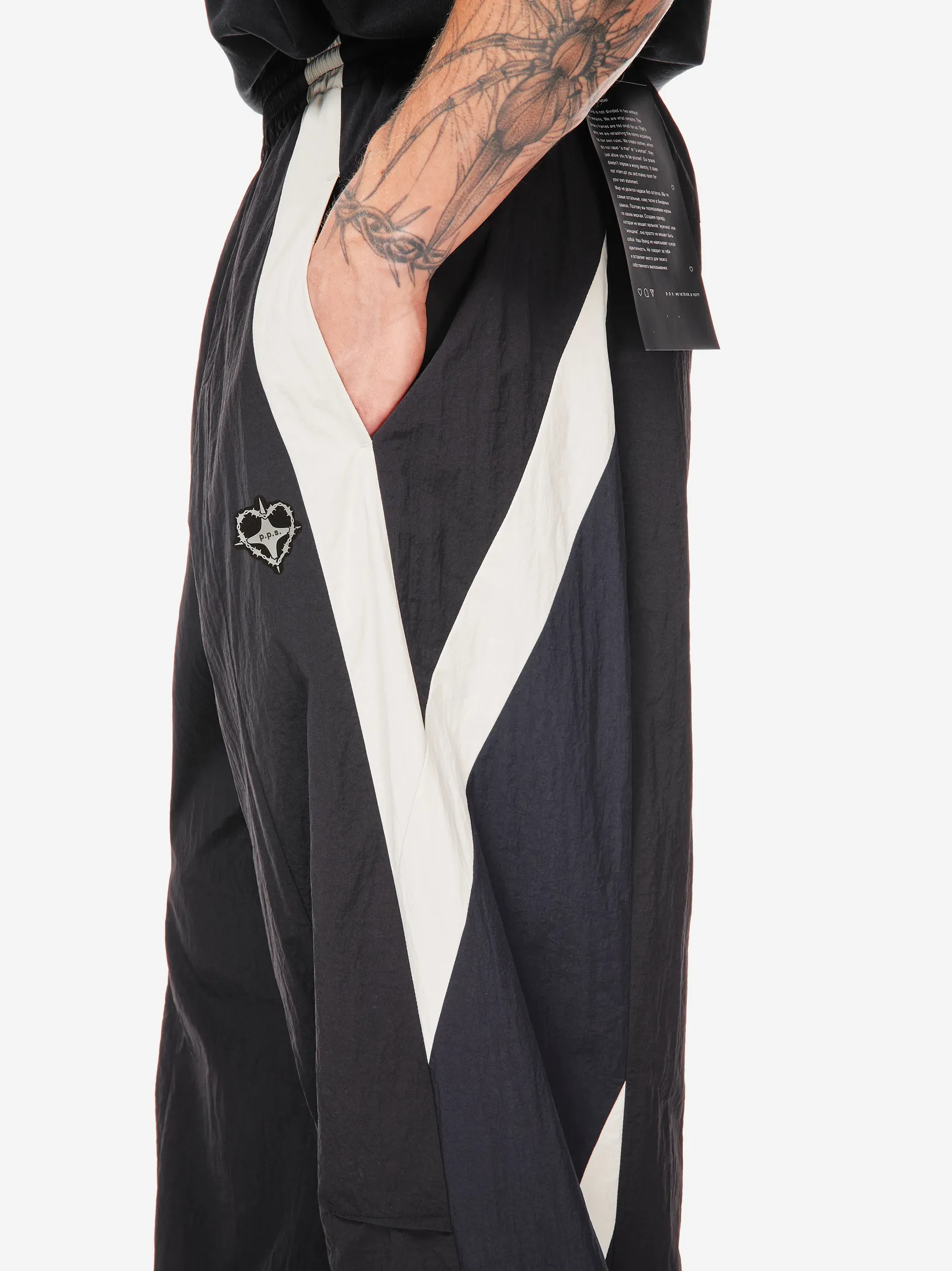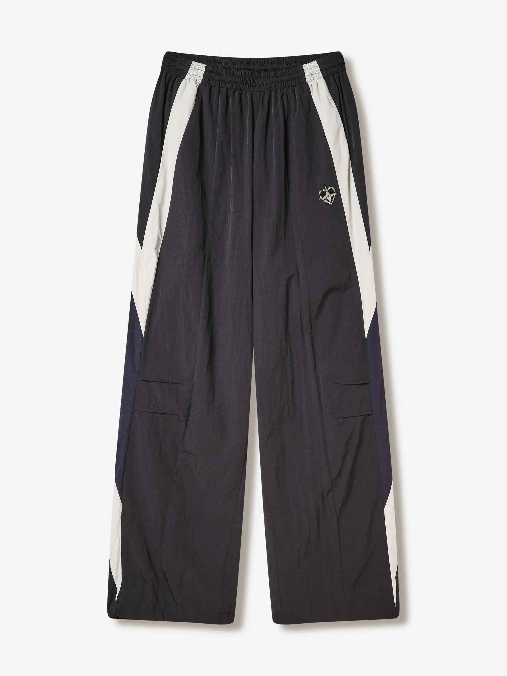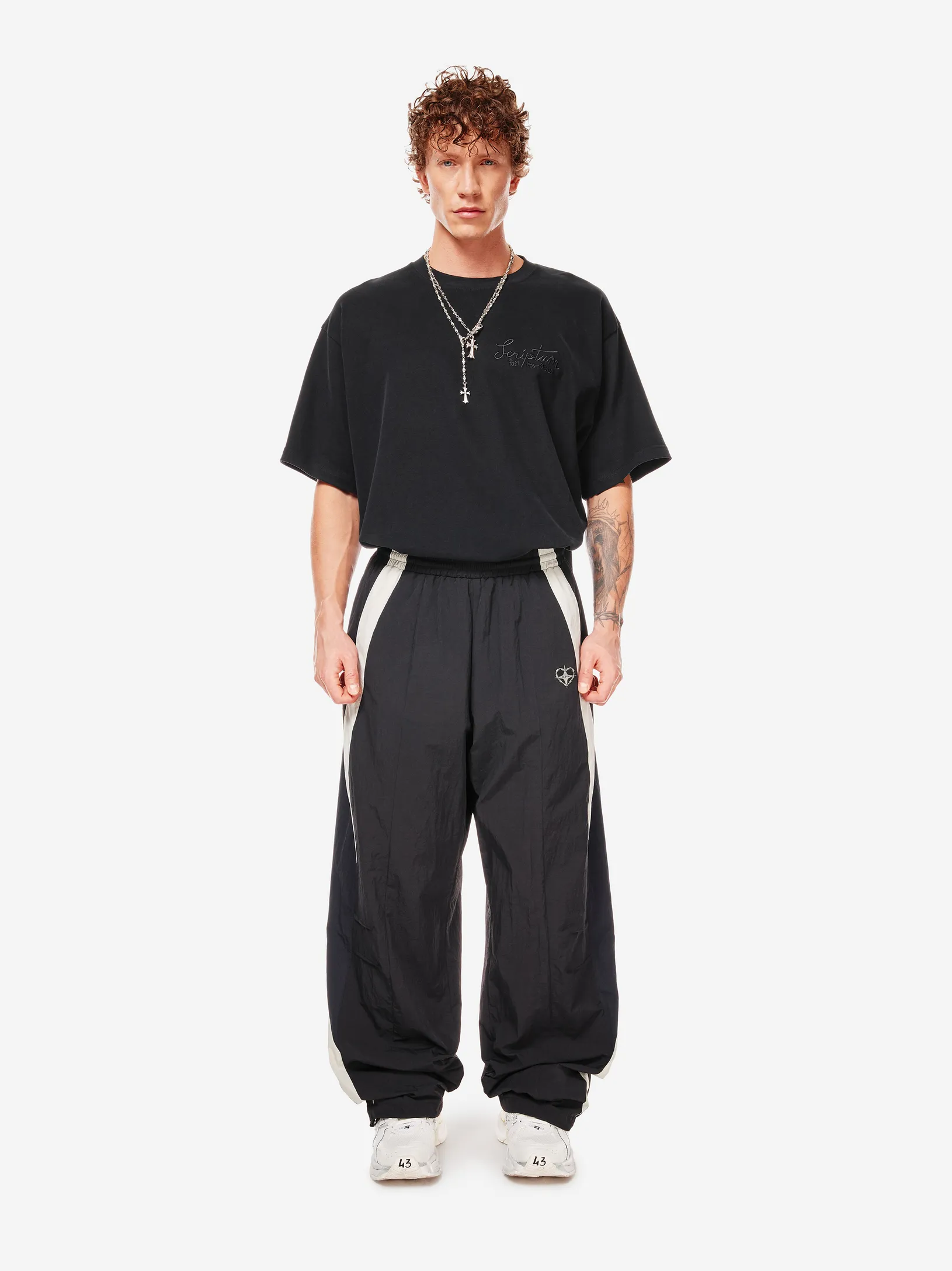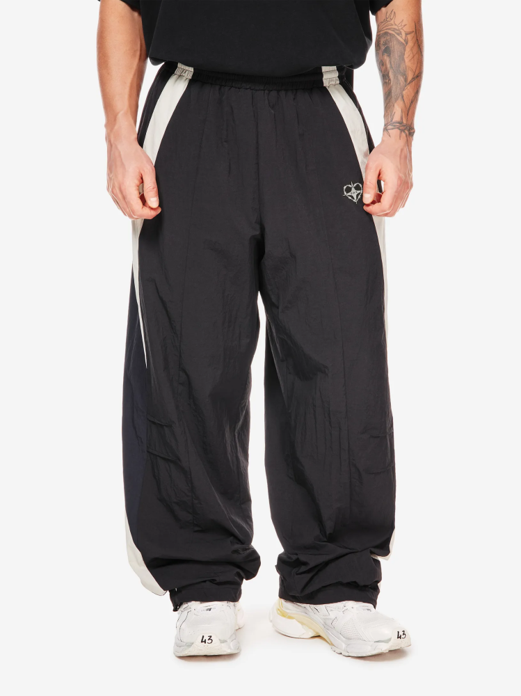 Брюки chrome heart — продолжение архивного спортивного кода в эстетике Y2K. Широкий силуэт, графичные контрастные вставки и функциональные детали формируют динамичный образ на стыке спорта, урбанистики и индивидуального стиля.