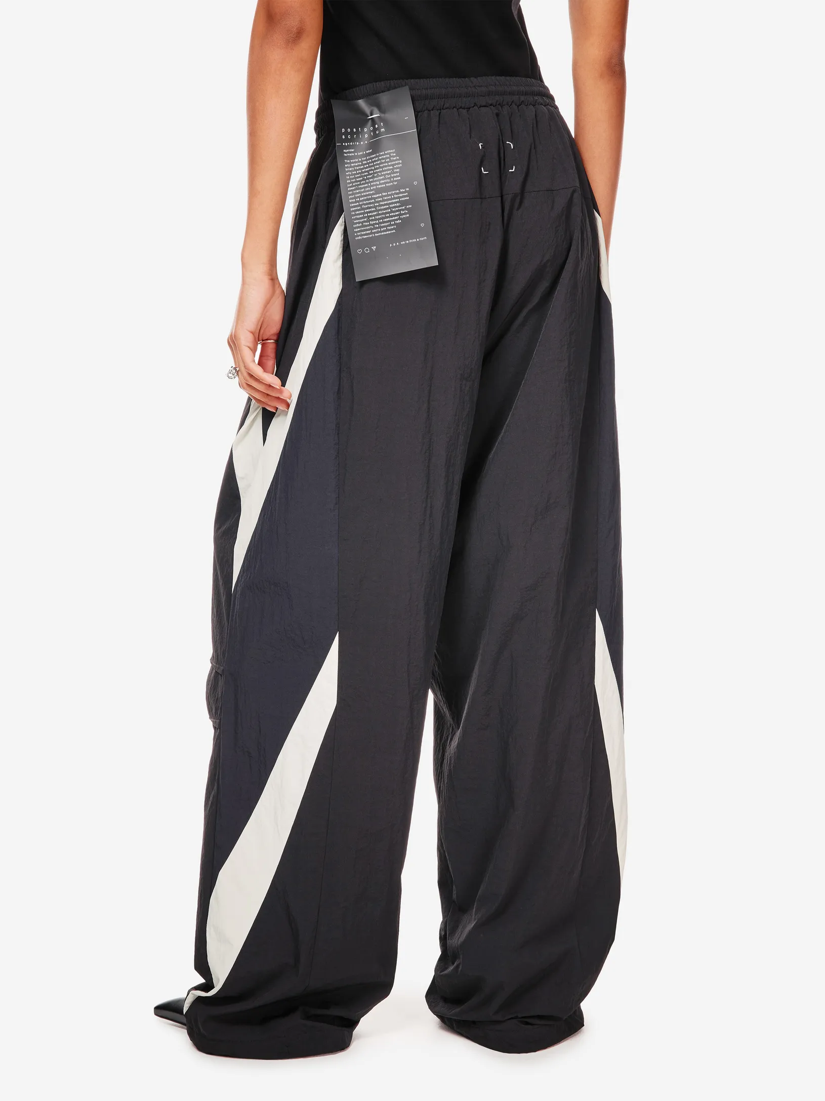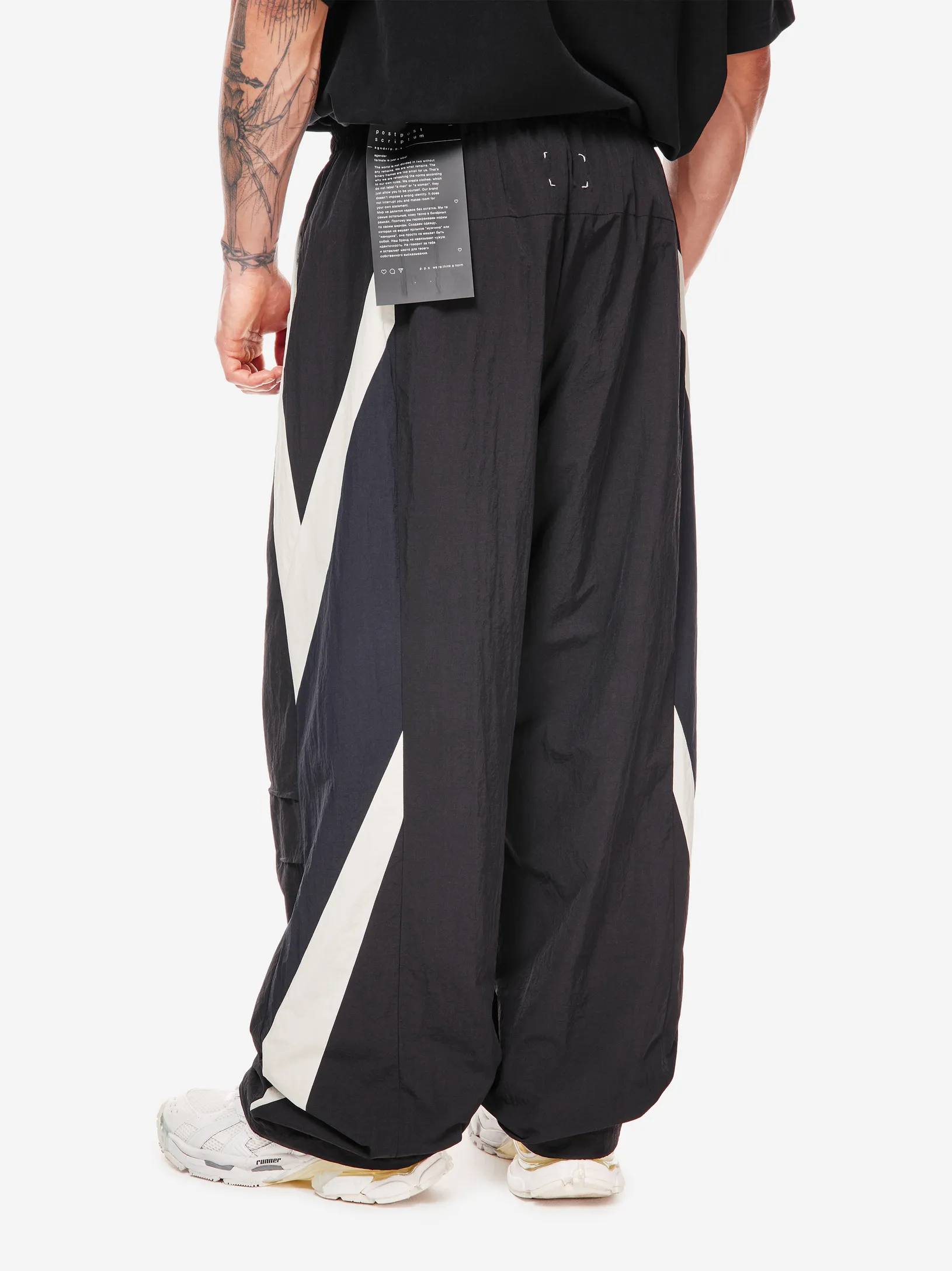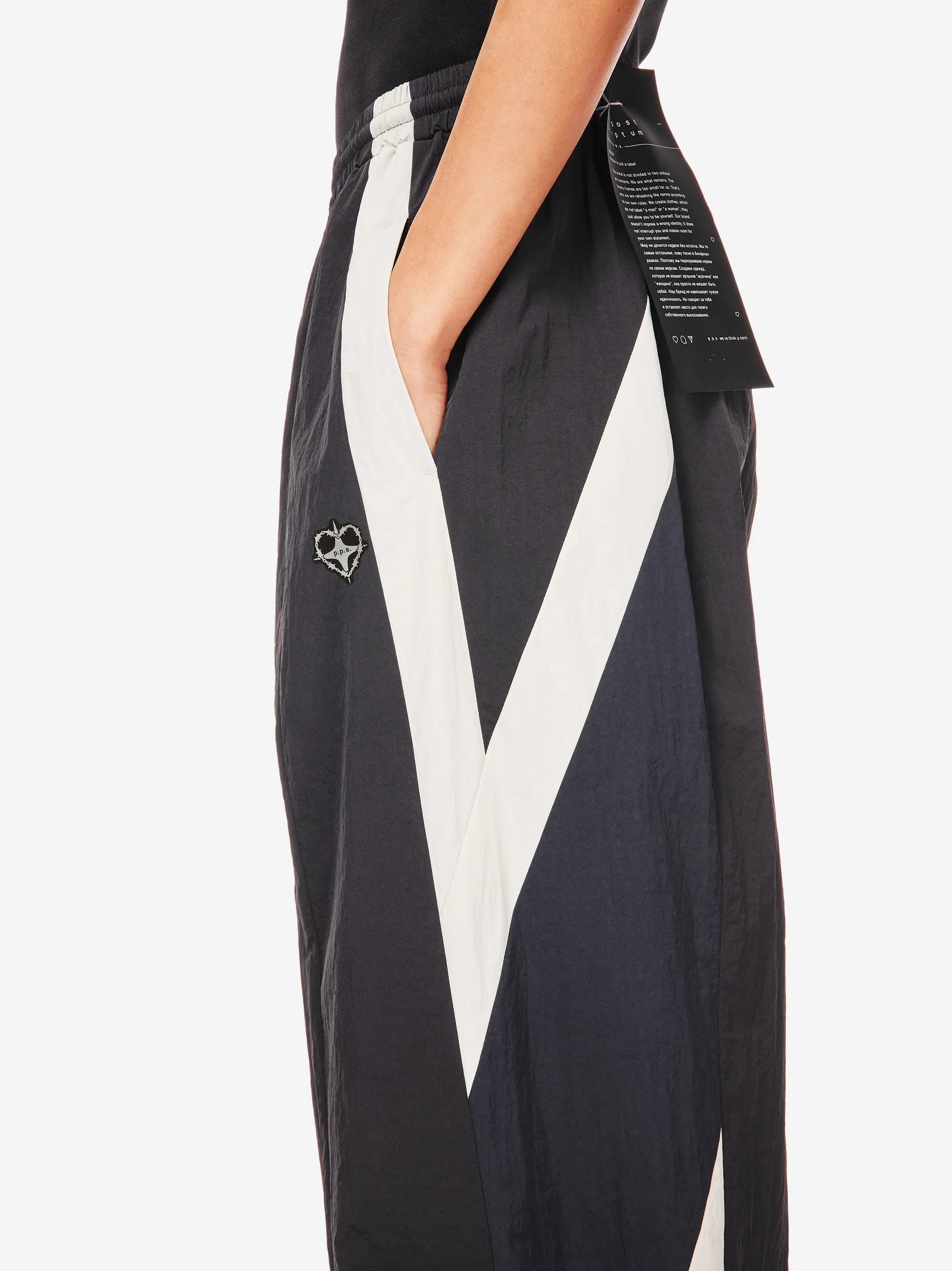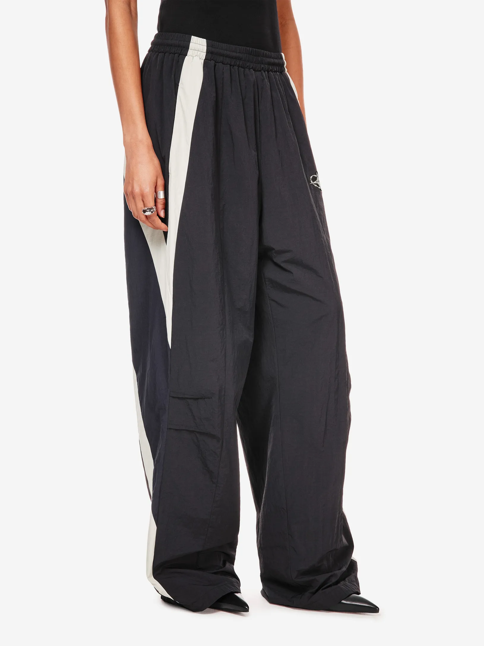 Брюки chrome heart — продолжение архивного спортивного кода в эстетике Y2K. Широкий силуэт, графичные контрастные вставки и функциональные детали формируют динамичный образ на стыке спорта, урбанистики и индивидуального стиля.