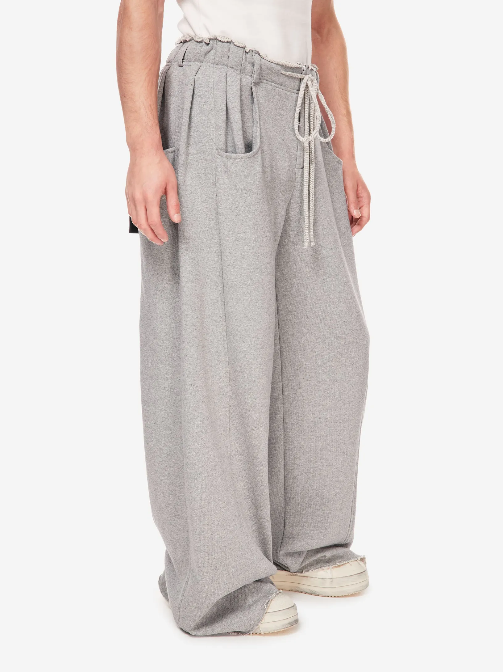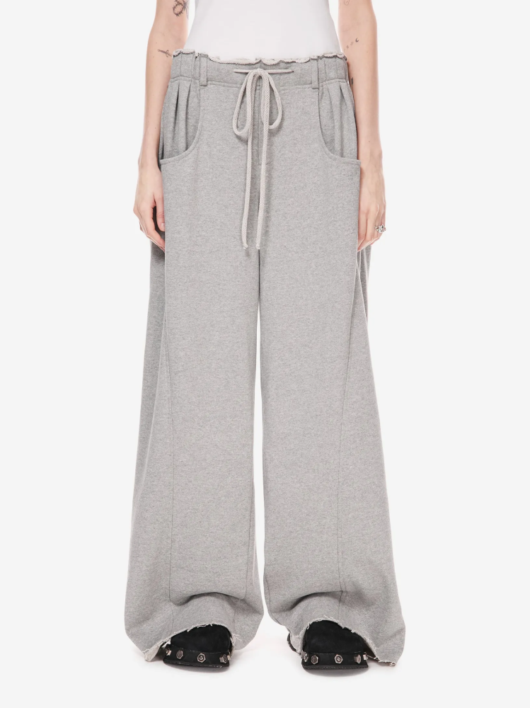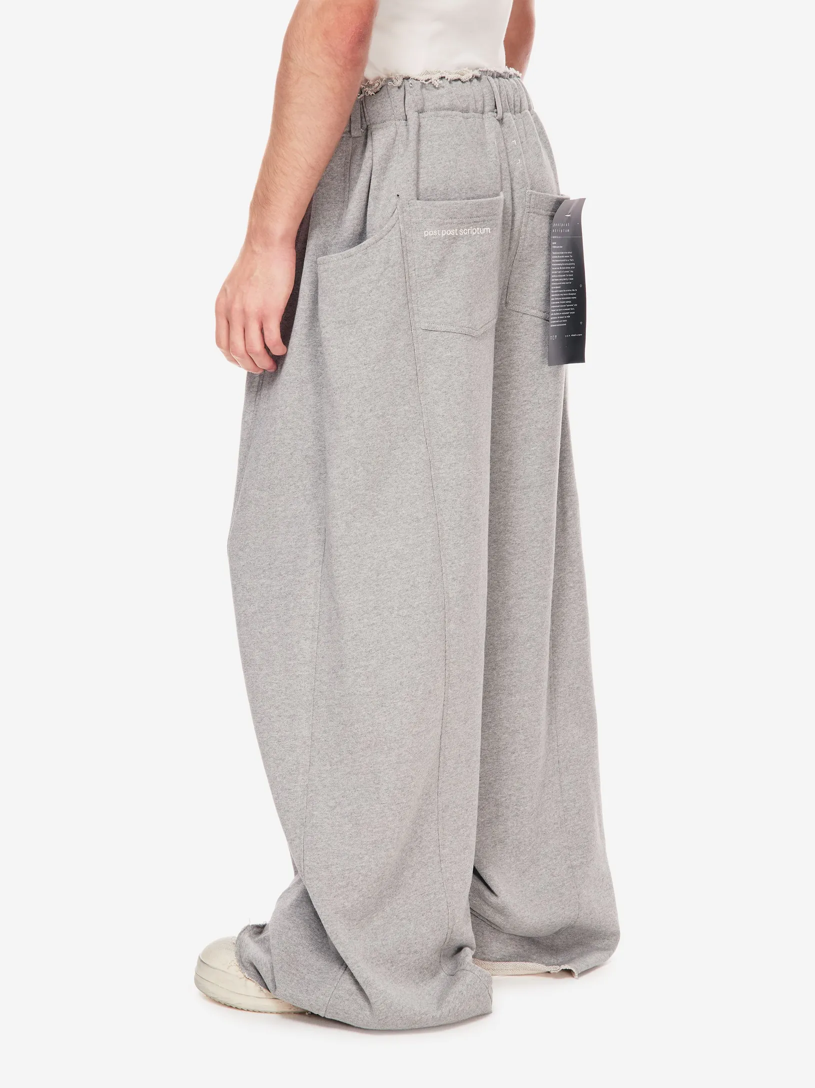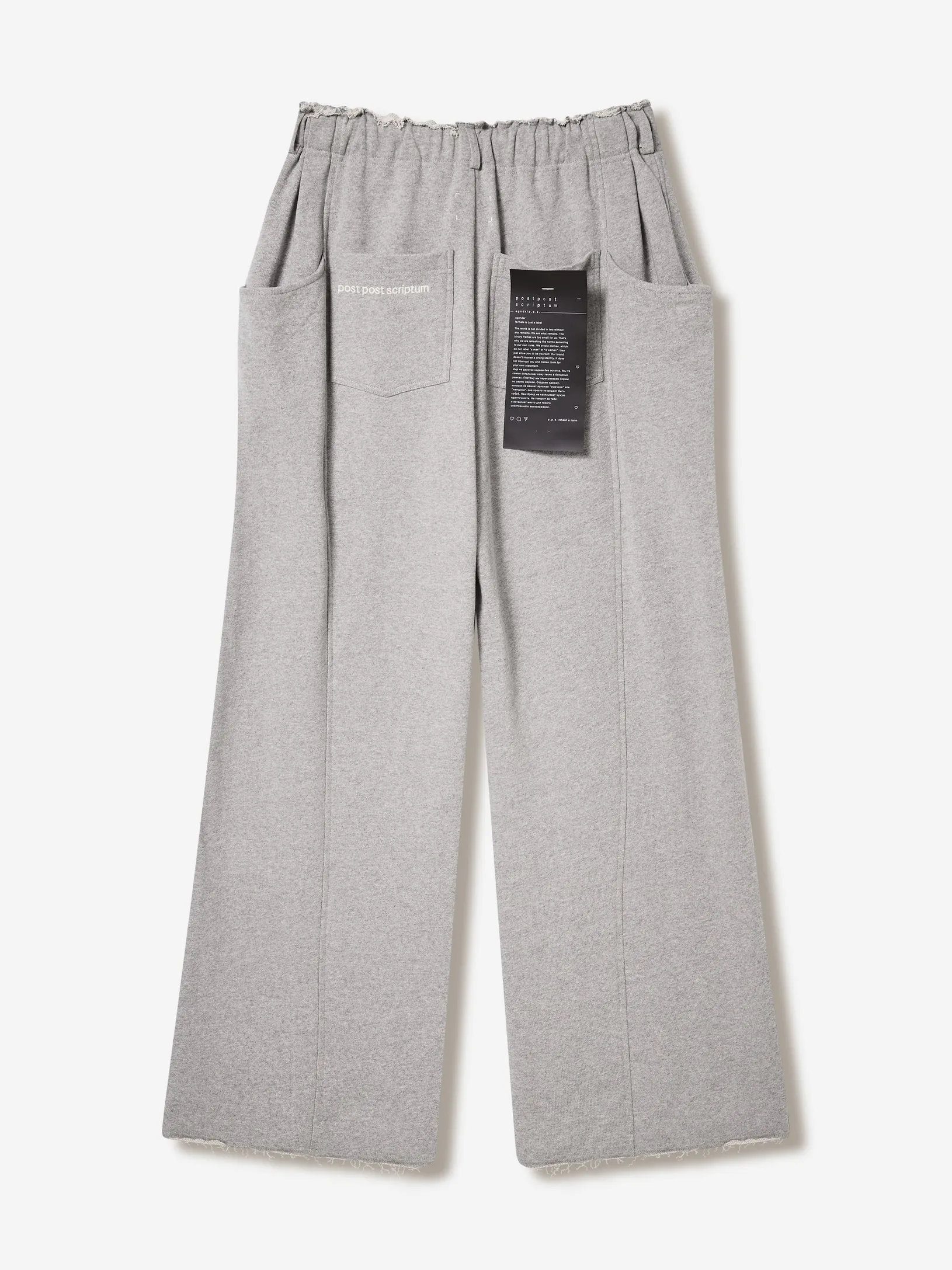Брюки в эстетике современной уличной одежды с отсылкой к спортивным кодам конца 90-х. Необработанный край пояса, утилитарные карманы и расслабленная длина с напуском на обувь. Это не спорт, а его модная трансформация.