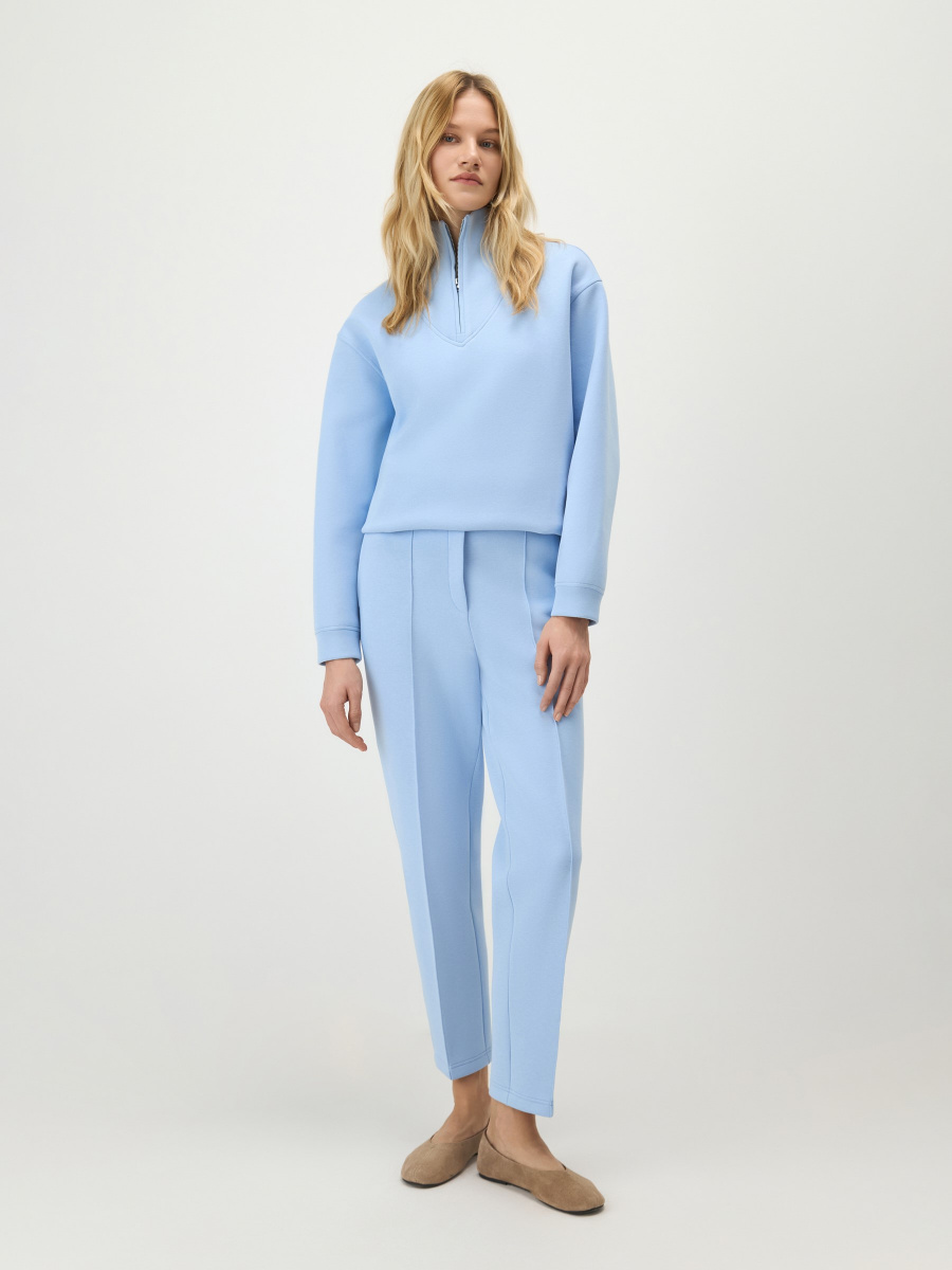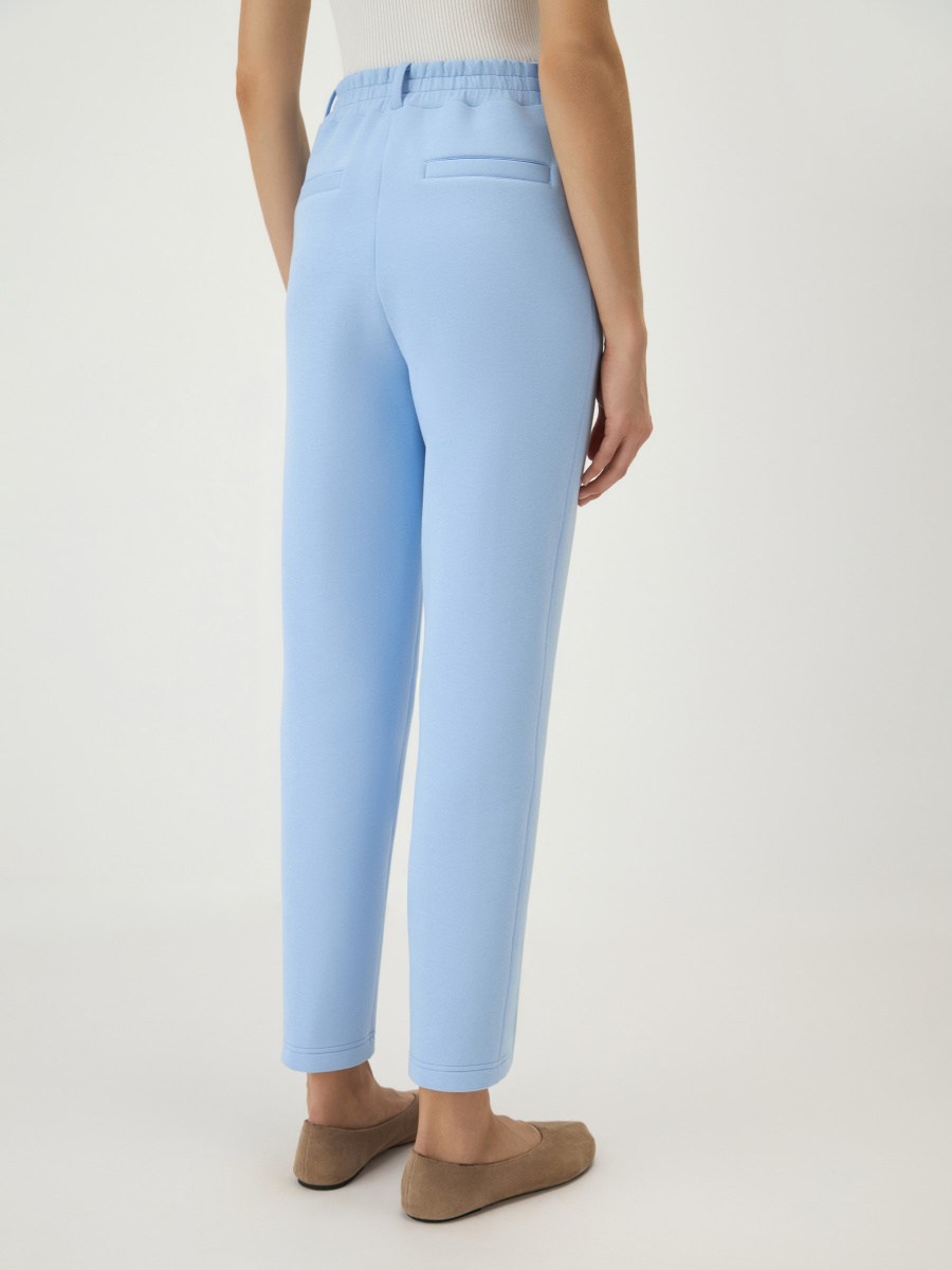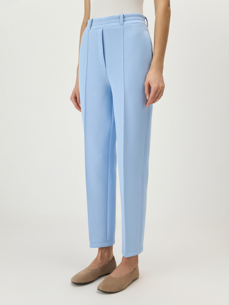 Зауженные брюки длиной до щиколотки из плотного хлопкового неофутера. Выполнены с отсылкой к классическому стилю — с застроченными стрелками, имитацией гульфика и задних карманов. Пояс с резинкой на спинке обеспечивает удобную посадку на талии, боковые карманы и шлевки под ремень добавляют функциональности.