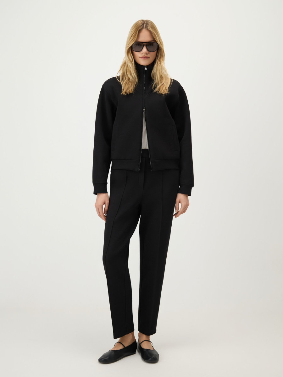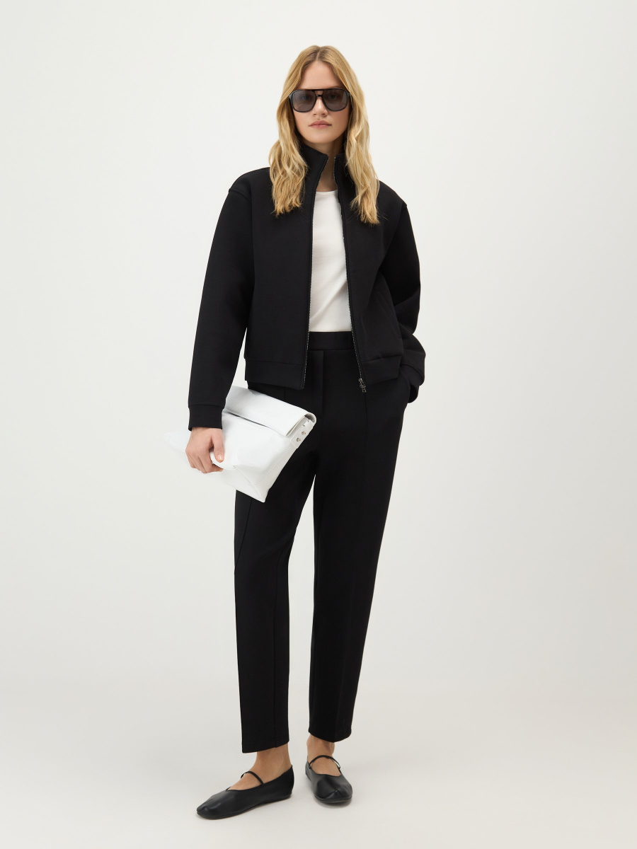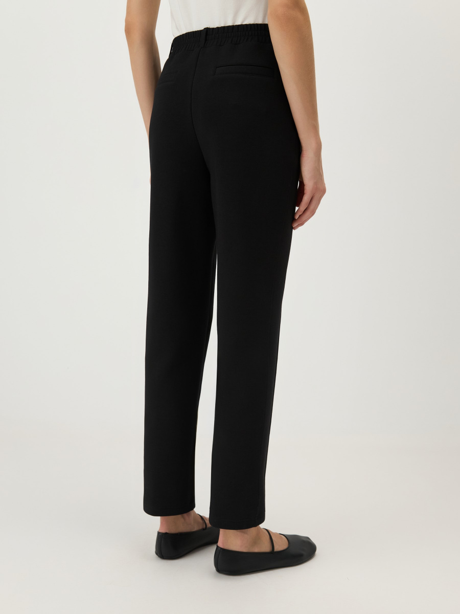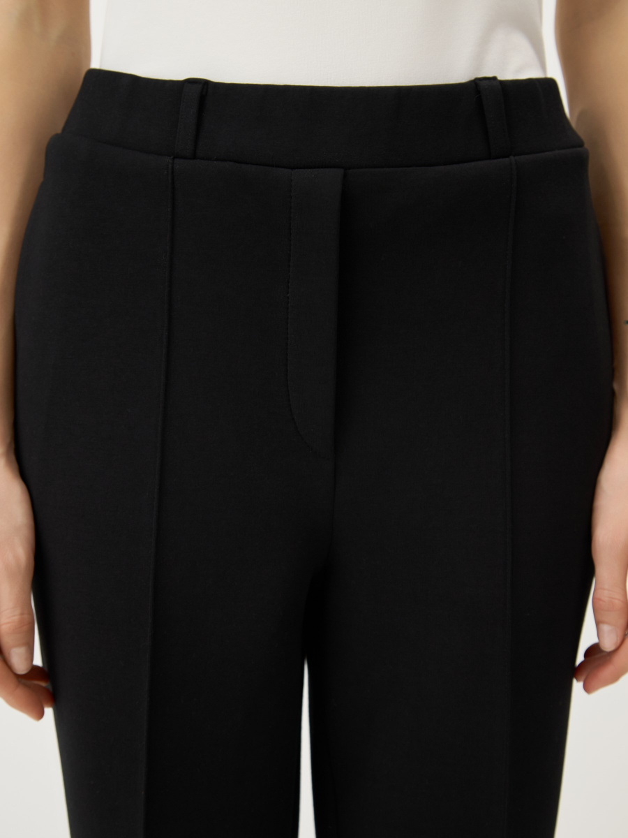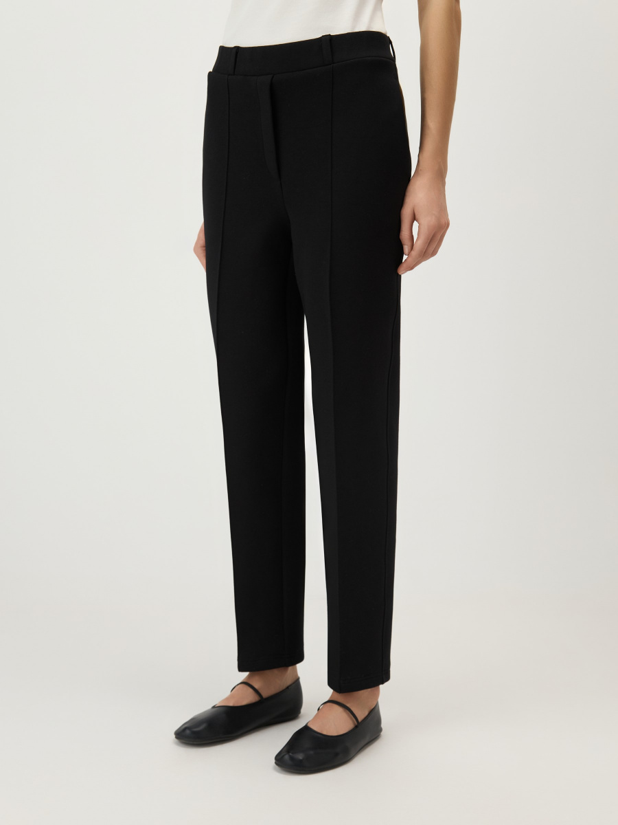 Зауженные брюки длиной до щиколотки из плотного хлопкового неофутера. Выполнены с отсылкой к классическому стилю — с застроченными стрелками, имитацией гульфика и задних карманов. Пояс с резинкой на спинке обеспечивает удобную посадку на талии, боковые карманы и шлевки под ремень добавляют функциональности.