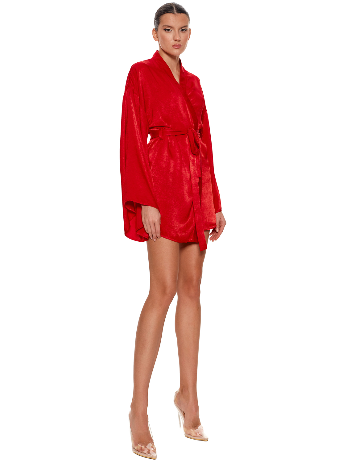 Твой яркий и стильный образ для домашнего релакса! Халат в стиле кимоно выполнен из нежной, невероятно приятной к телу ткани с деликатным блеском. Длина мини, широкие рукава, запах в японской стилистике, фиксация на широкий пояс, контрастное оформление краев. Носи кимоно в качество домашней одежды, а также для пляжных образов. Полная воля твоей фантазии!