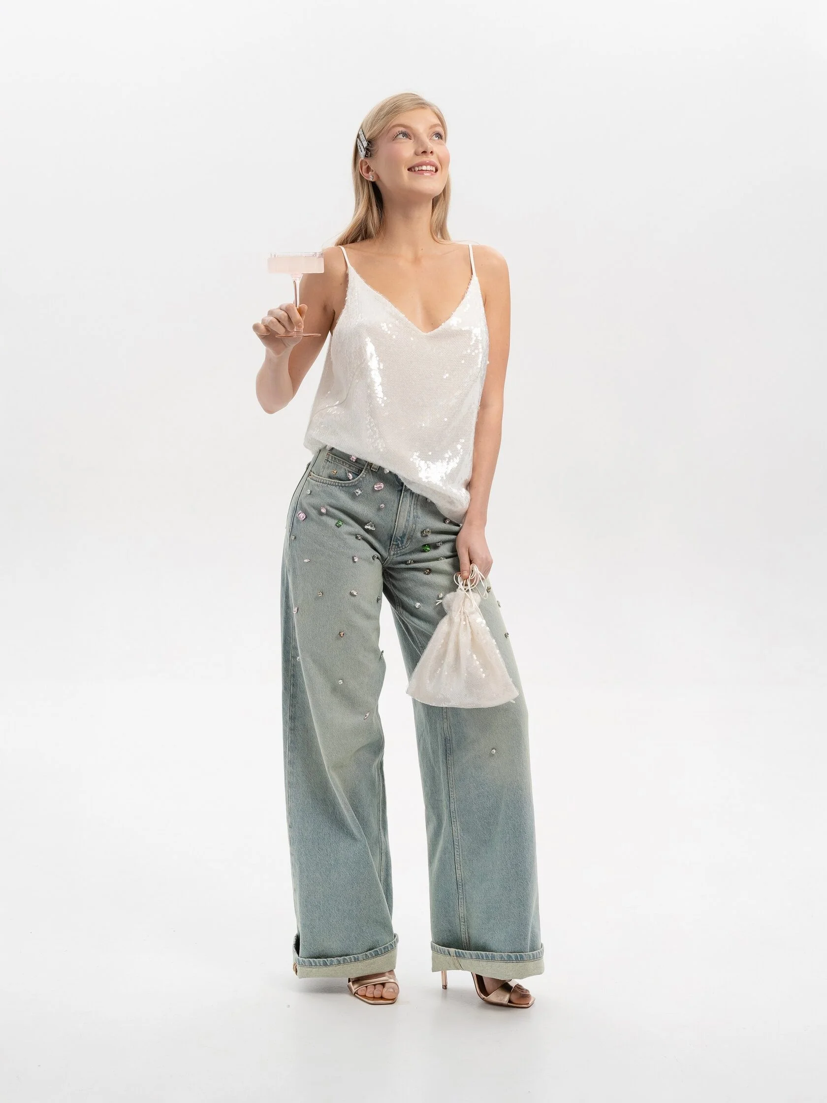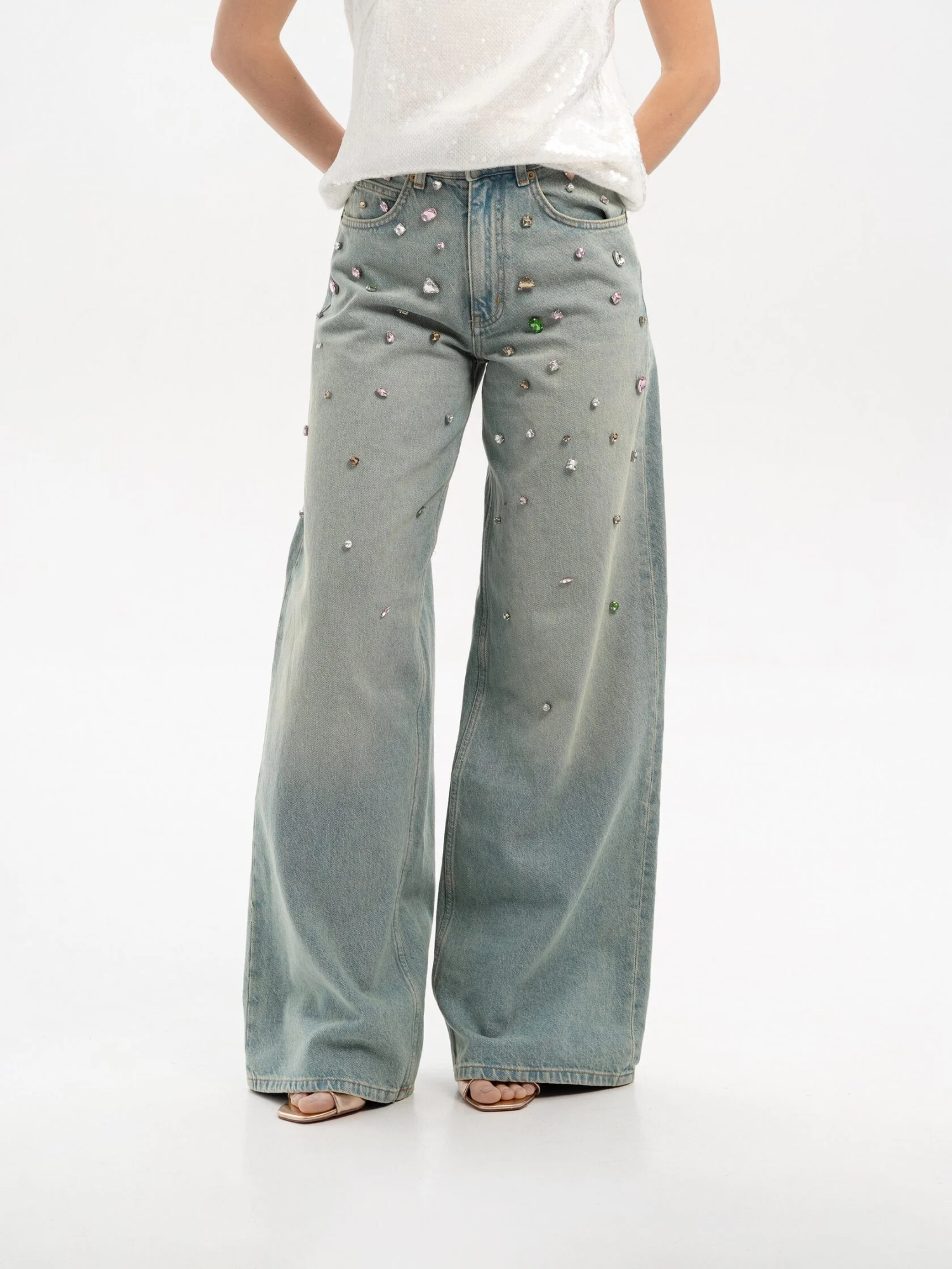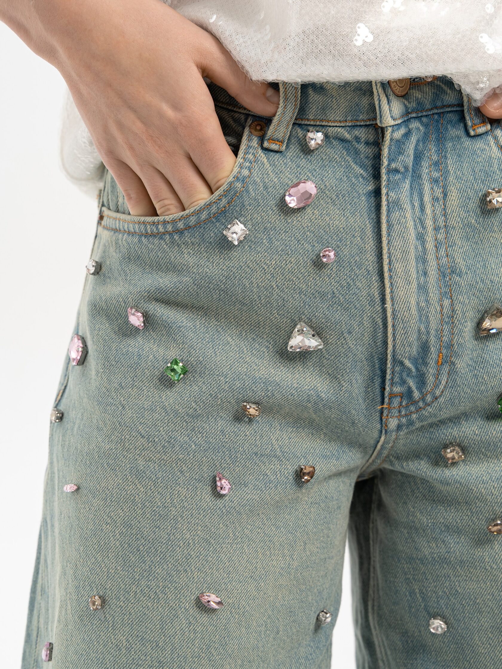Прямые голубые джинсы со стразами делают образ ярким и дерзким. Легкое сияние добавляет праздничного настроения, так что это отличный выбор для новогодних вечеринок, когда хочется создать комфортный, но эффектный наряд. После праздников такие джинсы легко вписываются в повседневный гардероб в качестве выразительной детали.