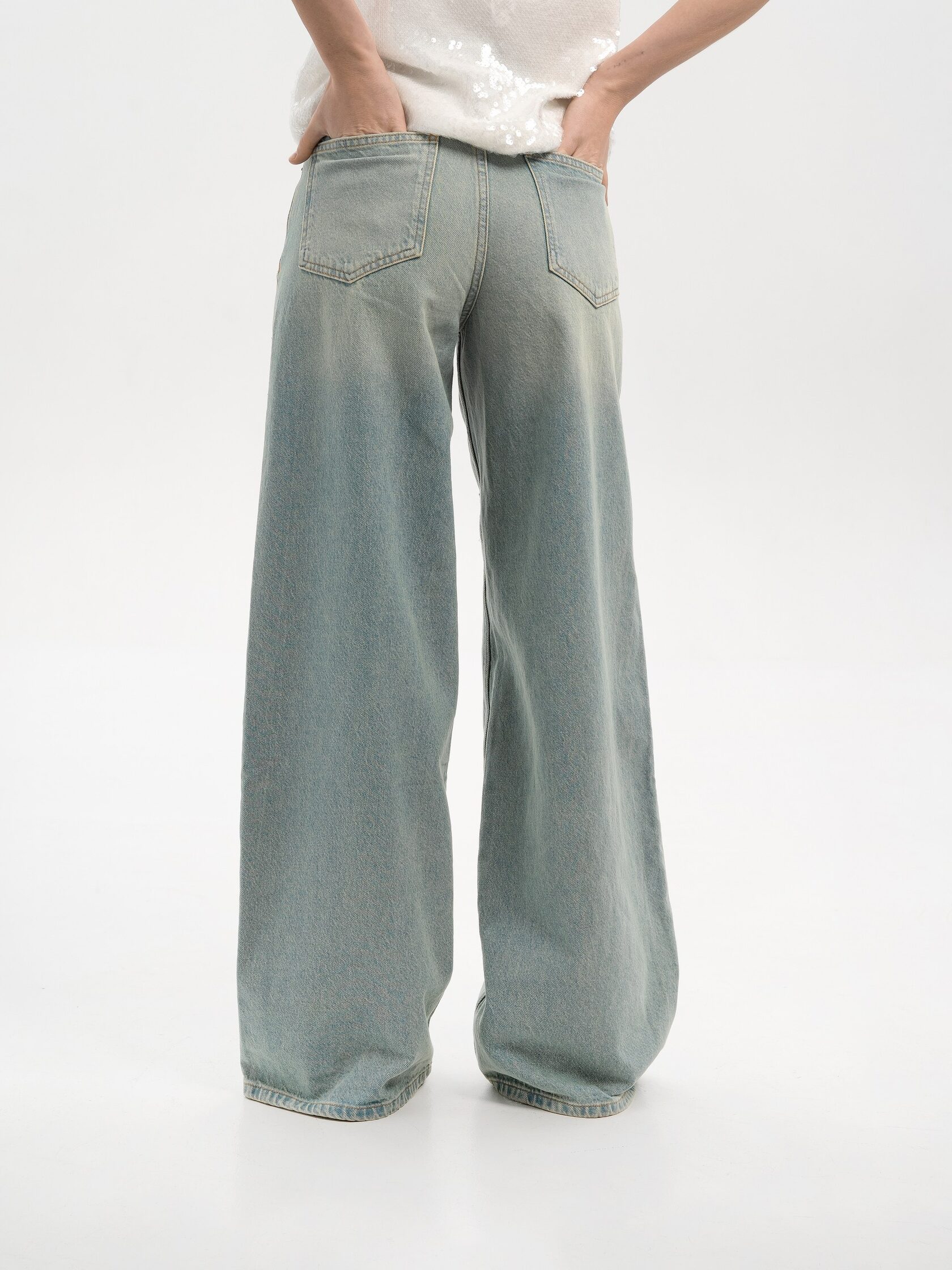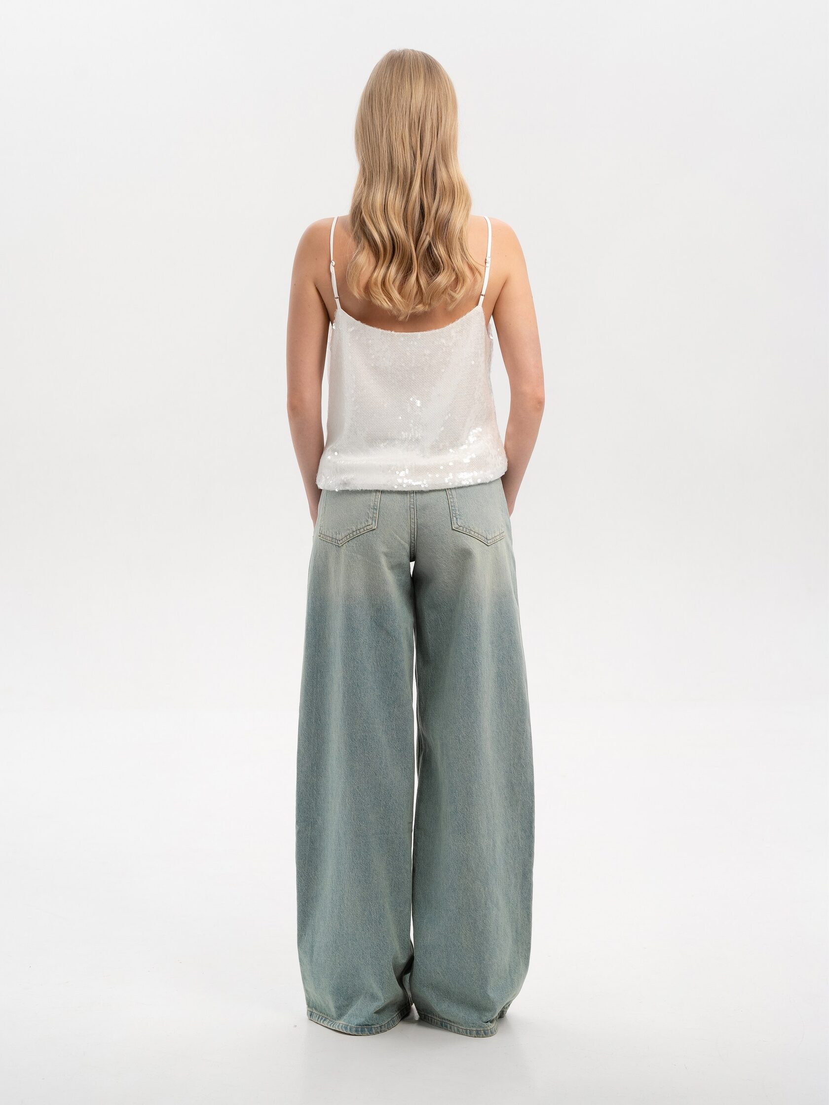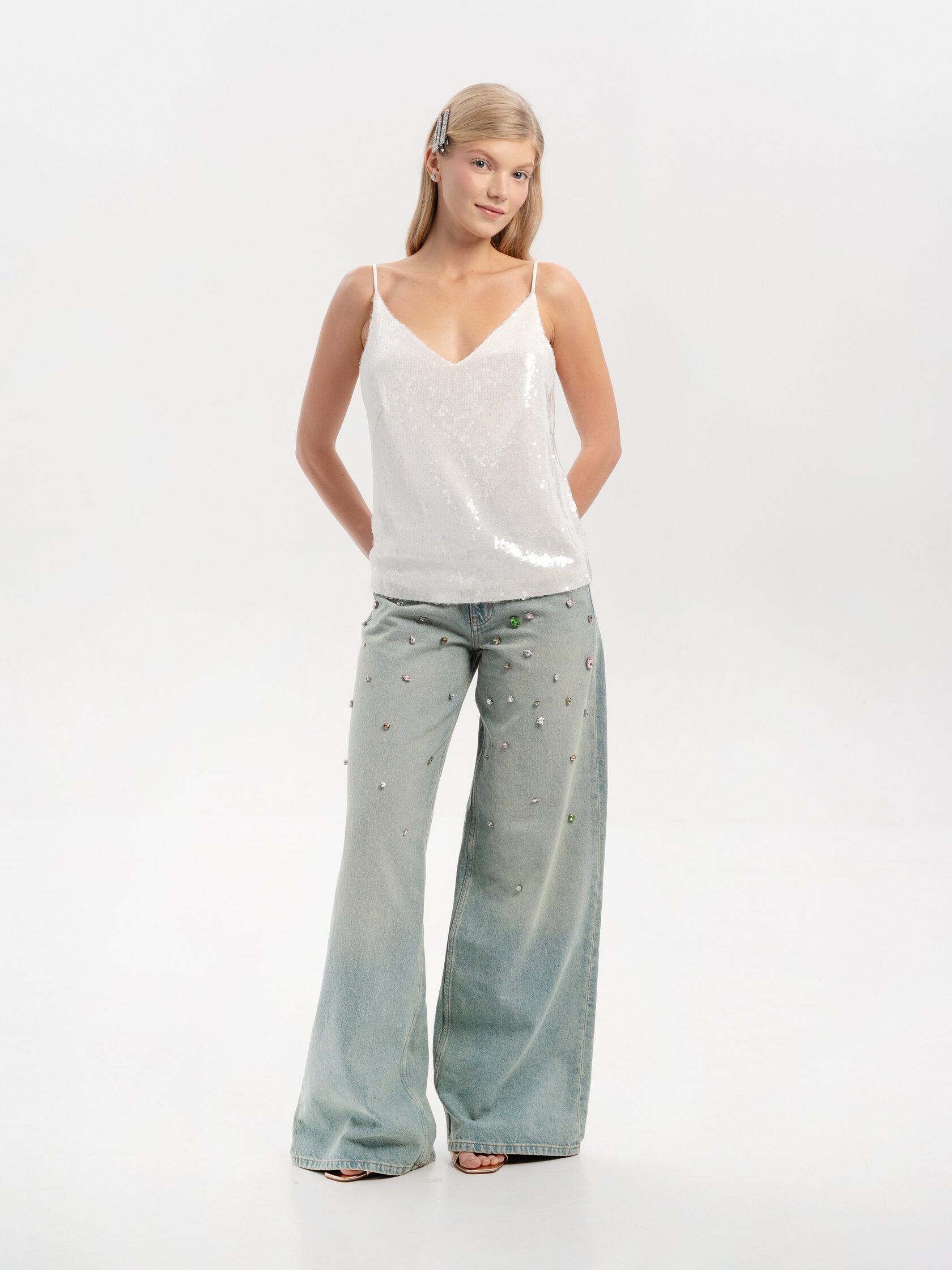 Прямые голубые джинсы со стразами делают образ ярким и дерзким. Легкое сияние добавляет праздничного настроения, так что это отличный выбор для новогодних вечеринок, когда хочется создать комфортный, но эффектный наряд. После праздников такие джинсы легко вписываются в повседневный гардероб в качестве выразительной детали.