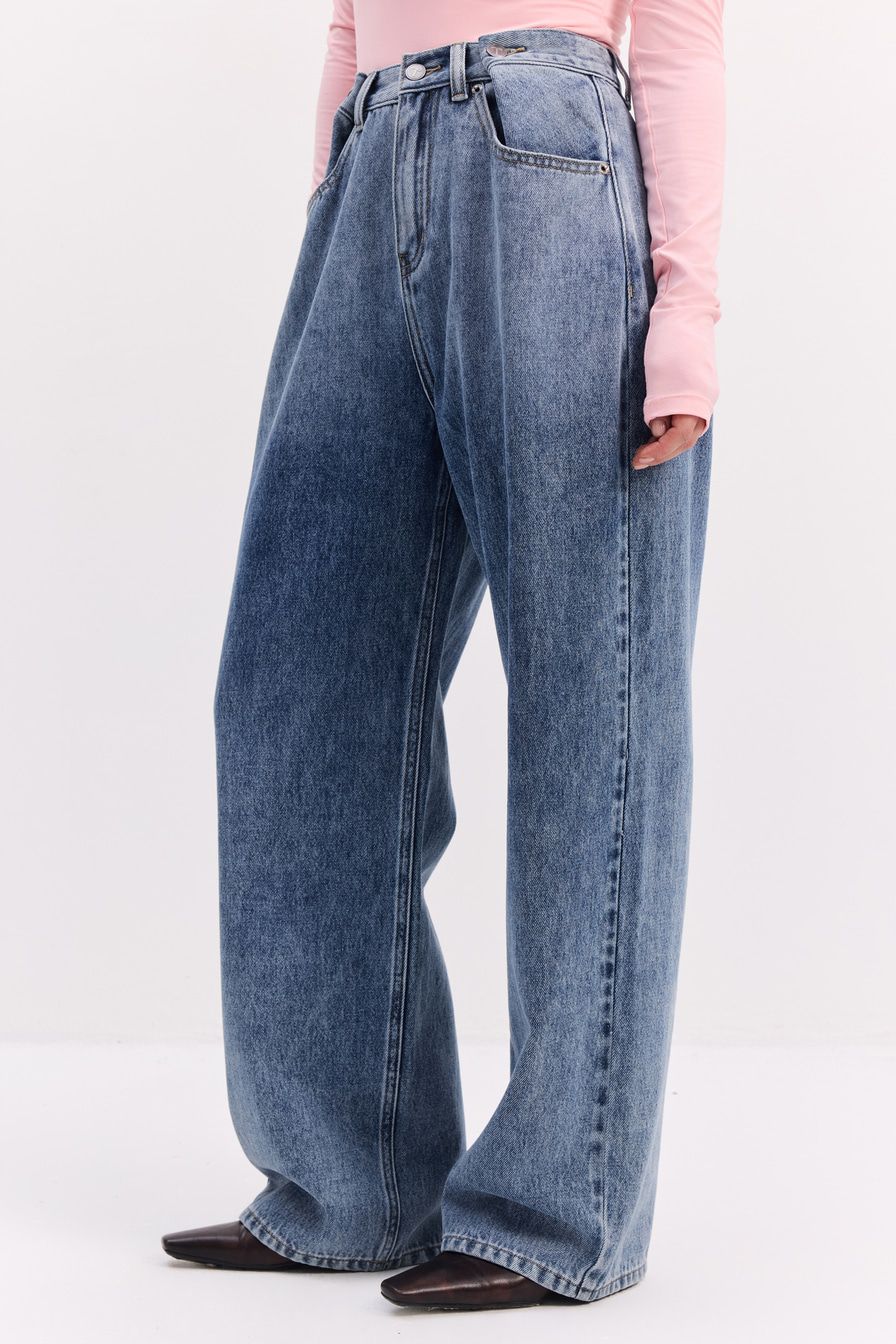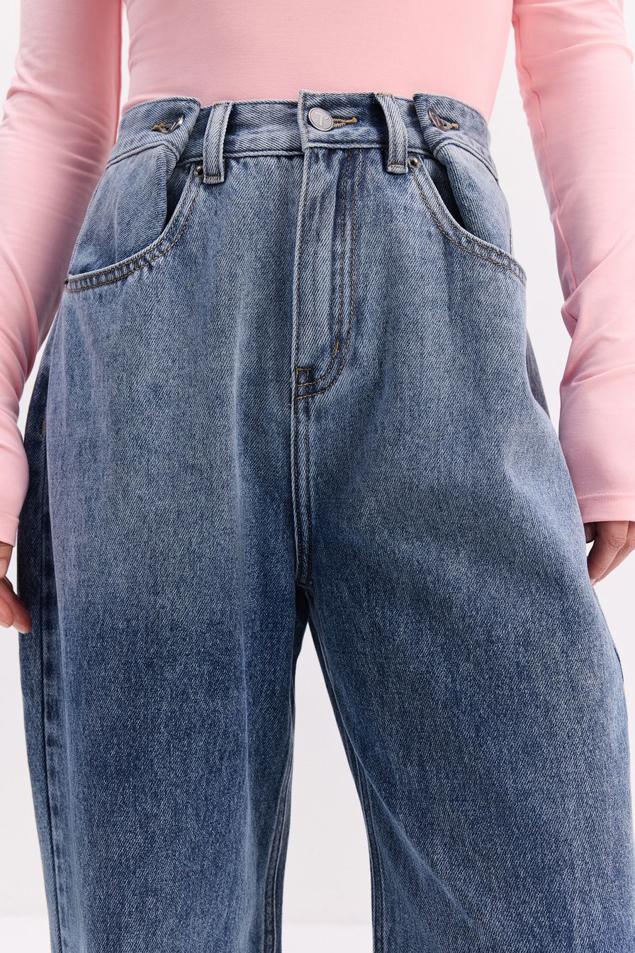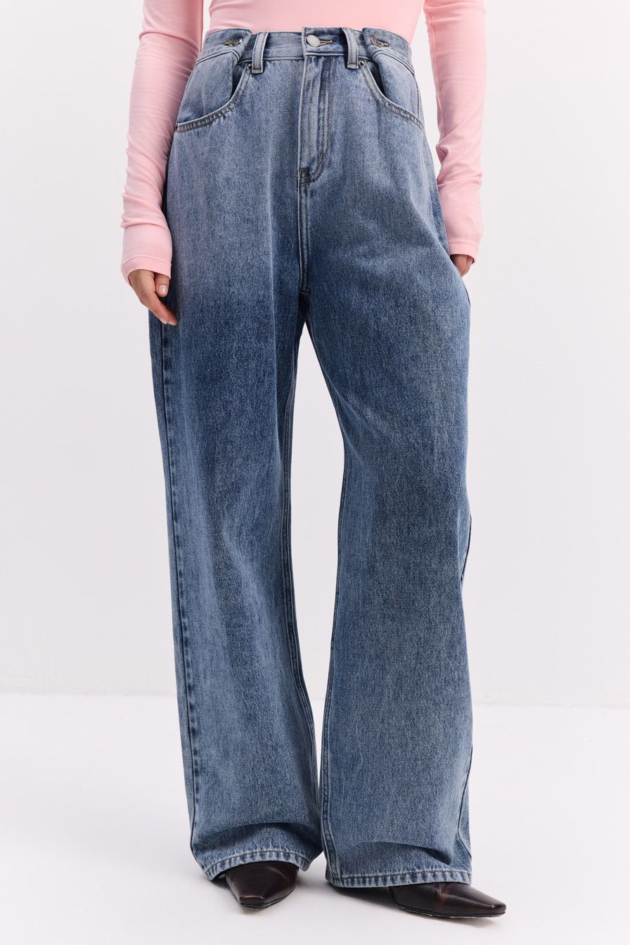 Широкие синие джинсы из 100% хлопка – модель свободного кроя с застежками на поясе. Джинсы декорированы потертостями.