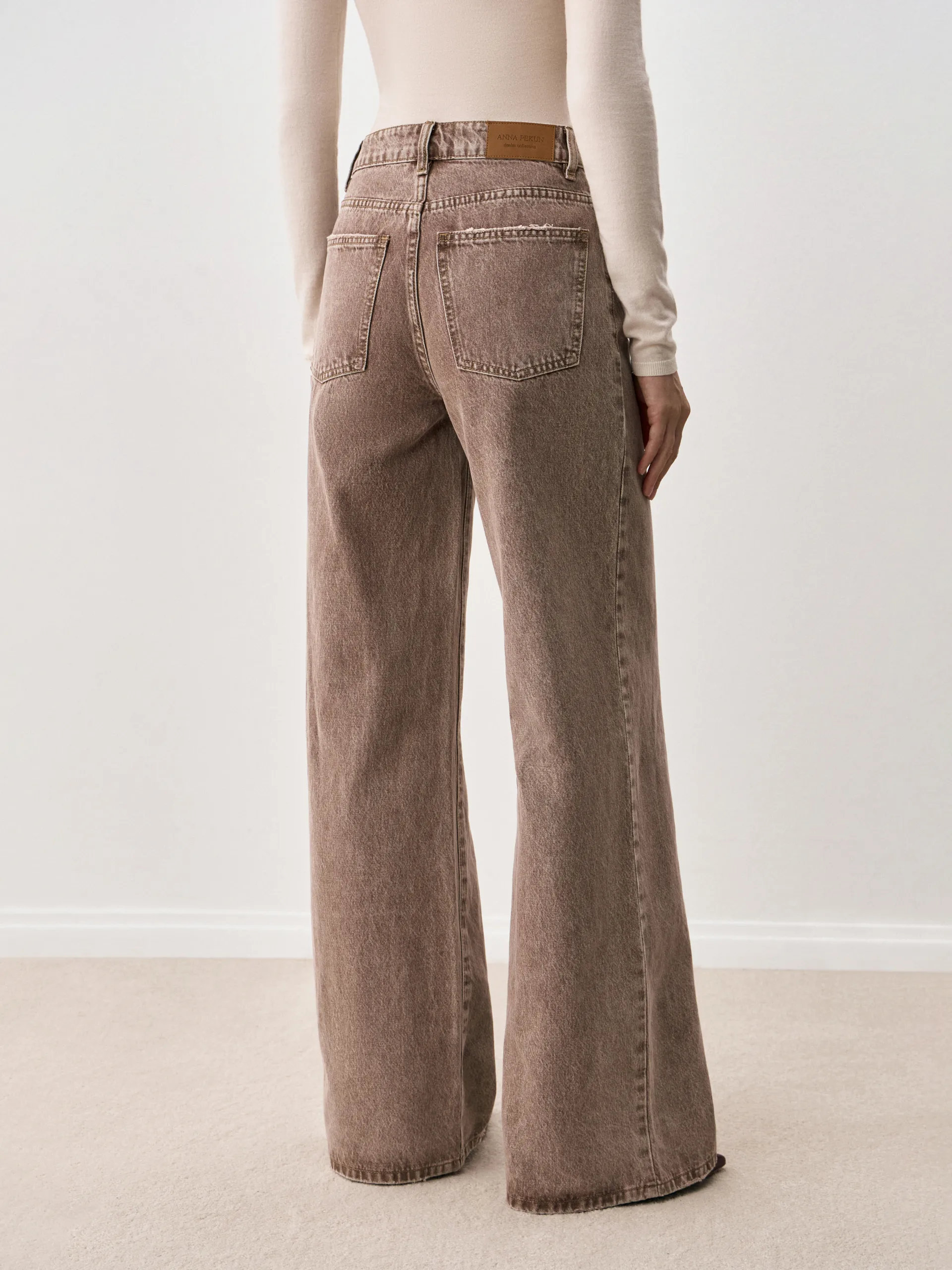 Джинсы из коричневого денима c винтажным эффектом. Модель из 100% хлопка высокого качества. Не вытягивается и надолго сохраняет первоначальный внешний вид. Слегка расширяются от бедра, создавая интересный силуэт.