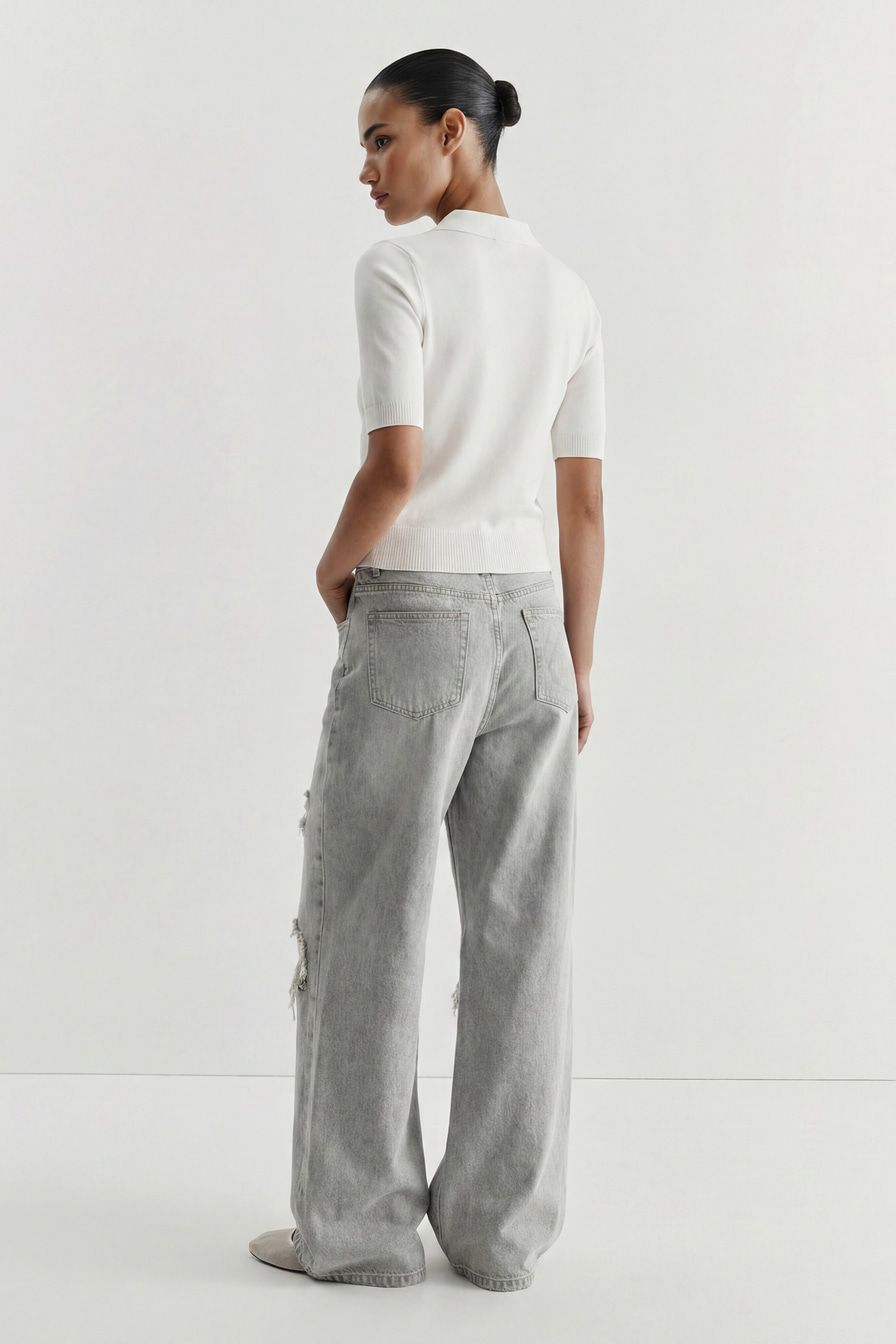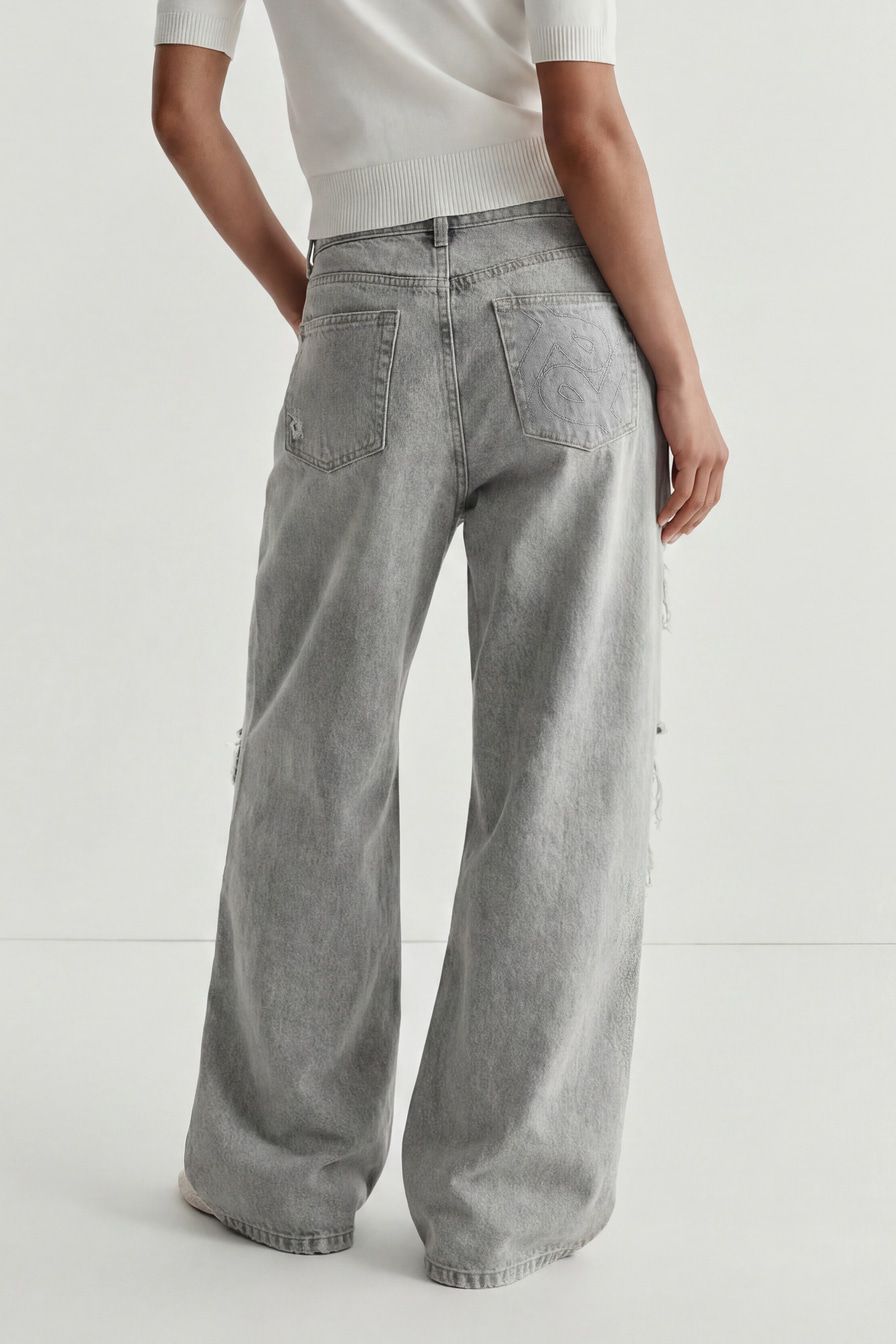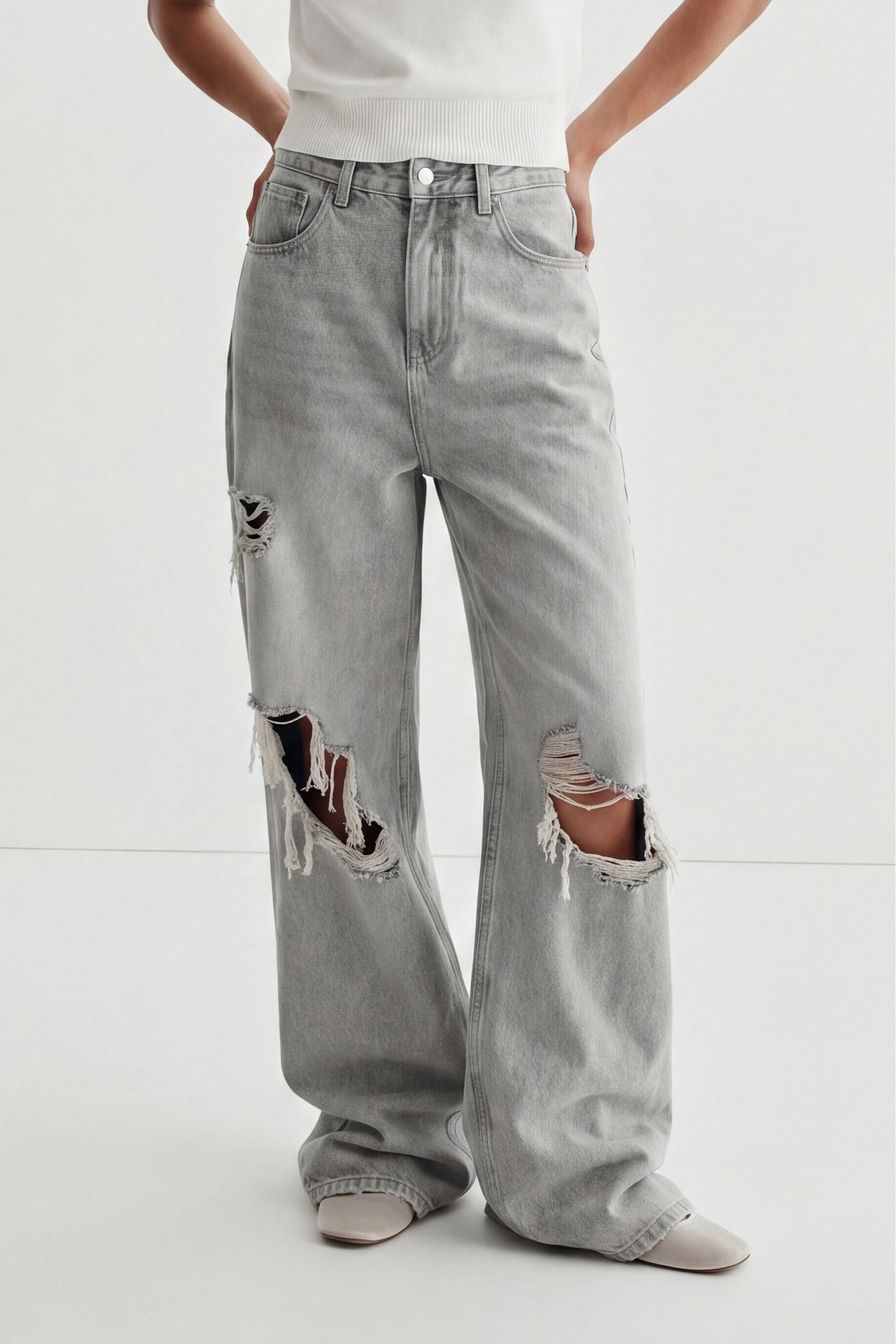 Широкие джинсы серого цвета выполнены из смесового хлопка, декорированы потертостями и разрезами в стиле гранж.