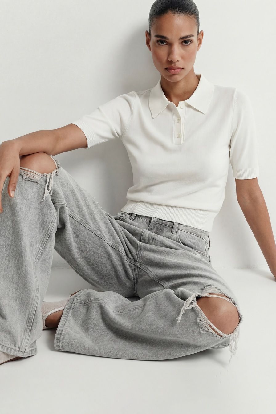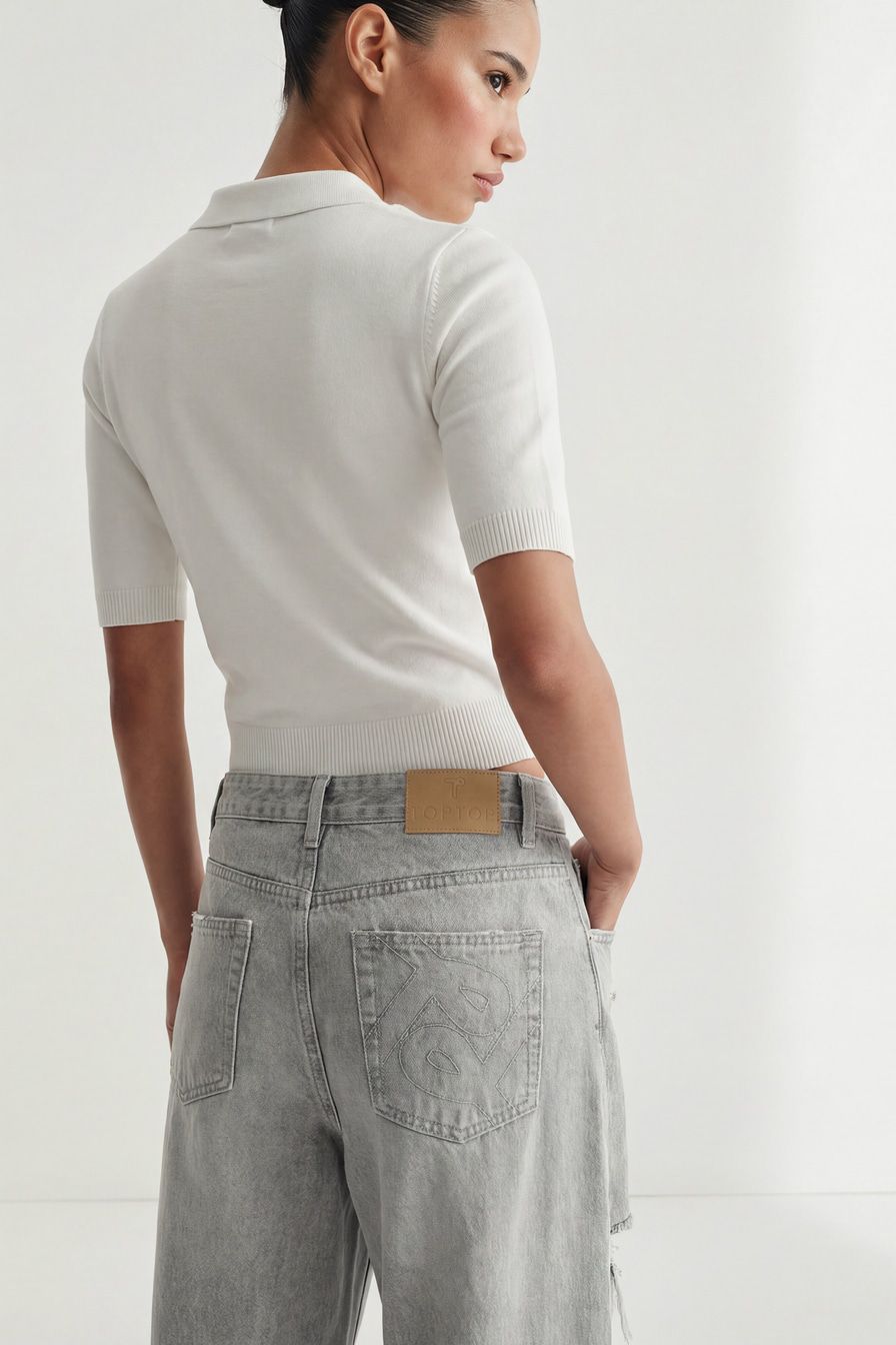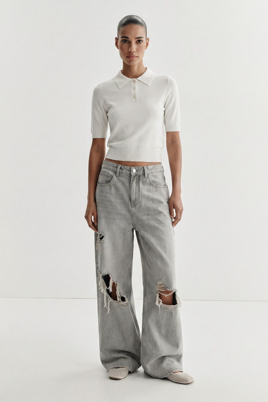 Широкие джинсы серого цвета выполнены из смесового хлопка, декорированы потертостями и разрезами в стиле гранж.