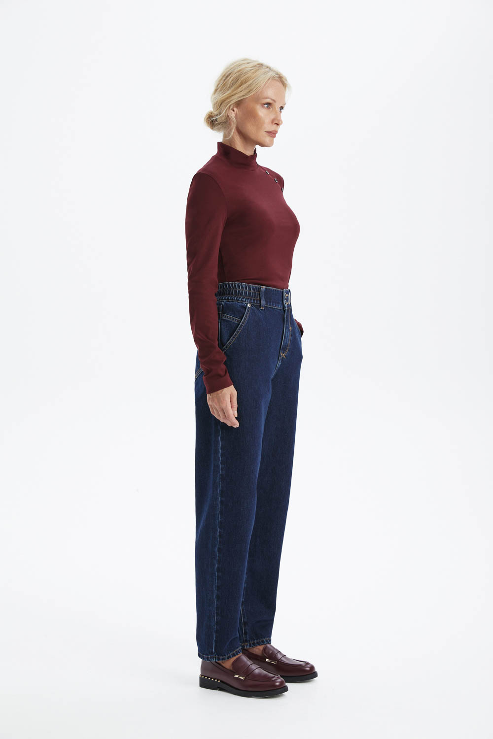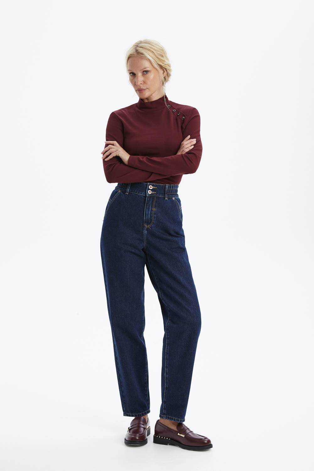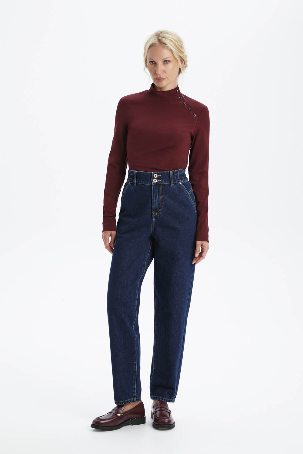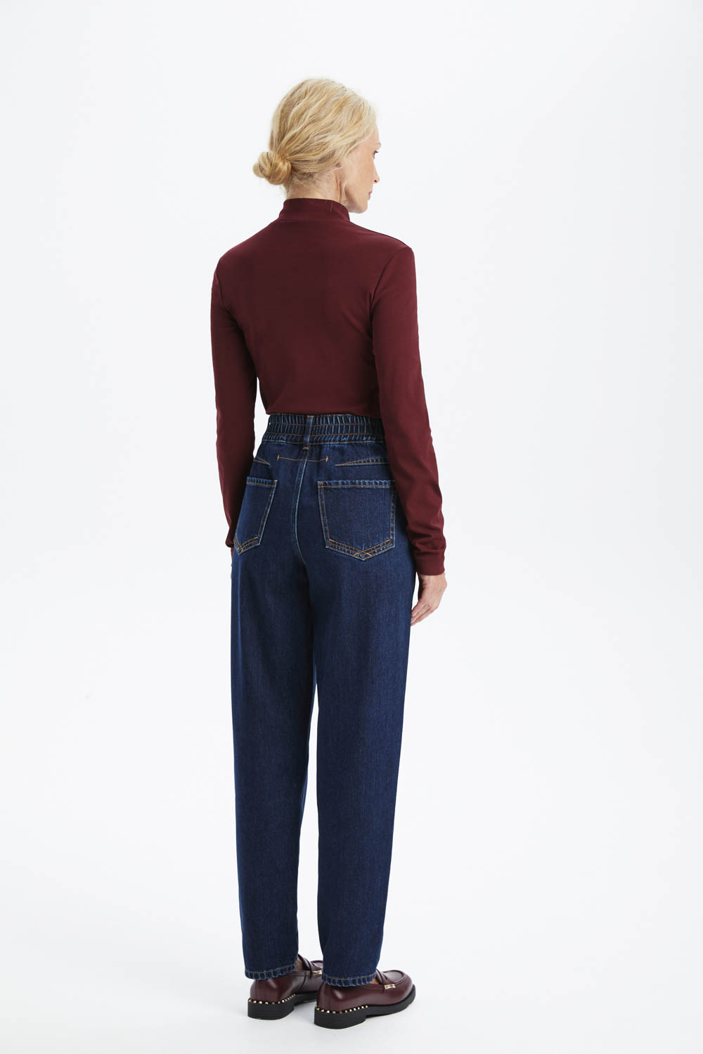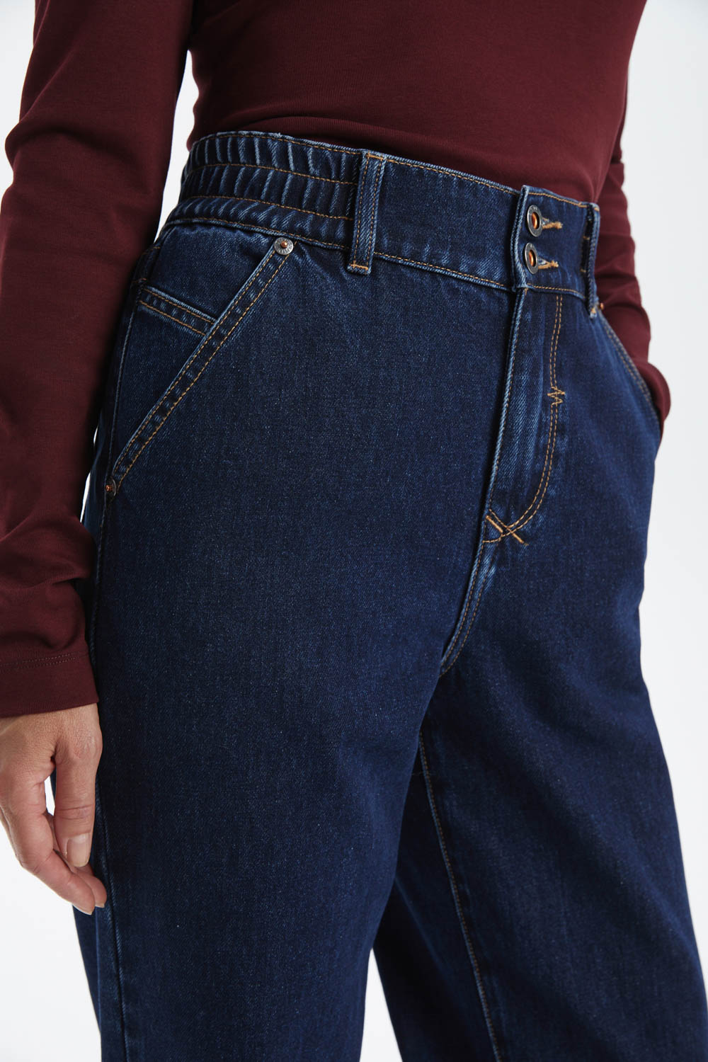 Джинсы прямые с завышенной посадкой. Джинсы mom fit прямого кроя выполнены из плотного денима глубокого синего оттенка. Высокая посадка с комфортным поясом на резинке и эластичной вставкой сзади обеспечивает удобство, сохраняя актуальный силуэт.