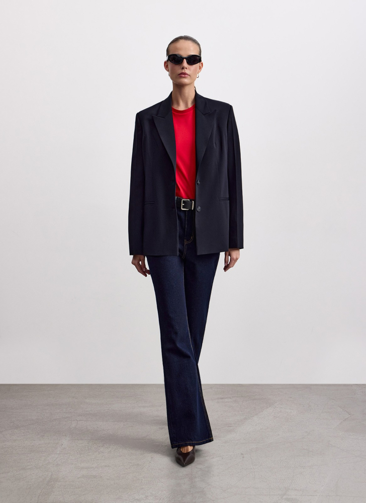 Прямой крой на чуть завышенной посадке подходит разным типам фигуры и создаёт сбалансированный силуэт.