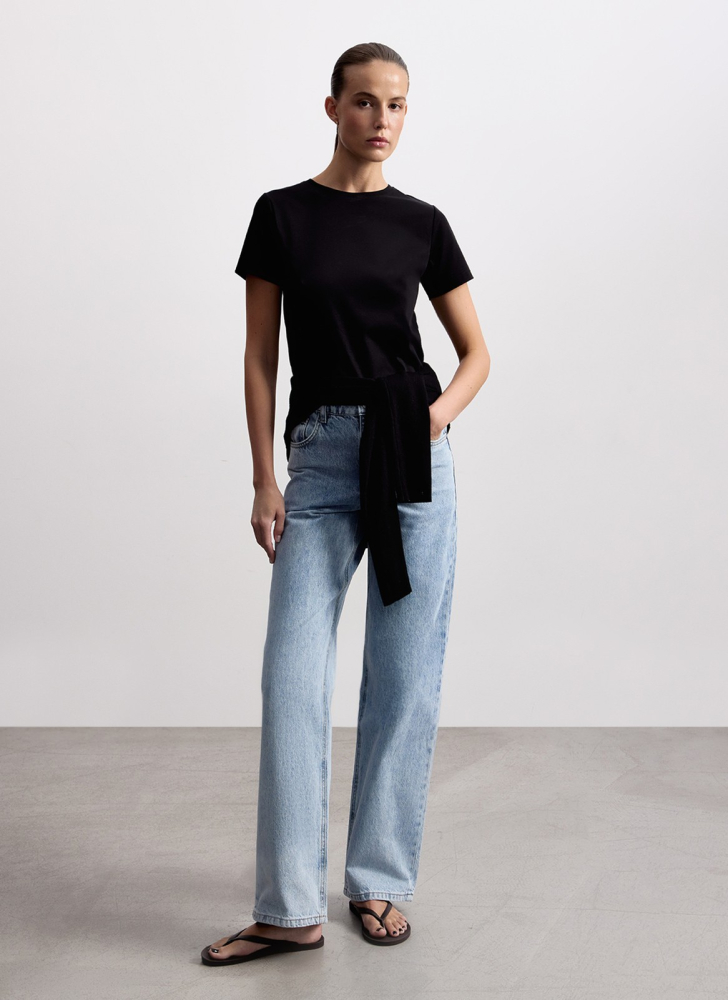 Прямой крой на чуть завышенной посадке подходит разным типам фигуры и создаёт сбалансированный силуэт.