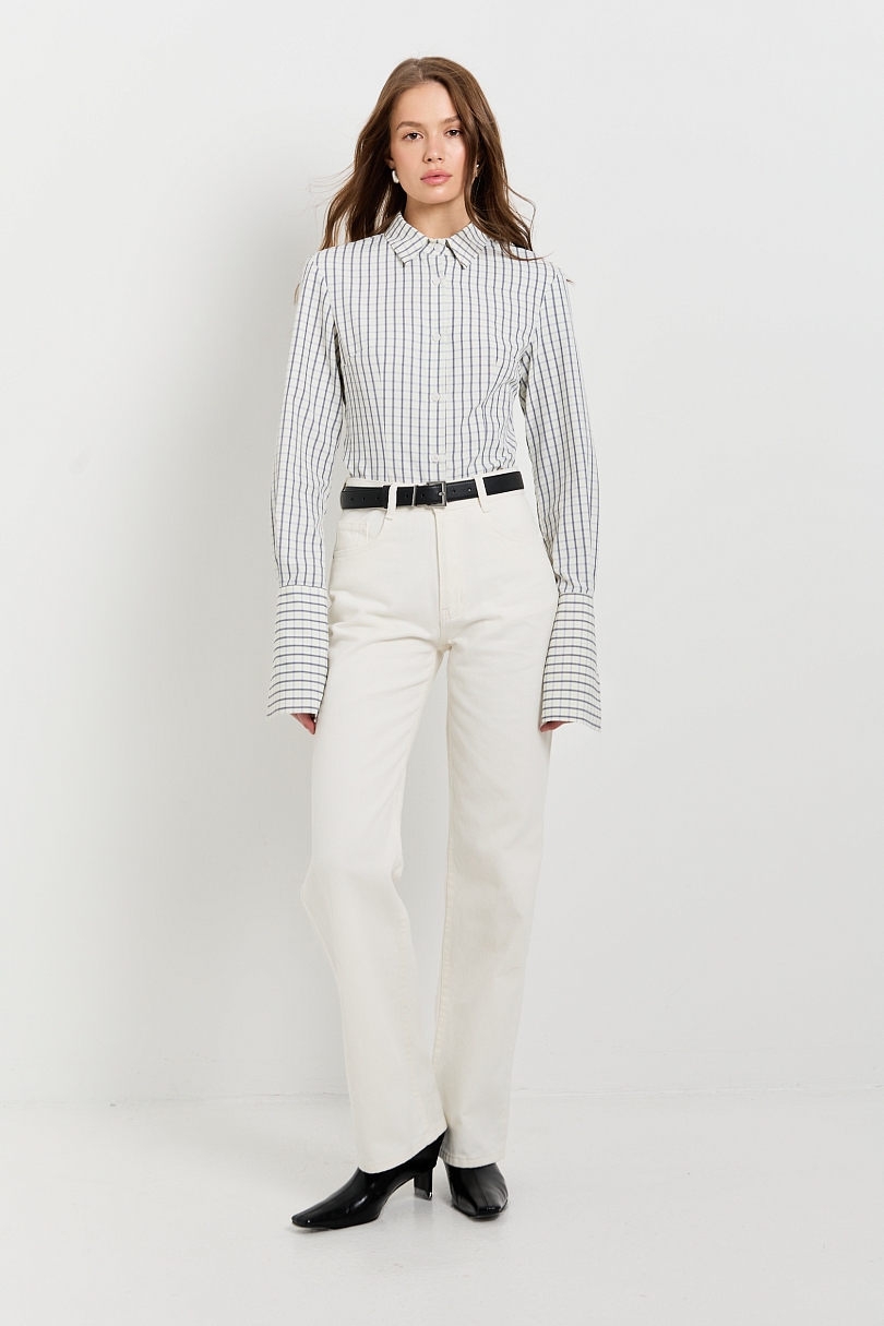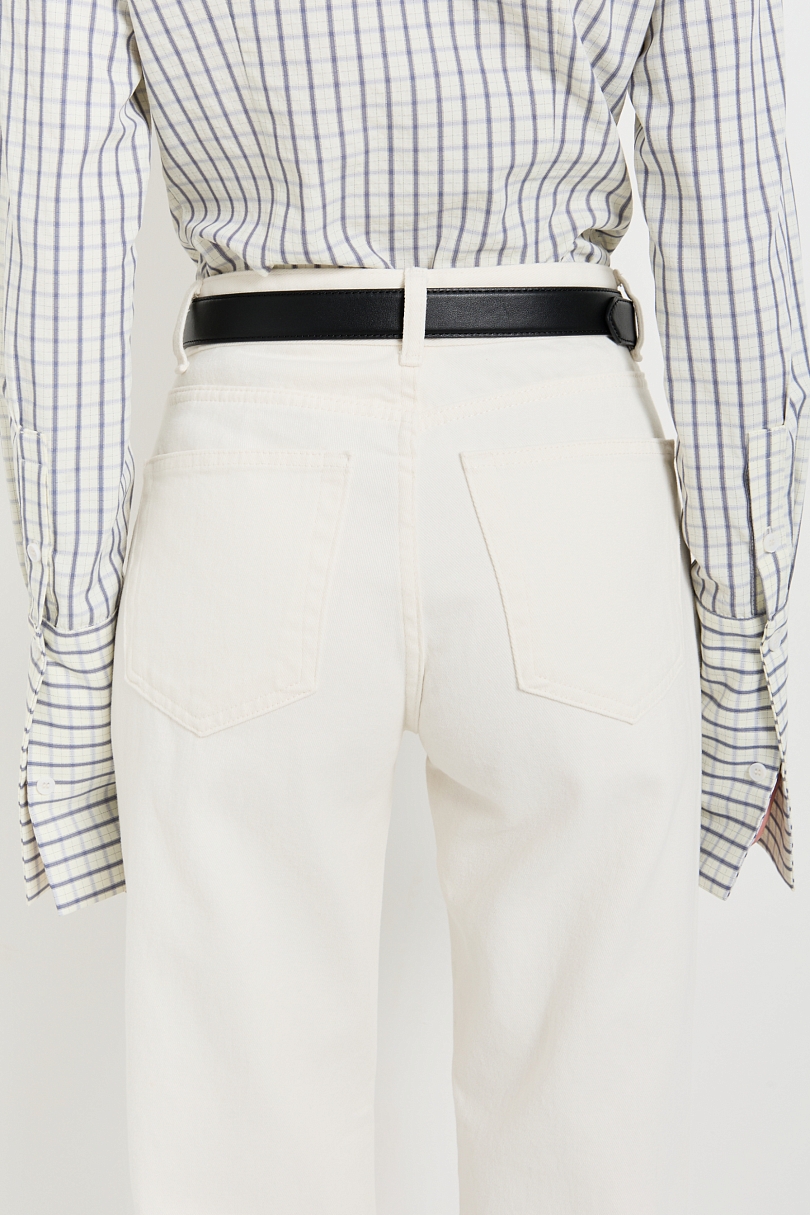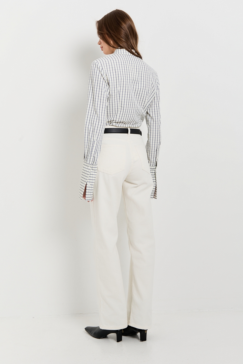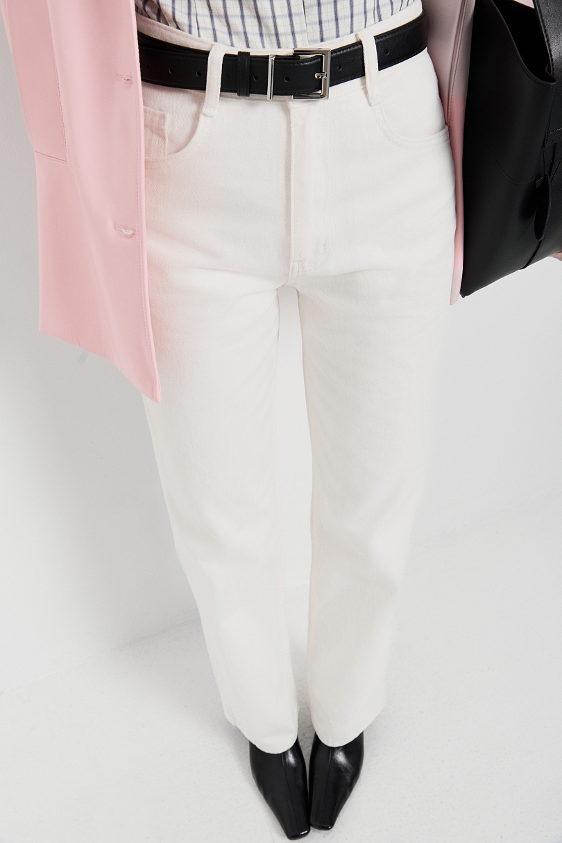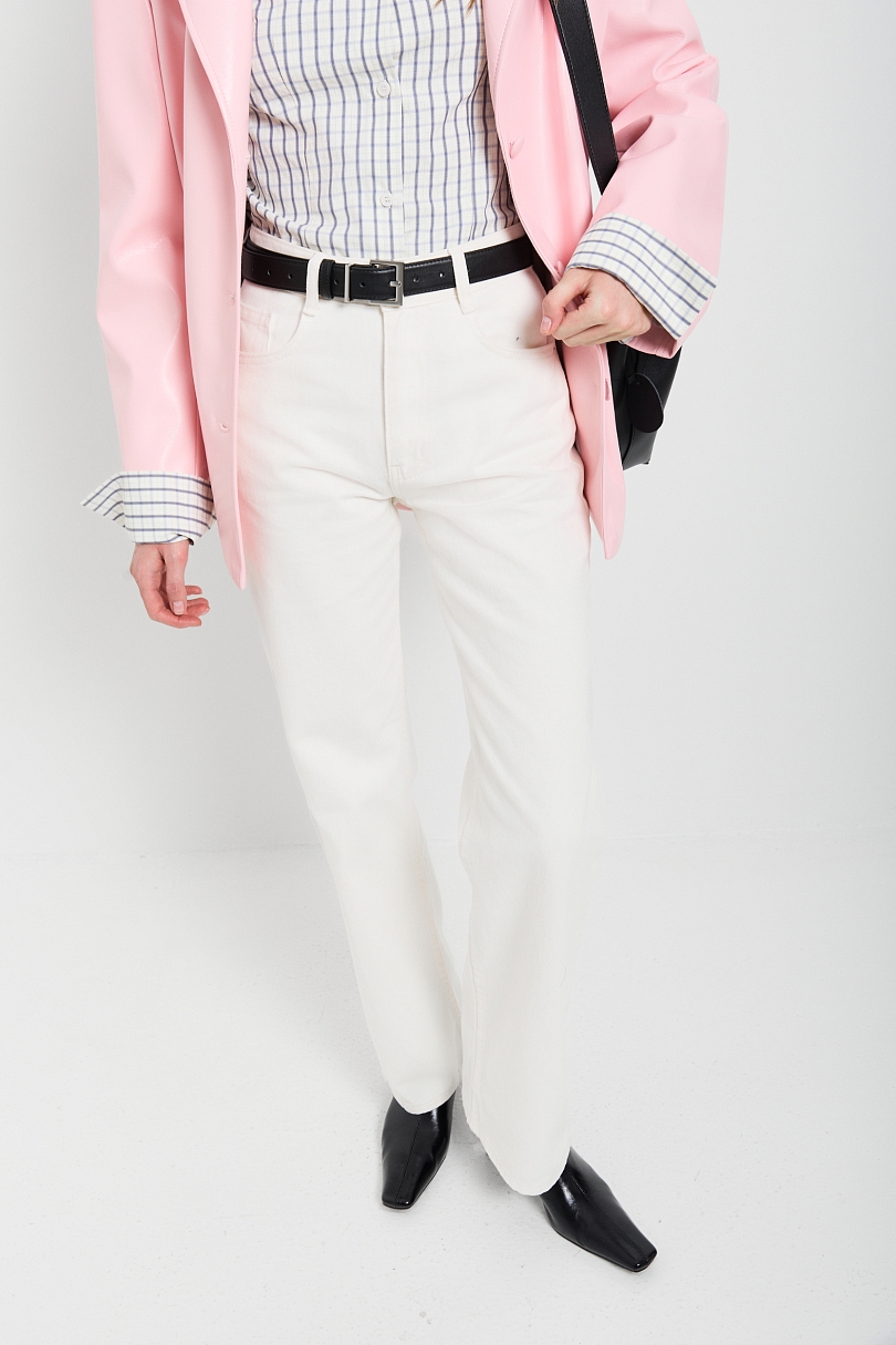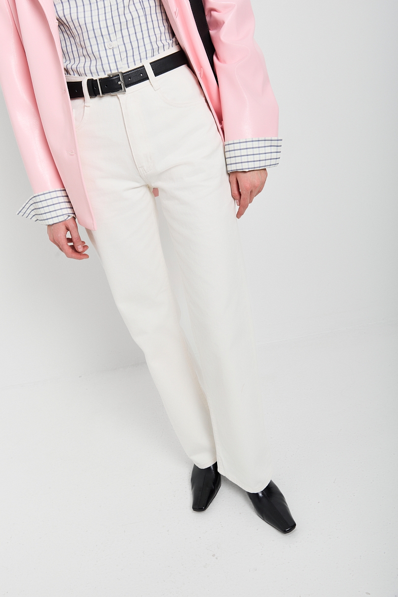 Джинсы прямого кроя — универсальная базовая модель, которая выглядит свежо и аккуратно. Прямой силуэт обеспечивает комфортную посадку и визуально вытягивает фигуру, а нежный молочный оттенок делает джинсы особенно лёгкими и современными.