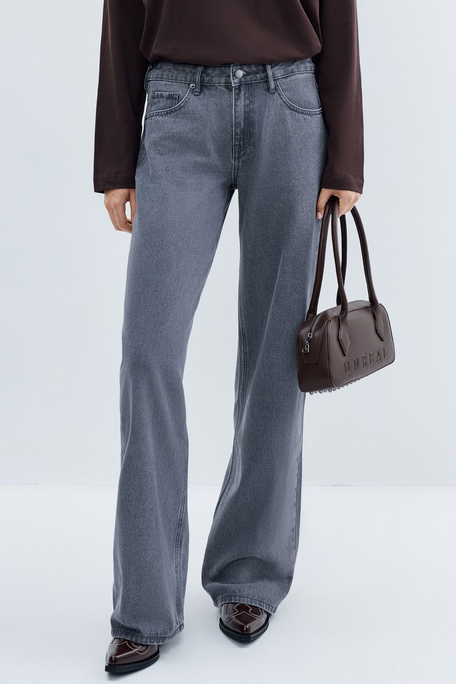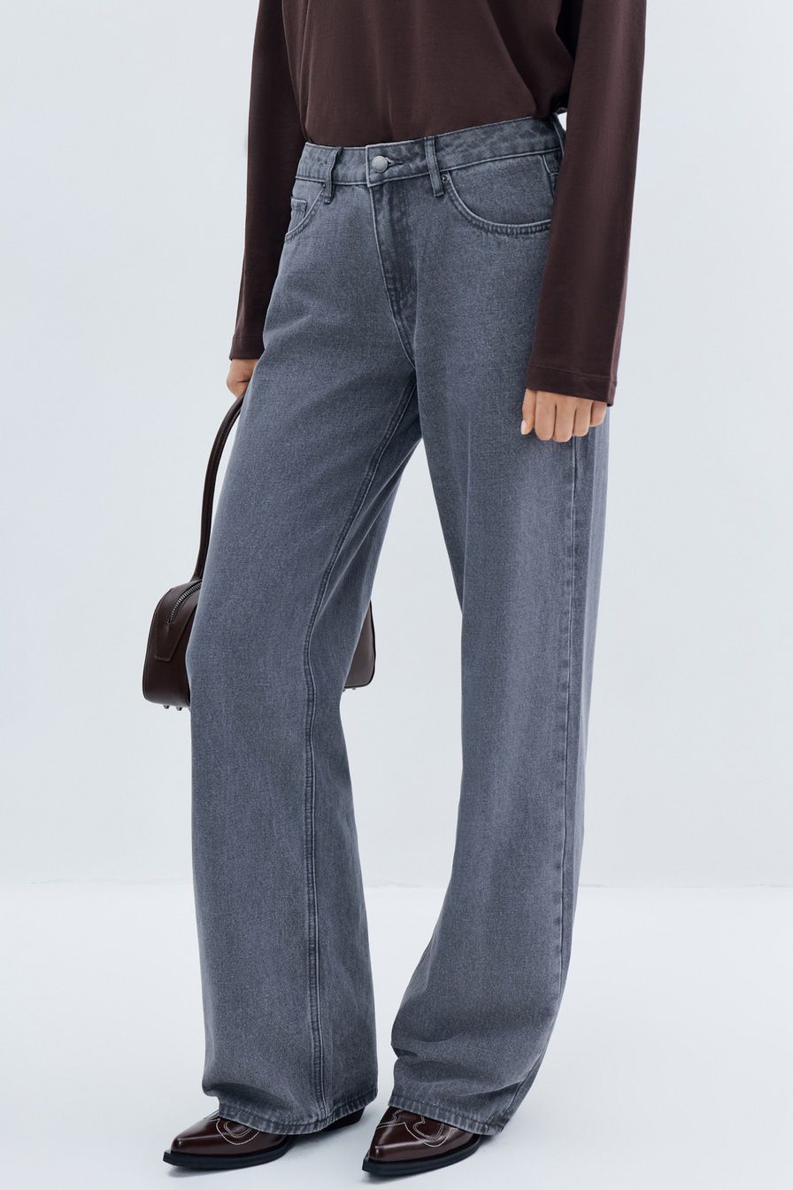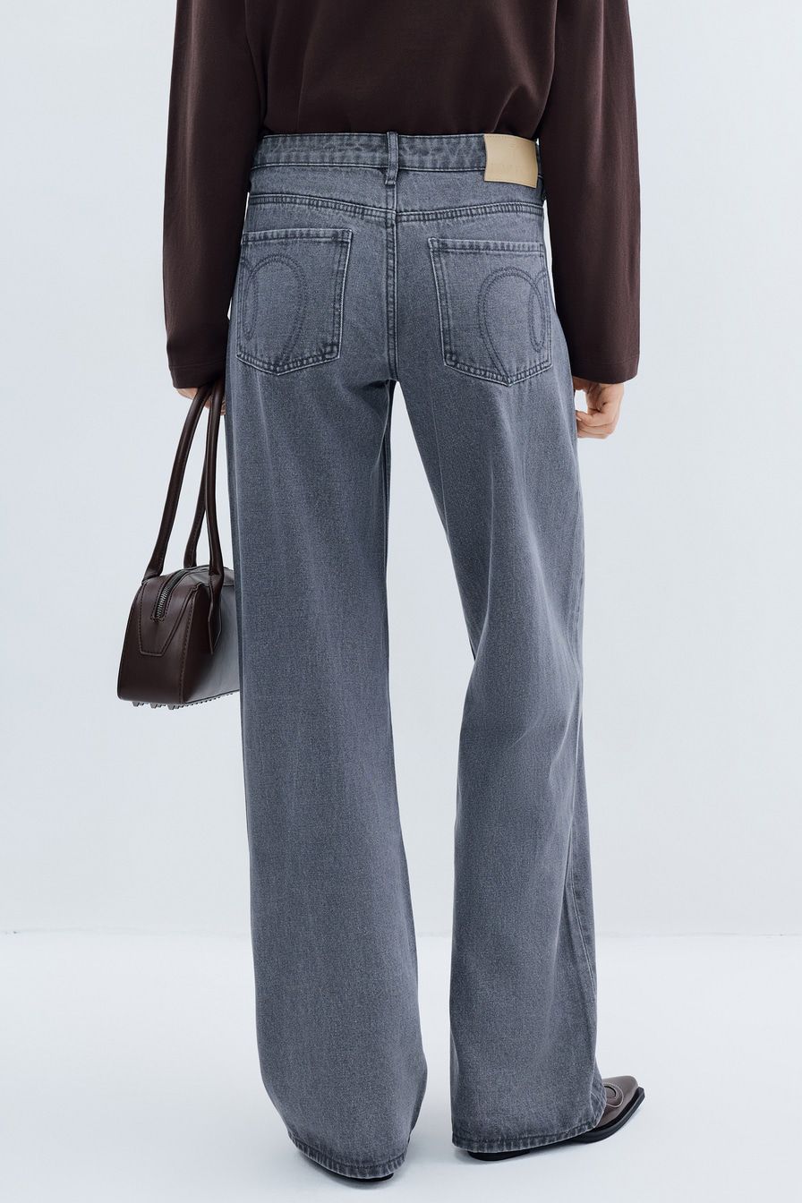 Широкие джинсы прямого кроя из смесового хлопка – модель серого цвета со средней посадкой. Задние карманы декорированы узорной вышивкой.