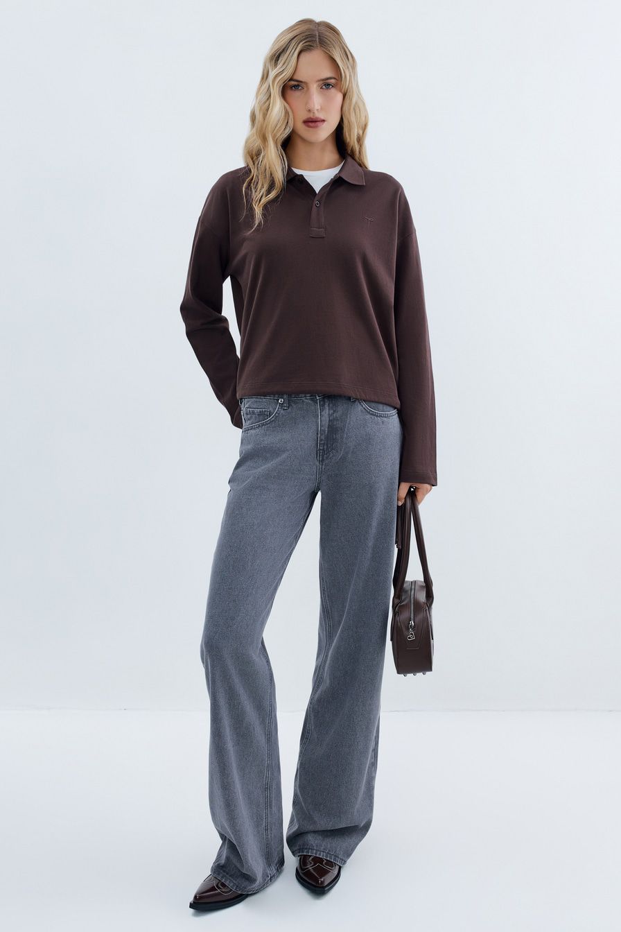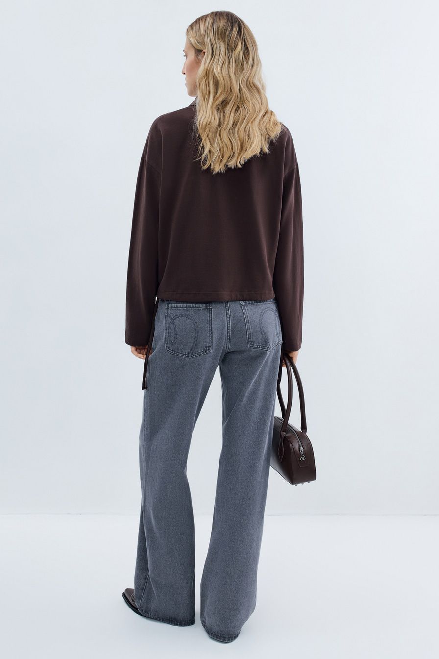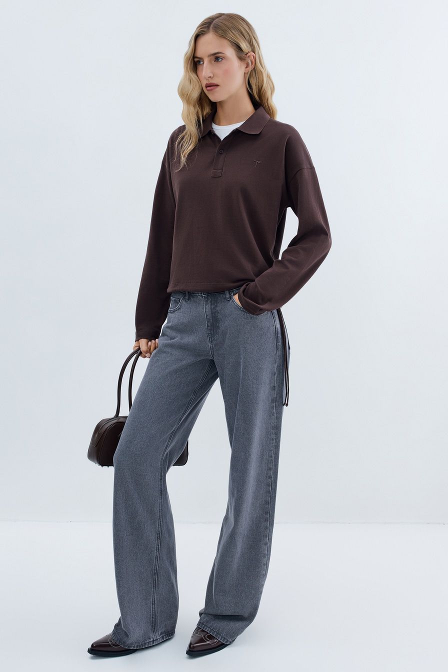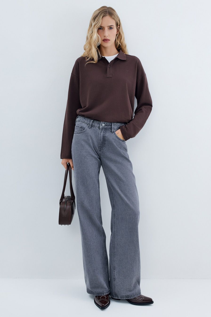 Широкие джинсы прямого кроя из смесового хлопка – модель серого цвета со средней посадкой. Задние карманы декорированы узорной вышивкой.