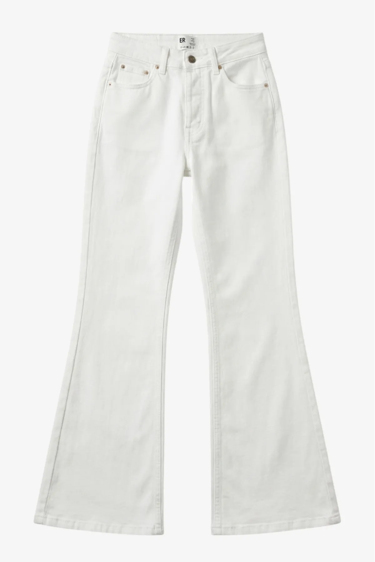 Модель по фигуре с лёгким расклешением книзу и высокой талией, которая красиво подчеркивает силуэт и вытягивает ноги. Классический чистый белый цвет делает их универсальными и элегантными одновременно. Носите с рубашкой и трикотажем из новой коллекции ERIST