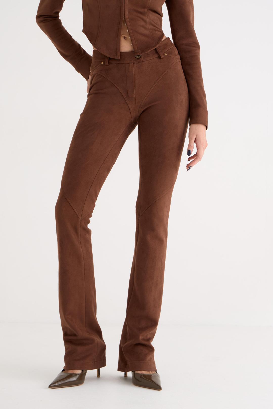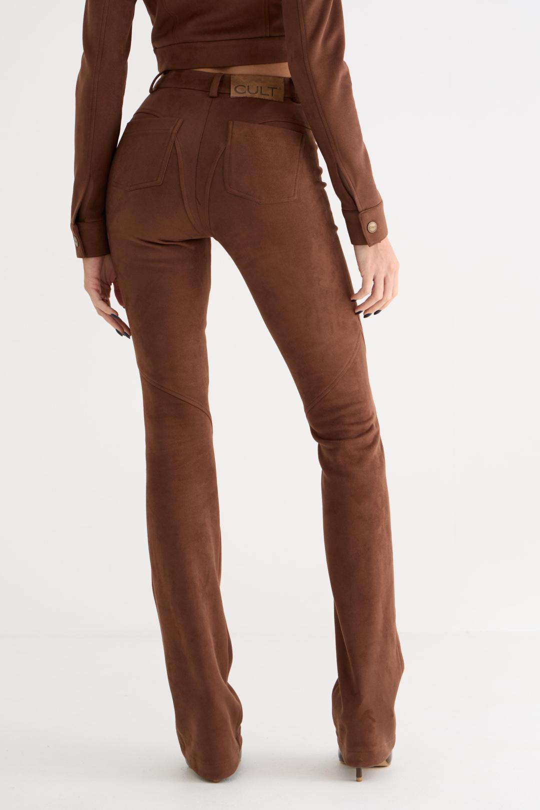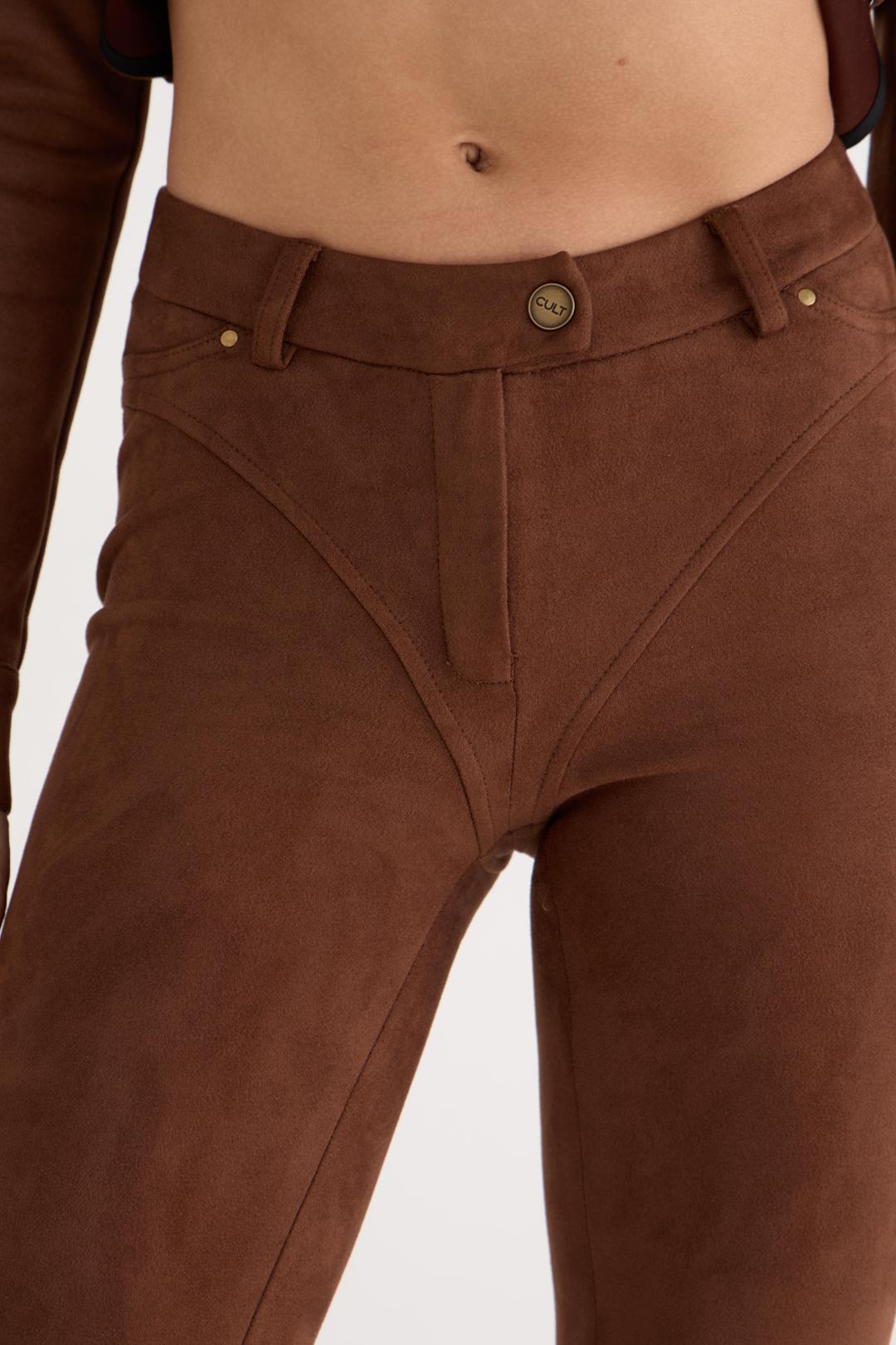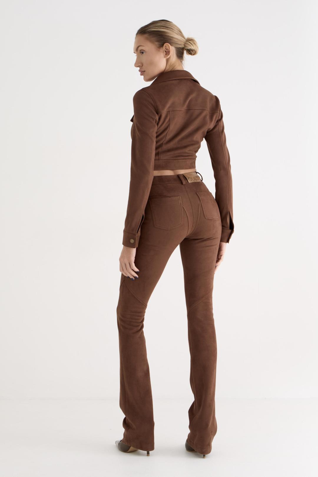 Брюки силуэта 'cigarette' из замши с фигурными резами и боковыми карманами в отрезном бочке. Сзади накладные карманы и нашивка с логотипом бренда. Застежка гульфик на молнию и кнопку.