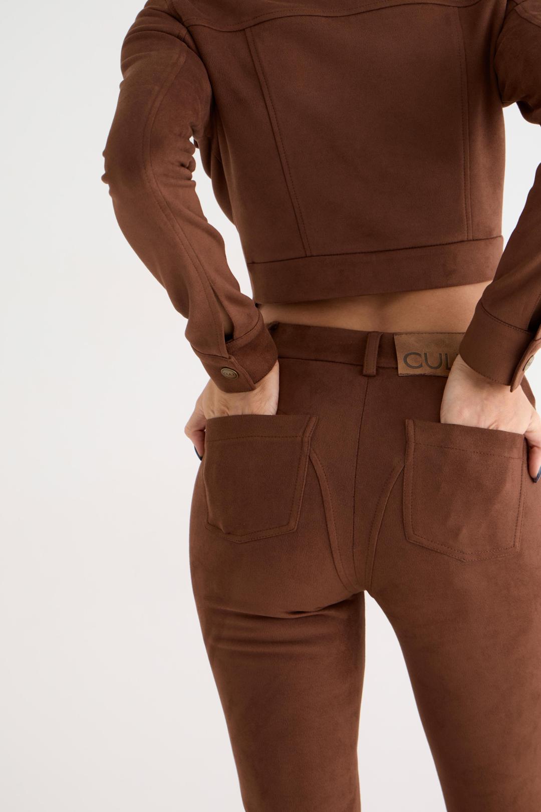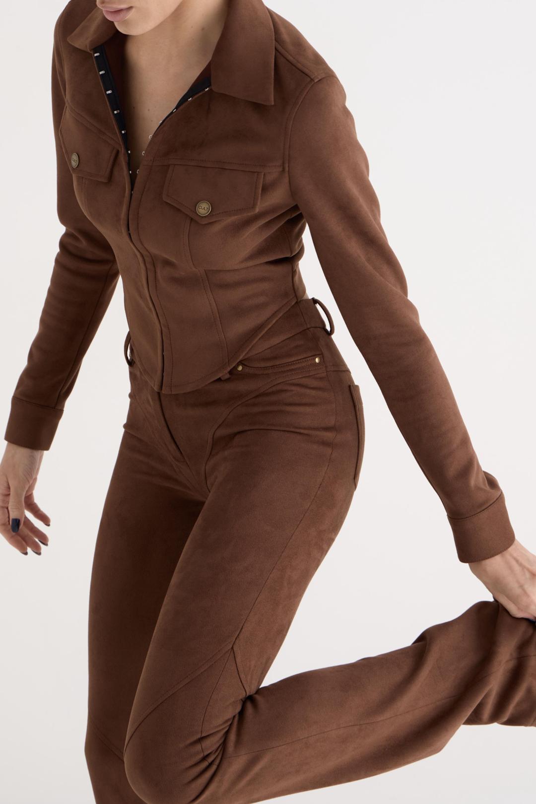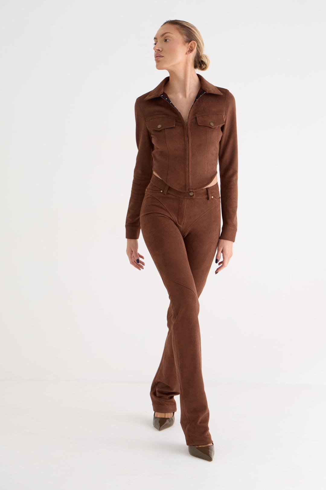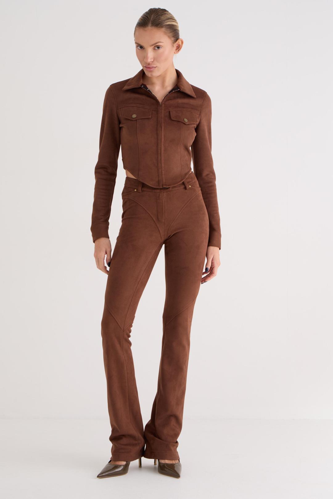 Брюки силуэта 'cigarette' из замши с фигурными резами и боковыми карманами в отрезном бочке. Сзади накладные карманы и нашивка с логотипом бренда. Застежка гульфик на молнию и кнопку.