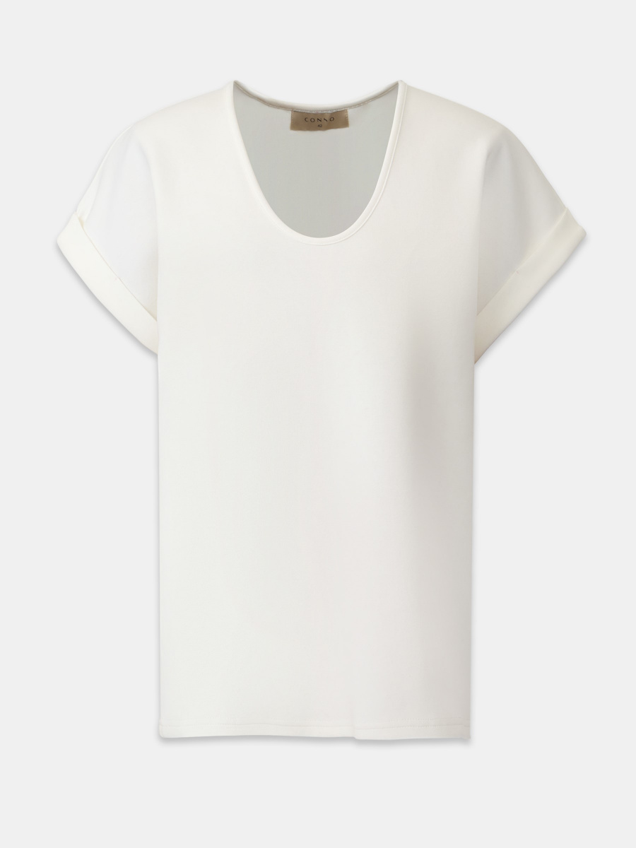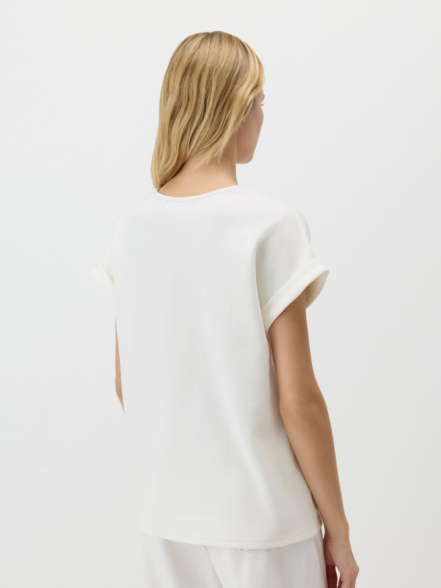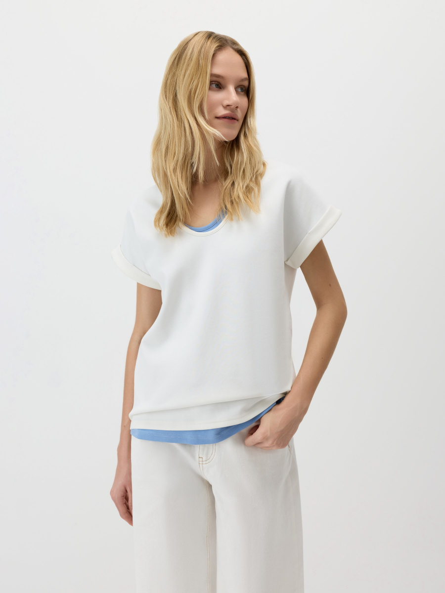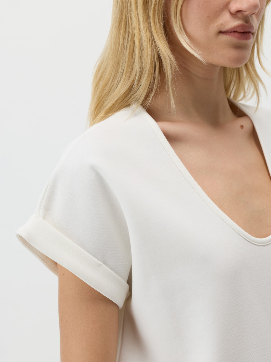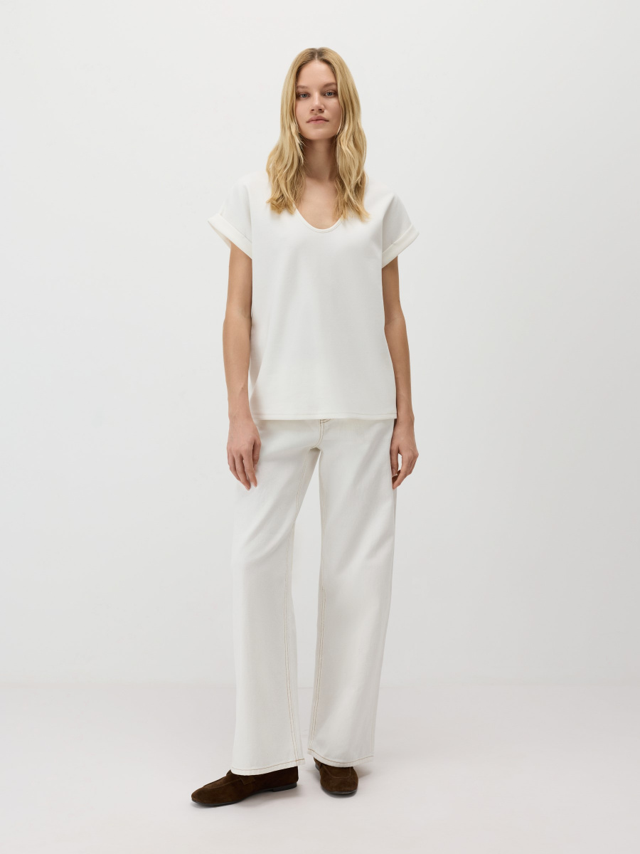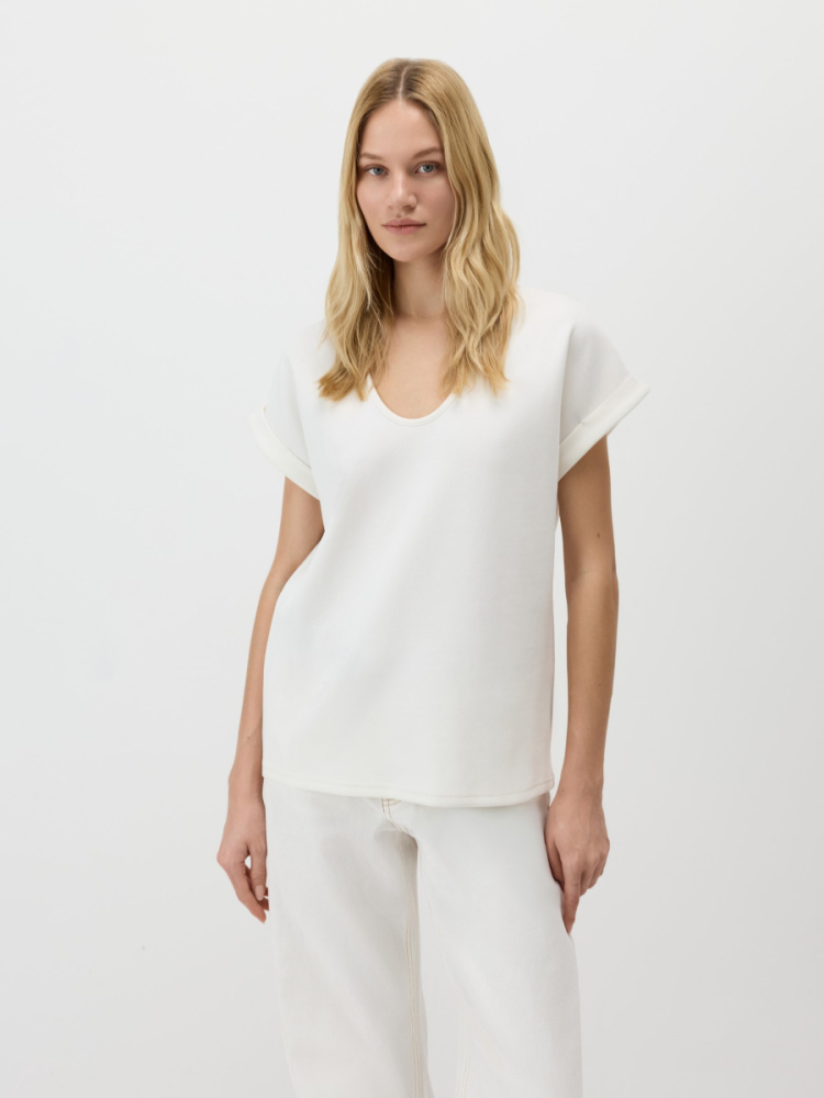 Базовая футболка с миндалевидным вырезом, которую комфортно носить весь день. Прямая расслабленная посадка и оптимальная длина до линии бедер. Свободный цельнокроеный рукав с зафиксированным манжетом образует мягкий контур плеча. Материал: тонкий хлопковый неофутер с добавлением искусственных волокон для сохранения формы и цвета.