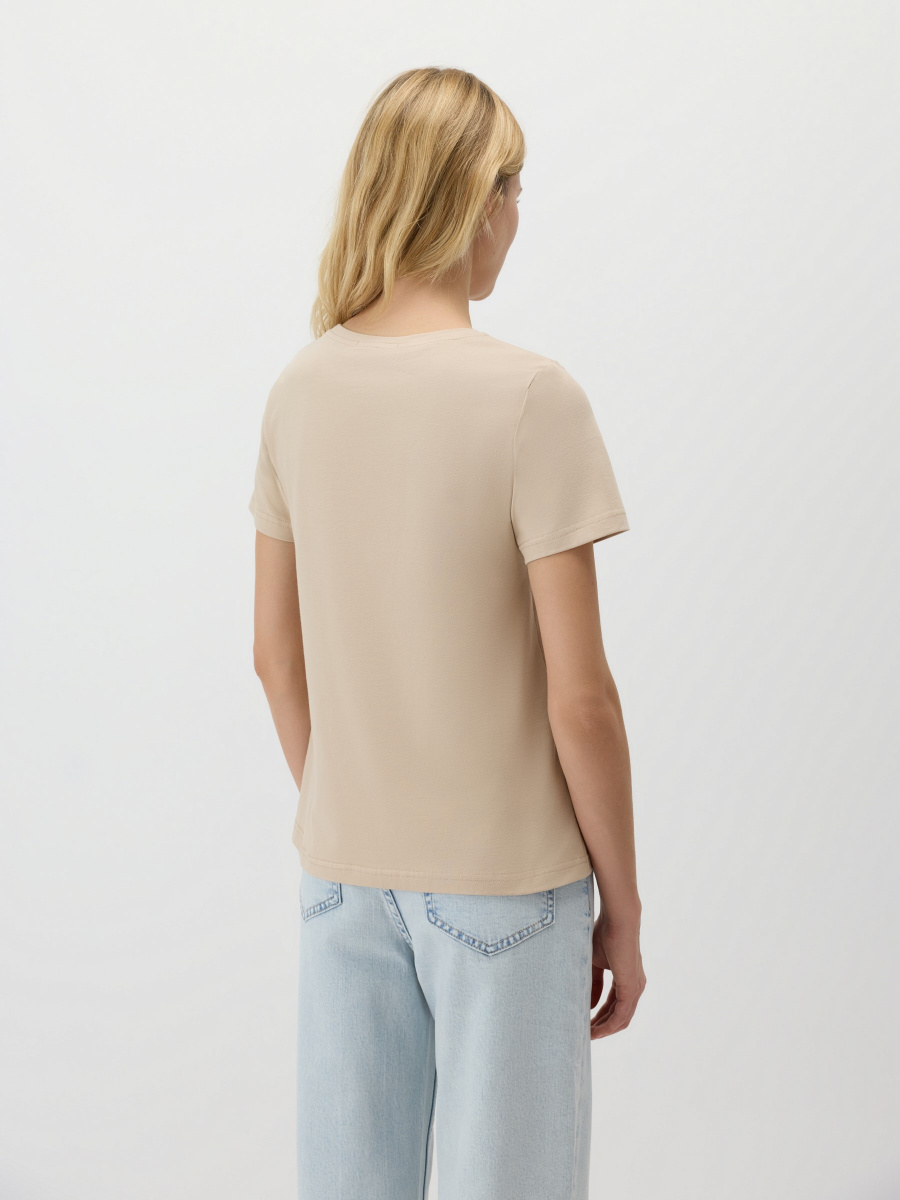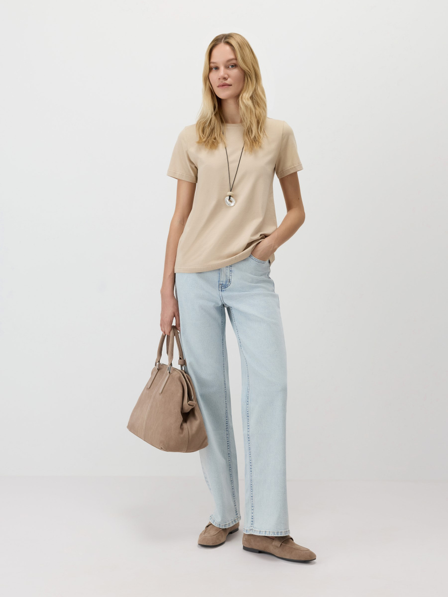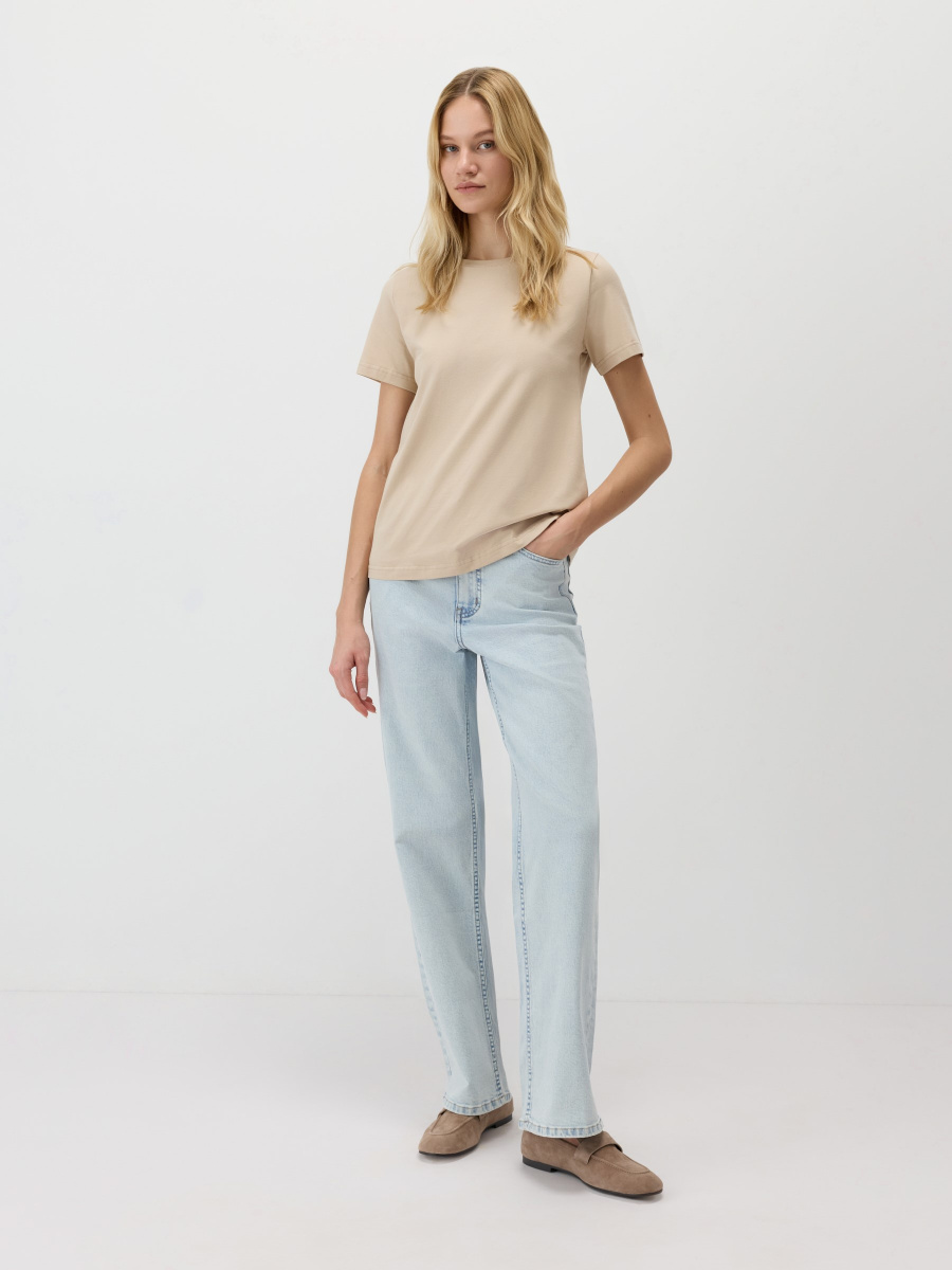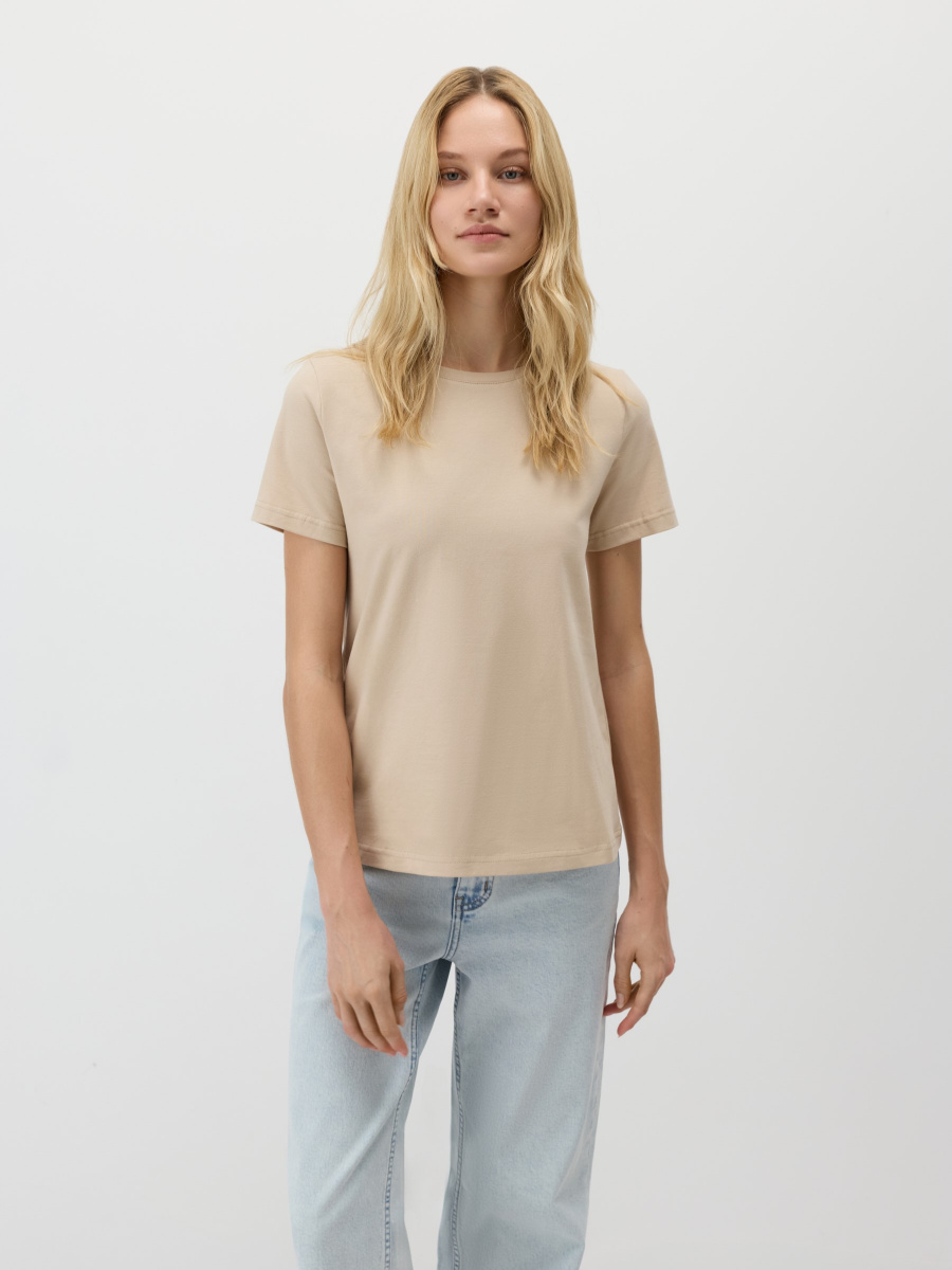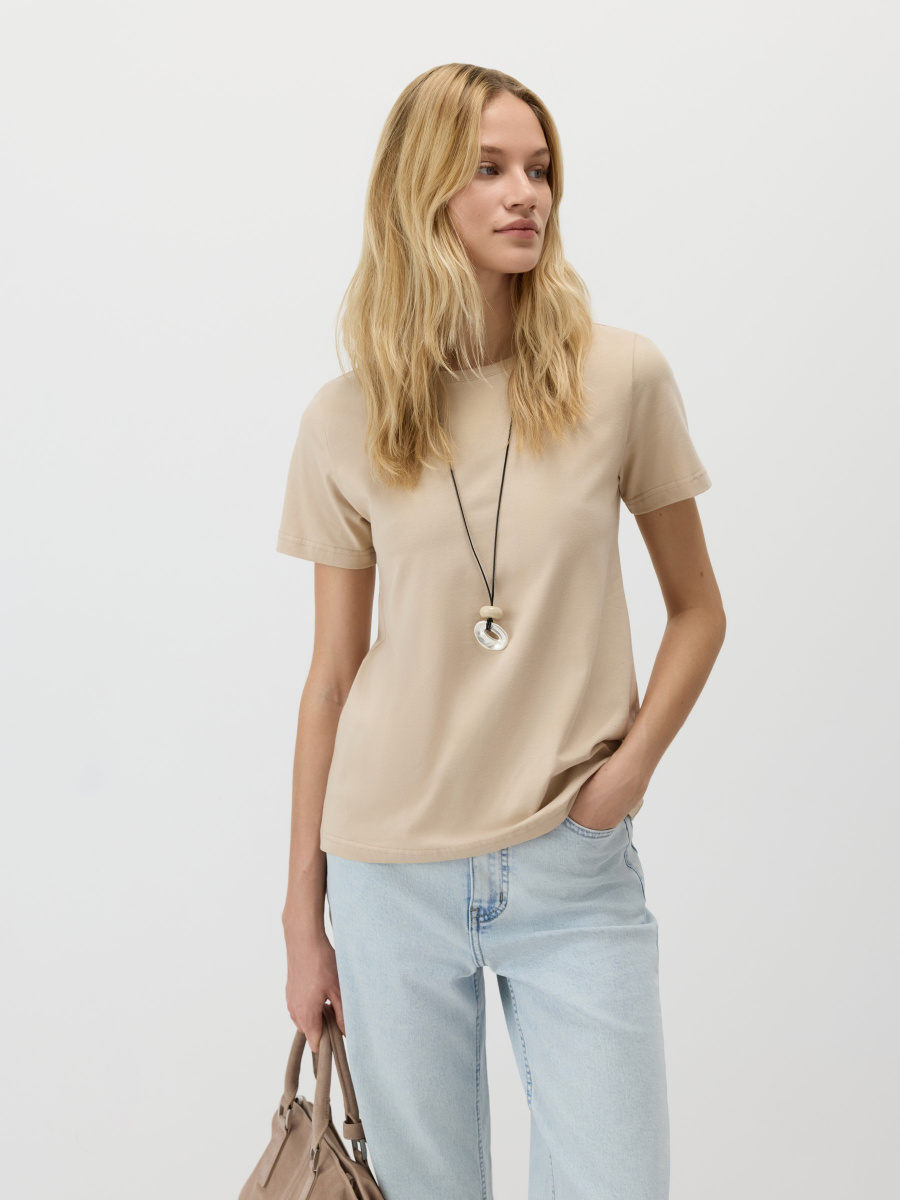 Универсальная базовая футболка — полуприлегающего силуэта, среднего облегания без обтягивания и с классическим круглым вырезом. Длина до линии бедер позволяет легко заправлять или носить изделие навыпуск. Мягкий хлопок с лайкрой обеспечивает комфорт и чуть тянется, адаптируясь под особенности фигуры.