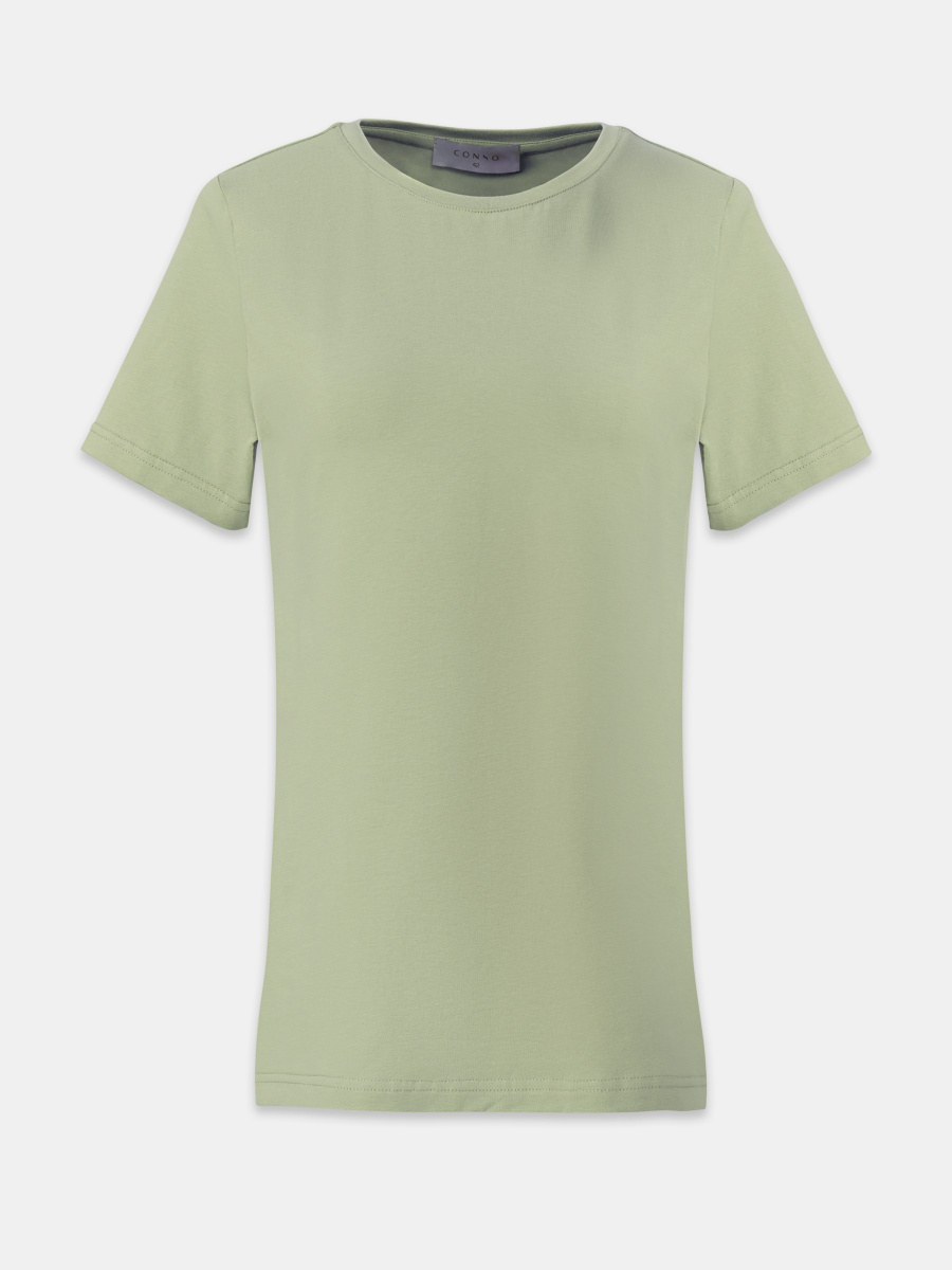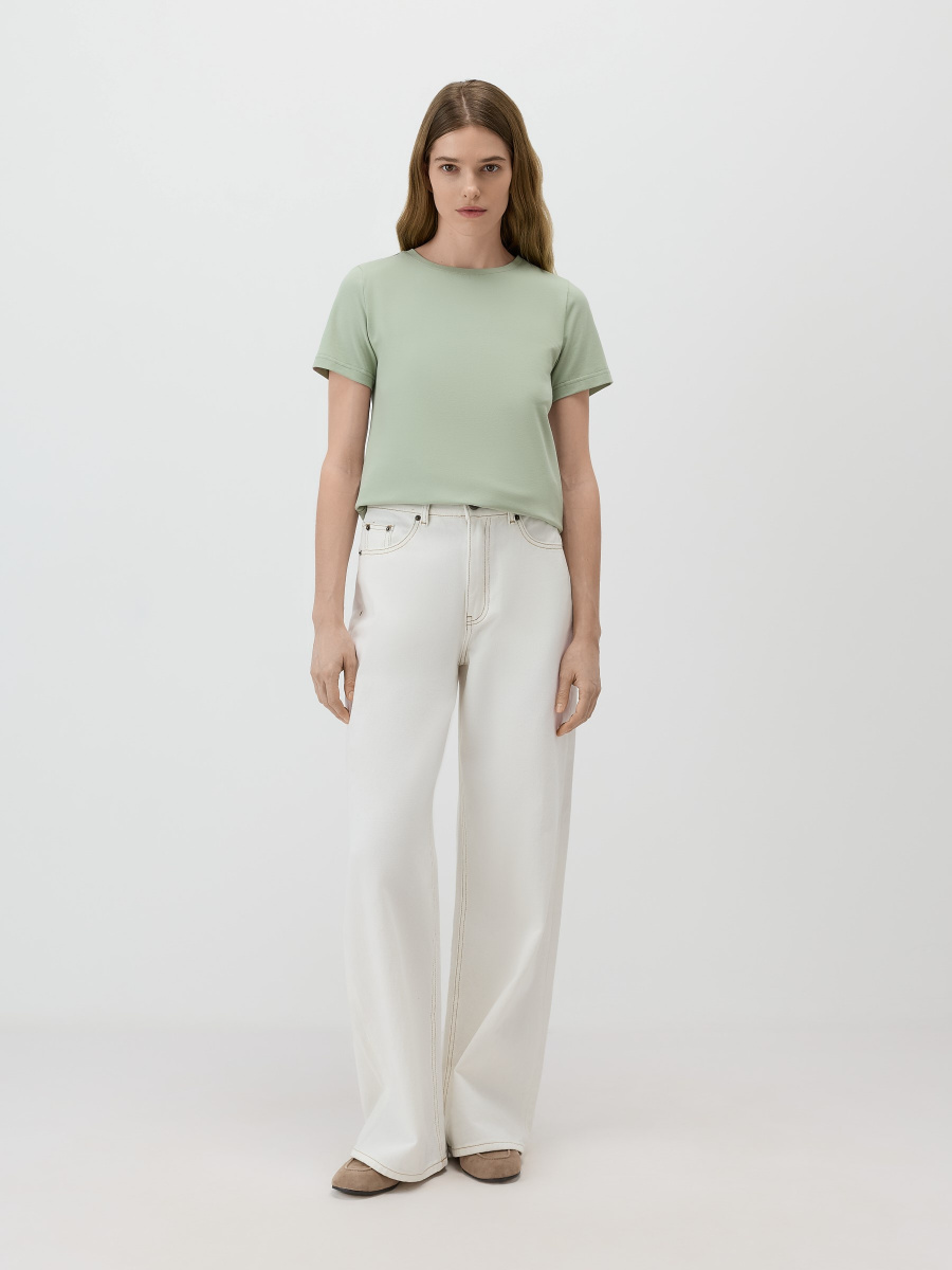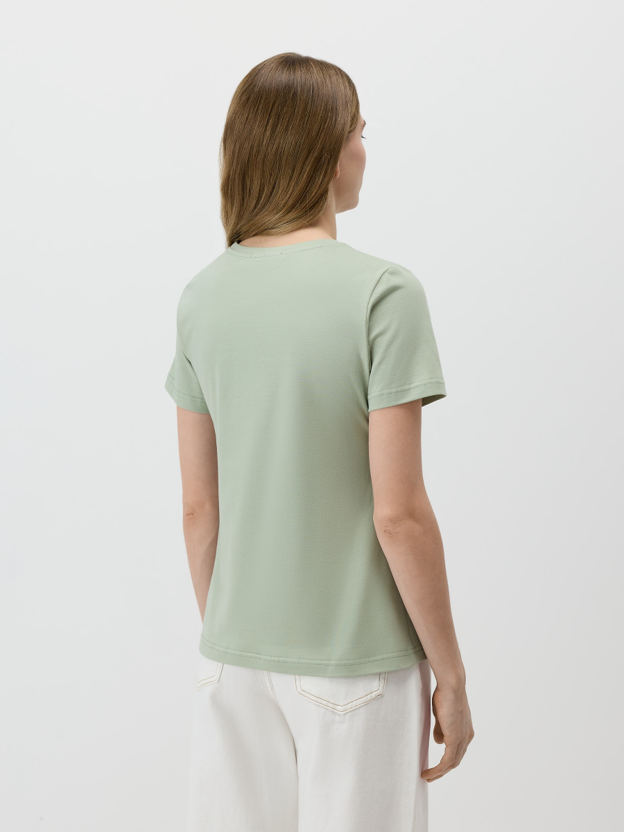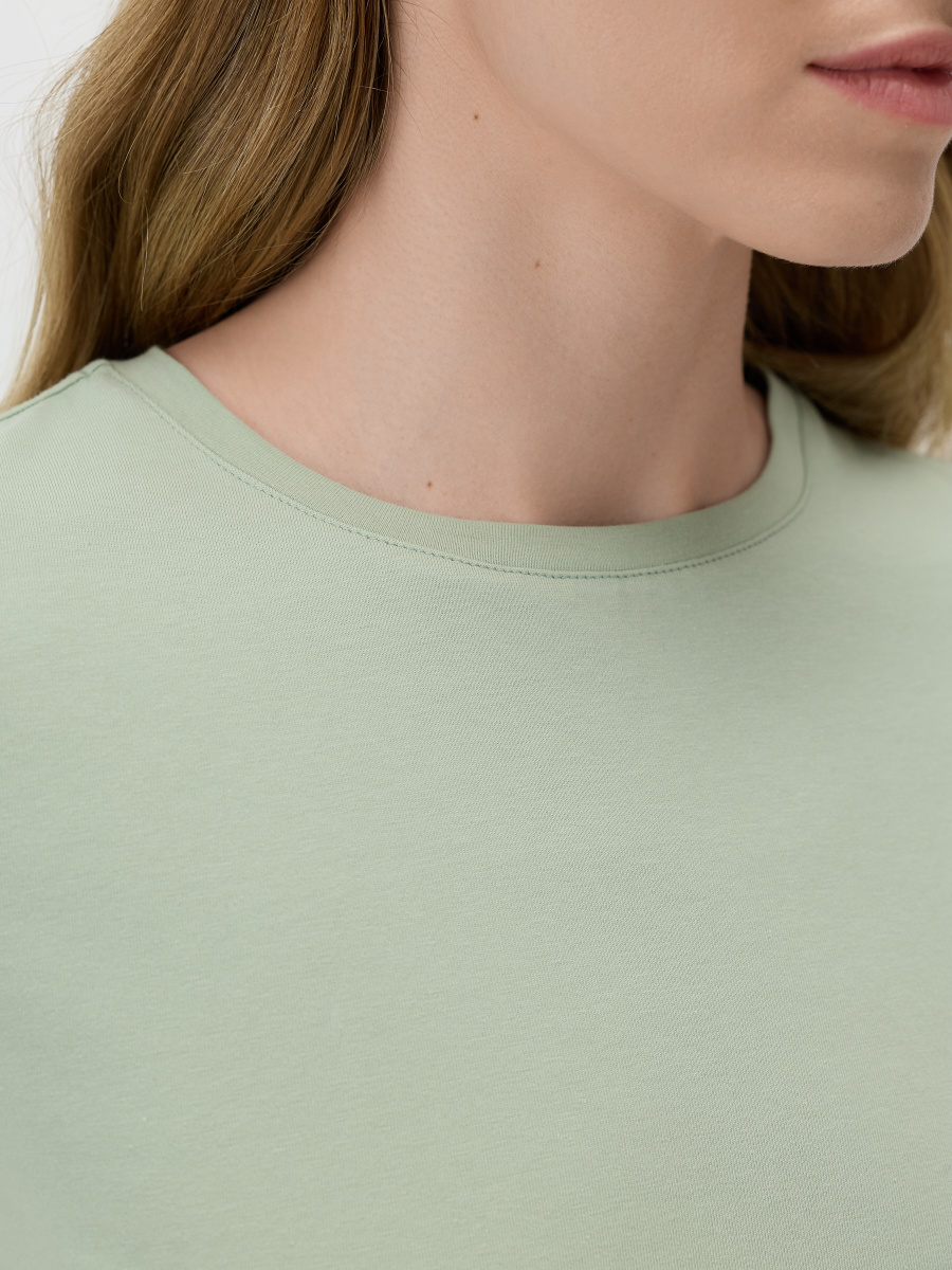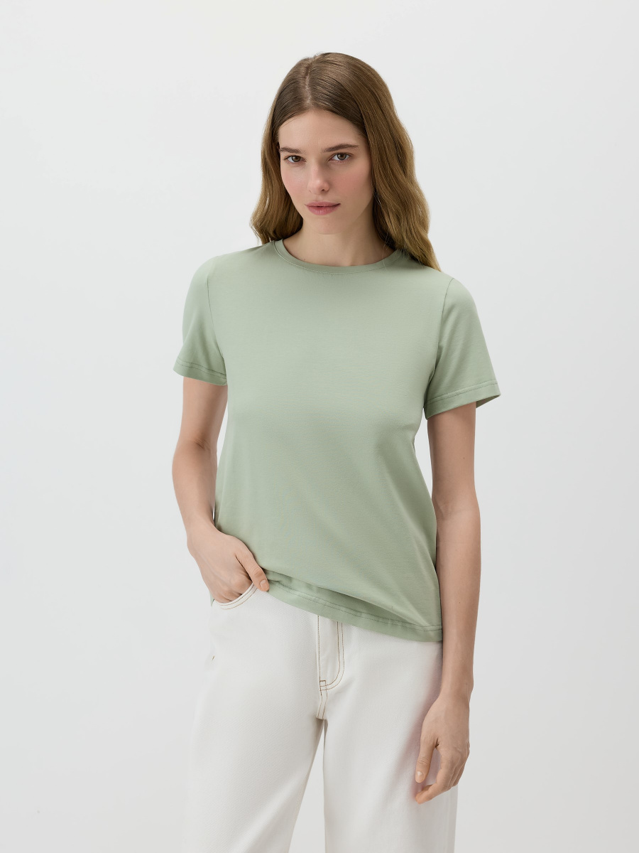 Универсальная базовая футболка — полуприлегающего силуэта, среднего облегания без обтягивания и с классическим круглым вырезом. Длина до линии бедер позволяет легко заправлять или носить изделие навыпуск. Мягкий хлопок с лайкрой обеспечивает комфорт и чуть тянется, адаптируясь под особенности фигуры.