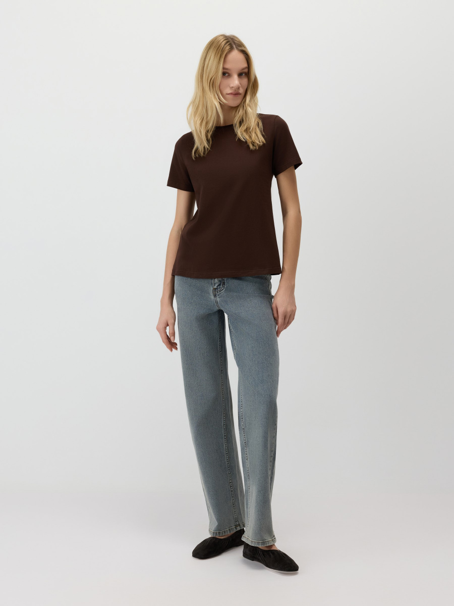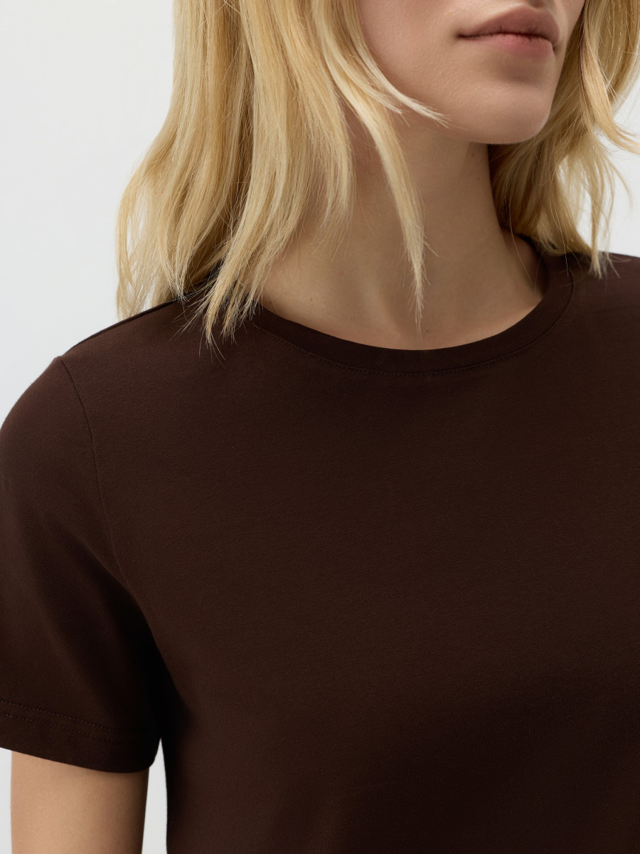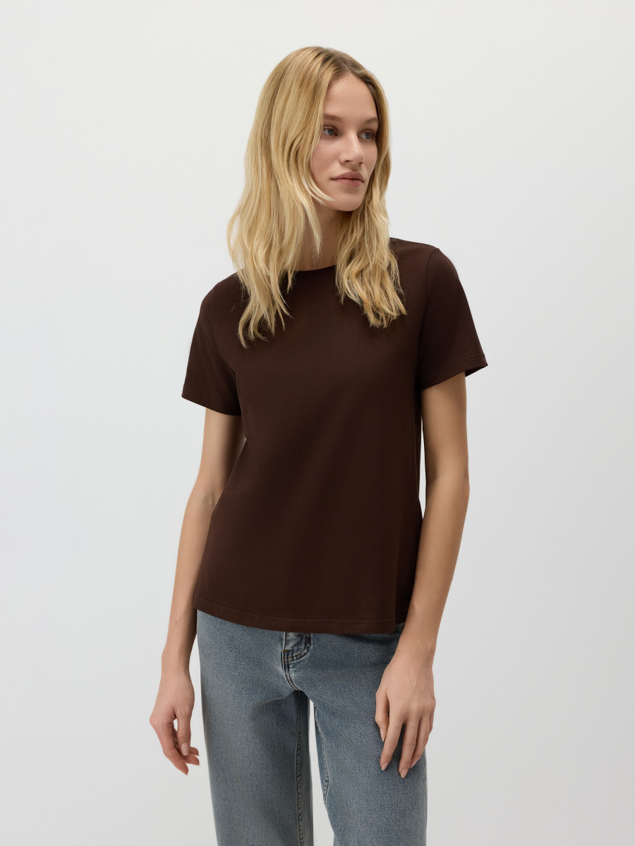 Универсальная базовая футболка — полуприлегающего силуэта, среднего облегания без обтягивания и с классическим круглым вырезом. Длина до линии бедер позволяет легко заправлять или носить изделие навыпуск. Мягкий хлопок с лайкрой обеспечивает комфорт и чуть тянется, адаптируясь под особенности фигуры.