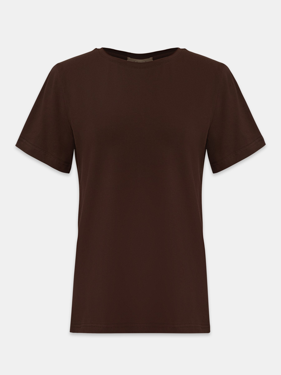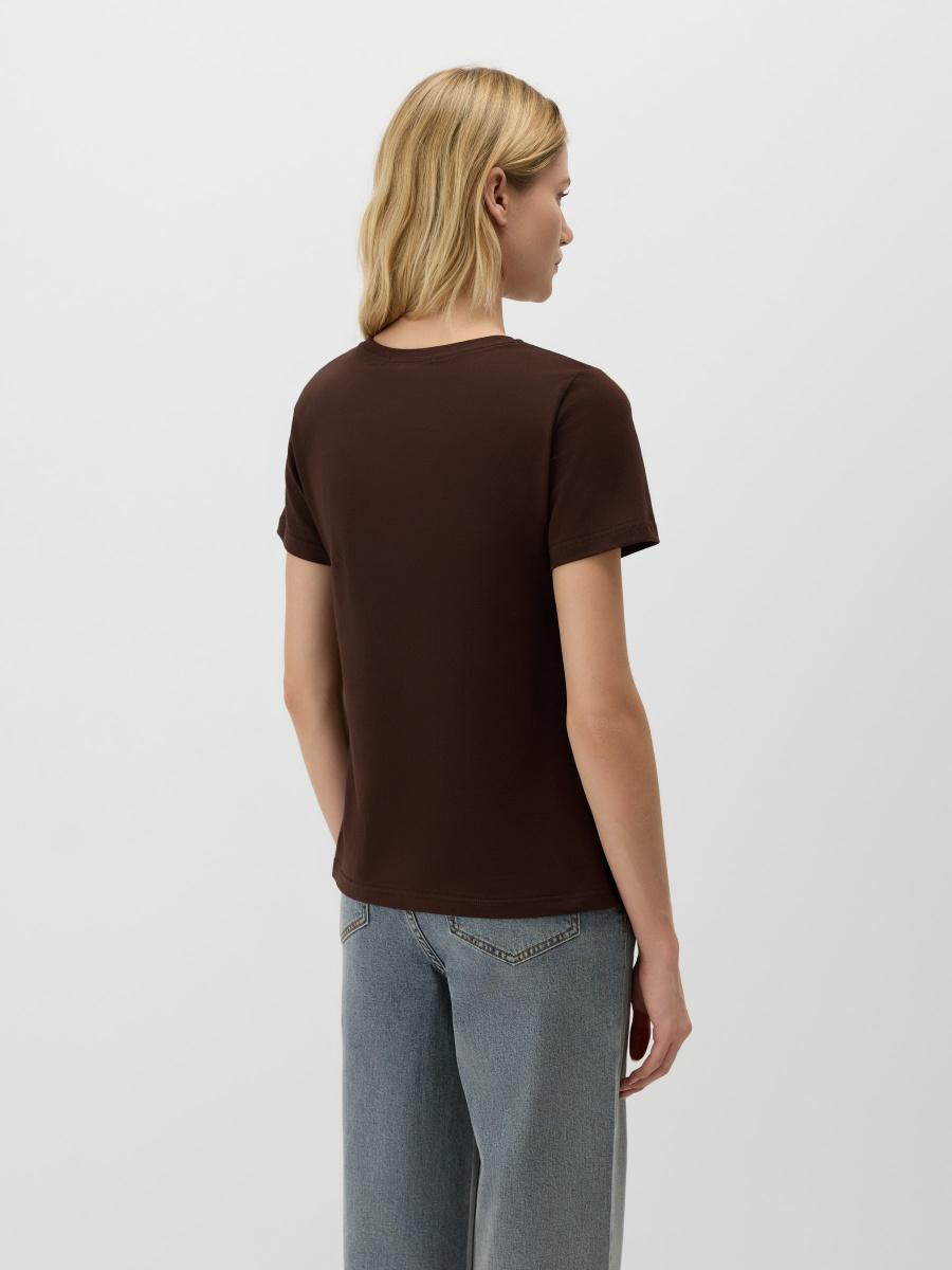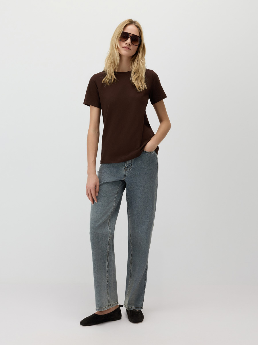 Универсальная базовая футболка — полуприлегающего силуэта, среднего облегания без обтягивания и с классическим круглым вырезом. Длина до линии бедер позволяет легко заправлять или носить изделие навыпуск. Мягкий хлопок с лайкрой обеспечивает комфорт и чуть тянется, адаптируясь под особенности фигуры.