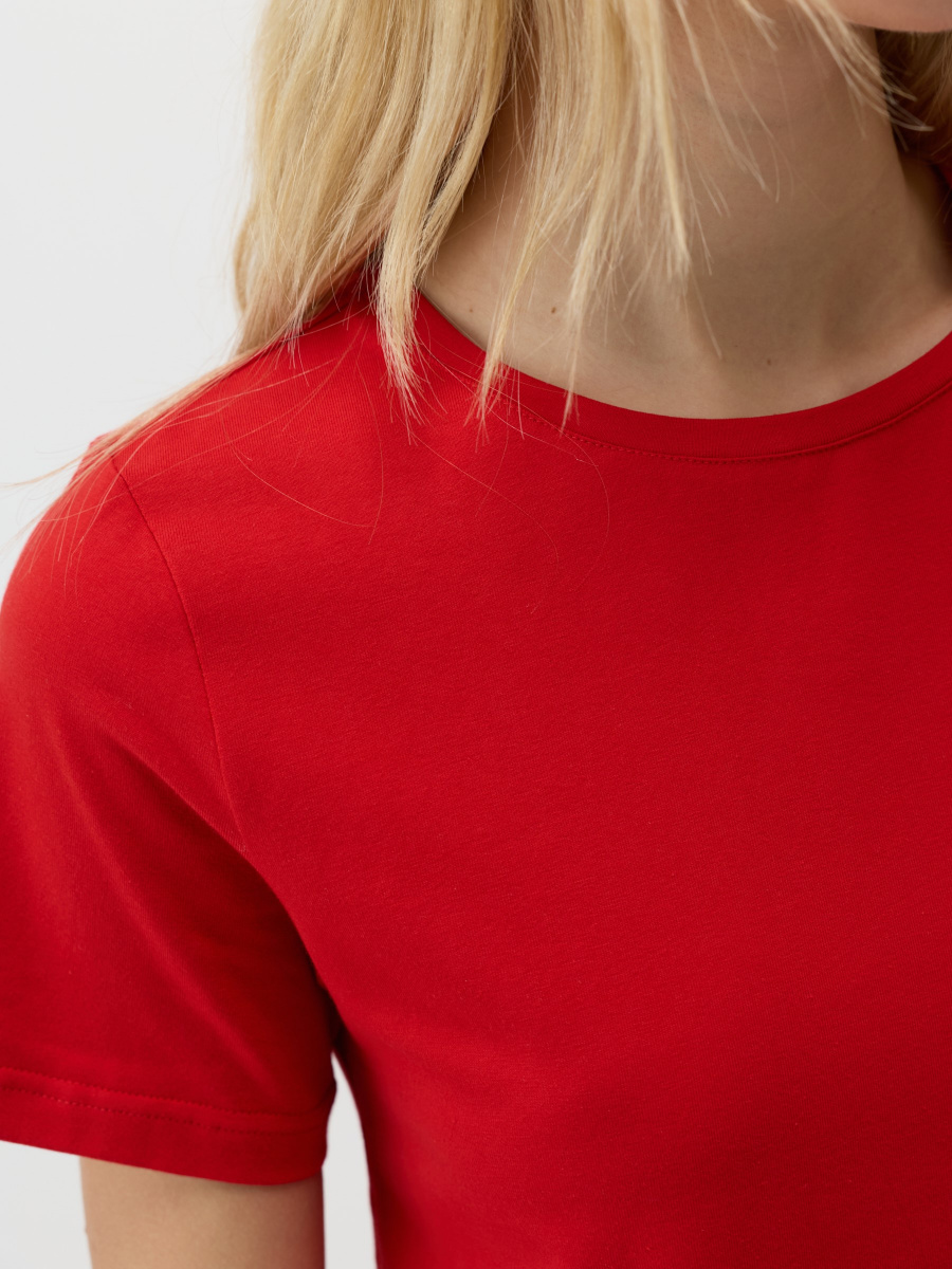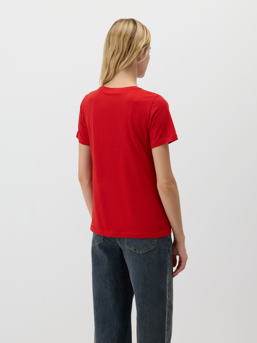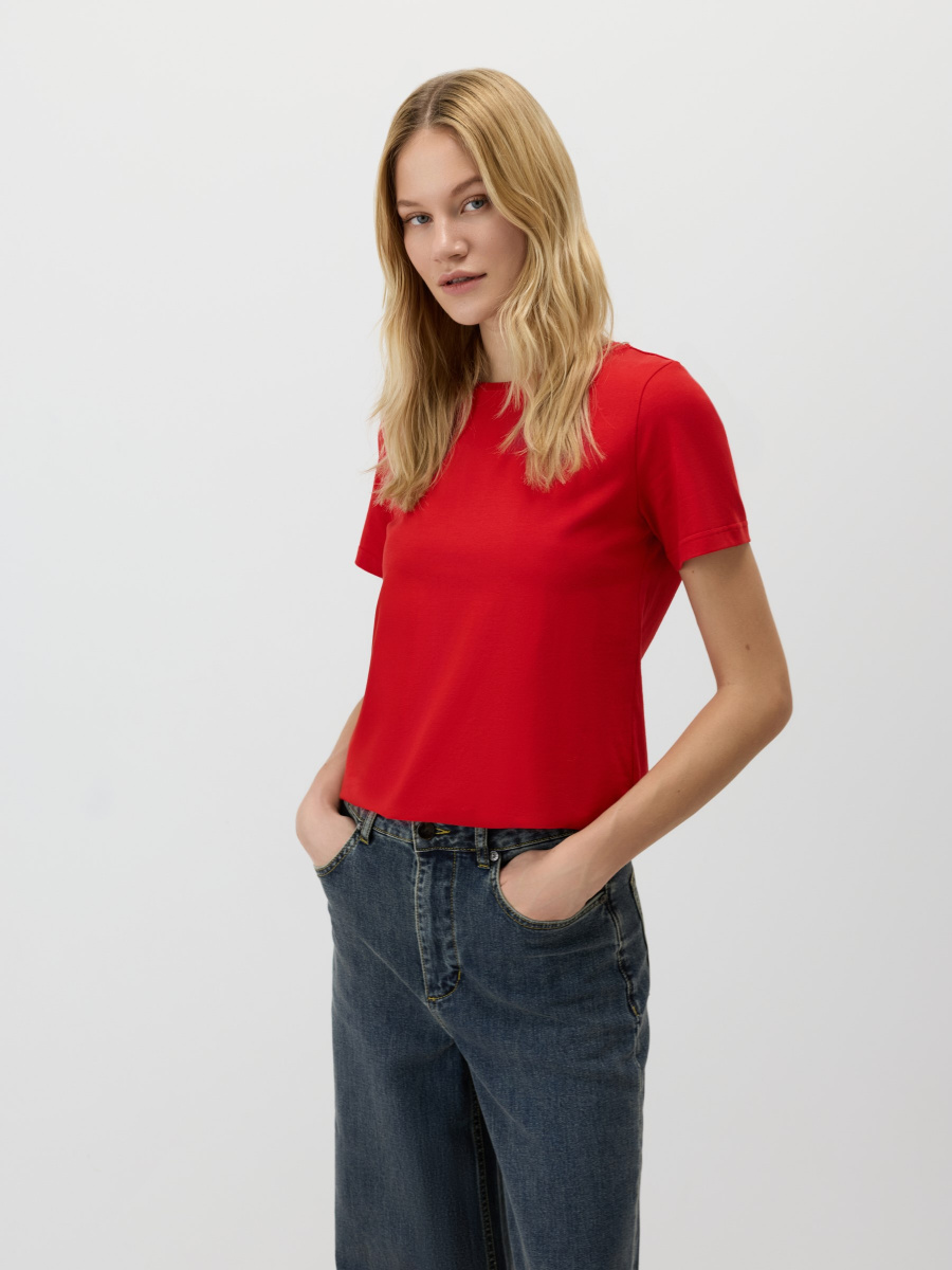 Универсальная базовая футболка — полуприлегающего силуэта, среднего облегания без обтягивания и с классическим круглым вырезом. Длина до линии бедер позволяет легко заправлять или носить изделие навыпуск. Мягкий хлопок с лайкрой обеспечивает комфорт и чуть тянется, адаптируясь под особенности фигуры.