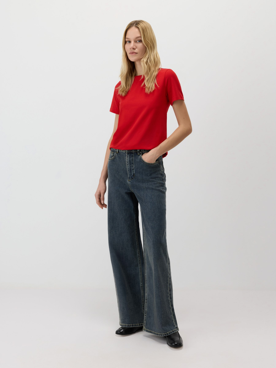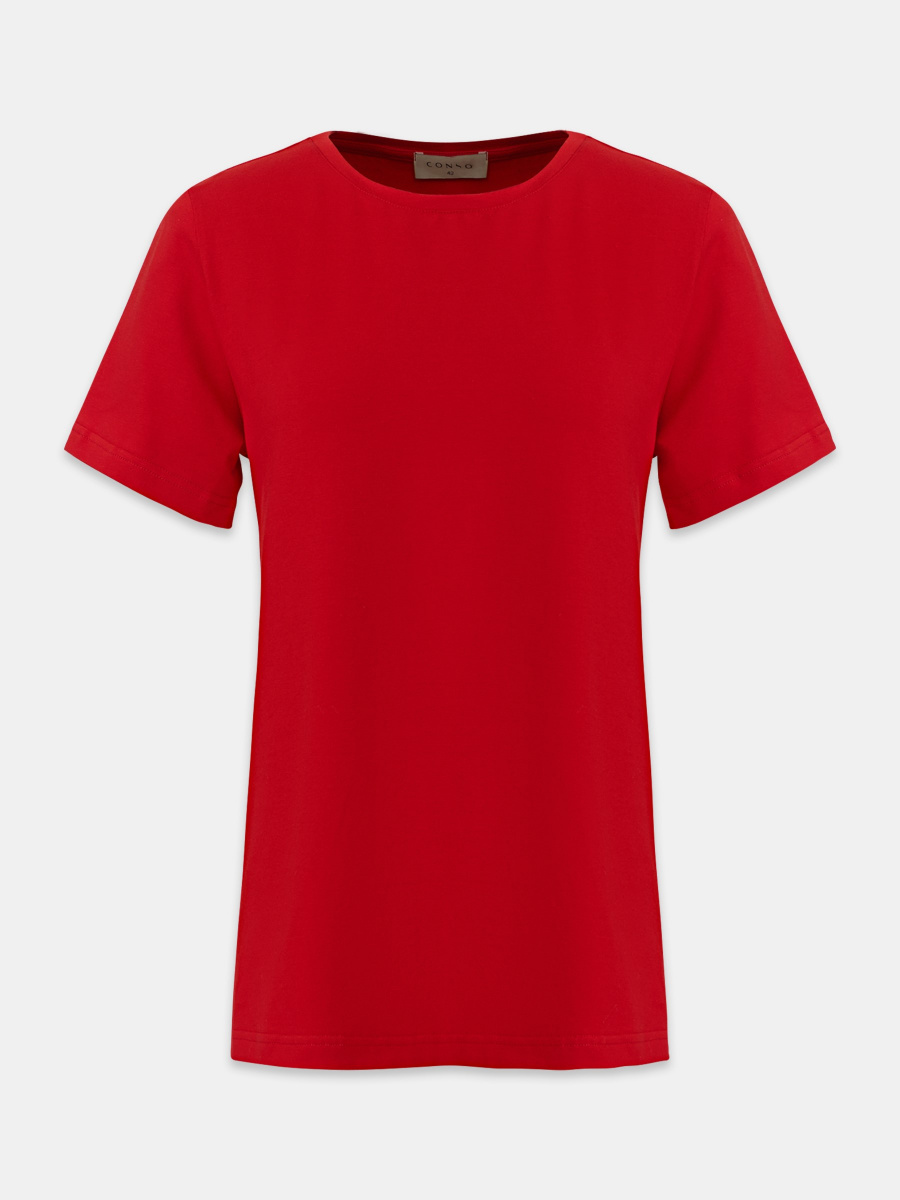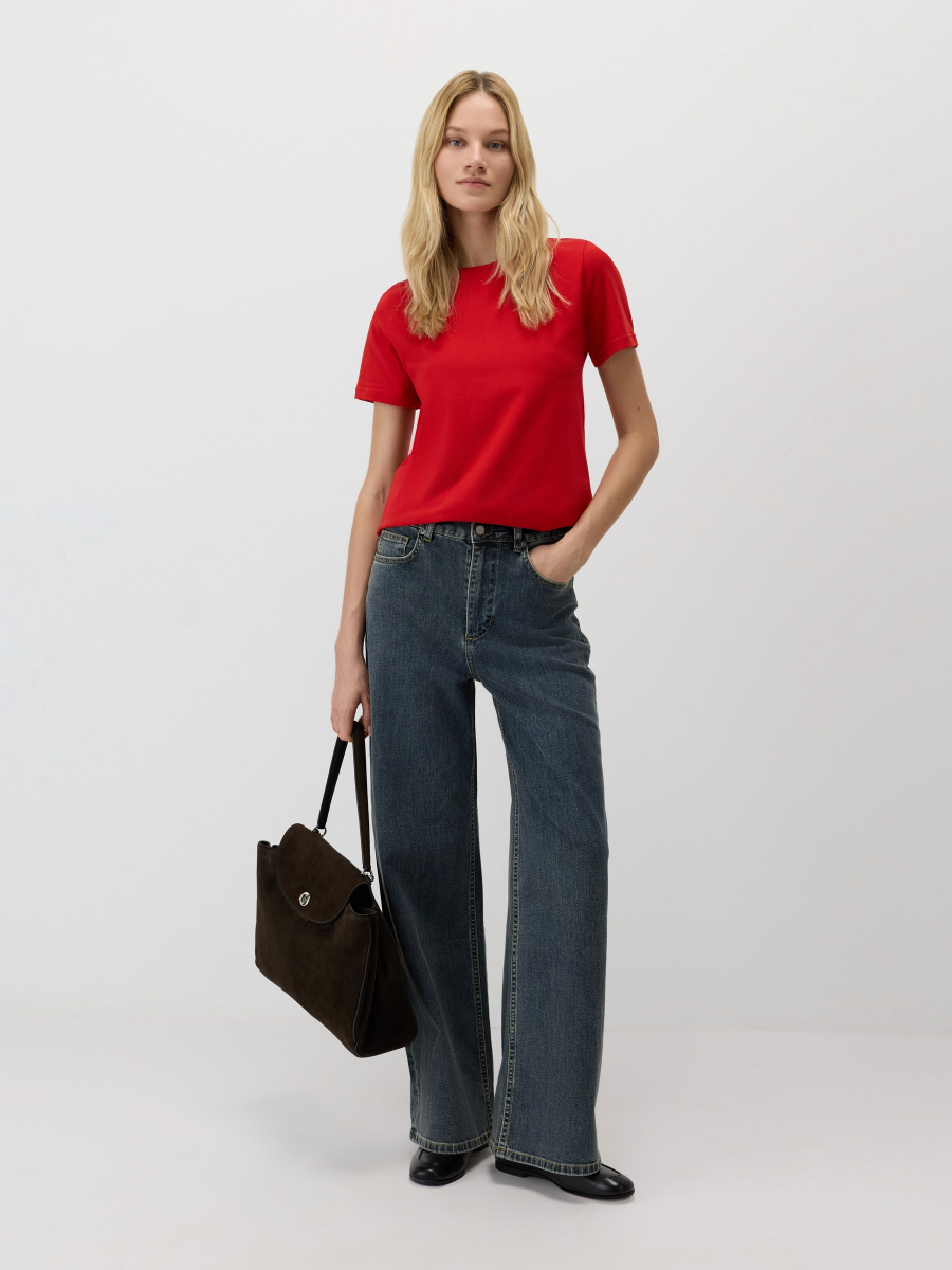 Универсальная базовая футболка — полуприлегающего силуэта, среднего облегания без обтягивания и с классическим круглым вырезом. Длина до линии бедер позволяет легко заправлять или носить изделие навыпуск. Мягкий хлопок с лайкрой обеспечивает комфорт и чуть тянется, адаптируясь под особенности фигуры.