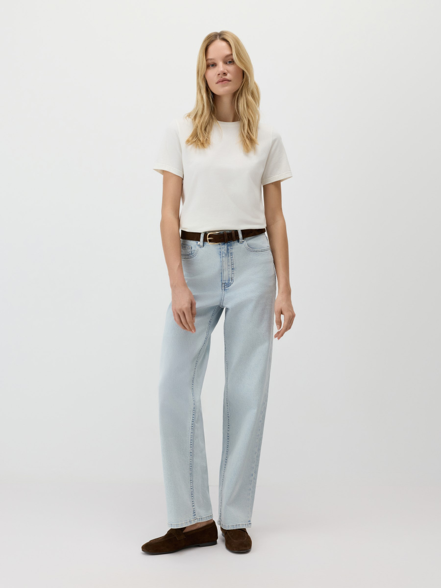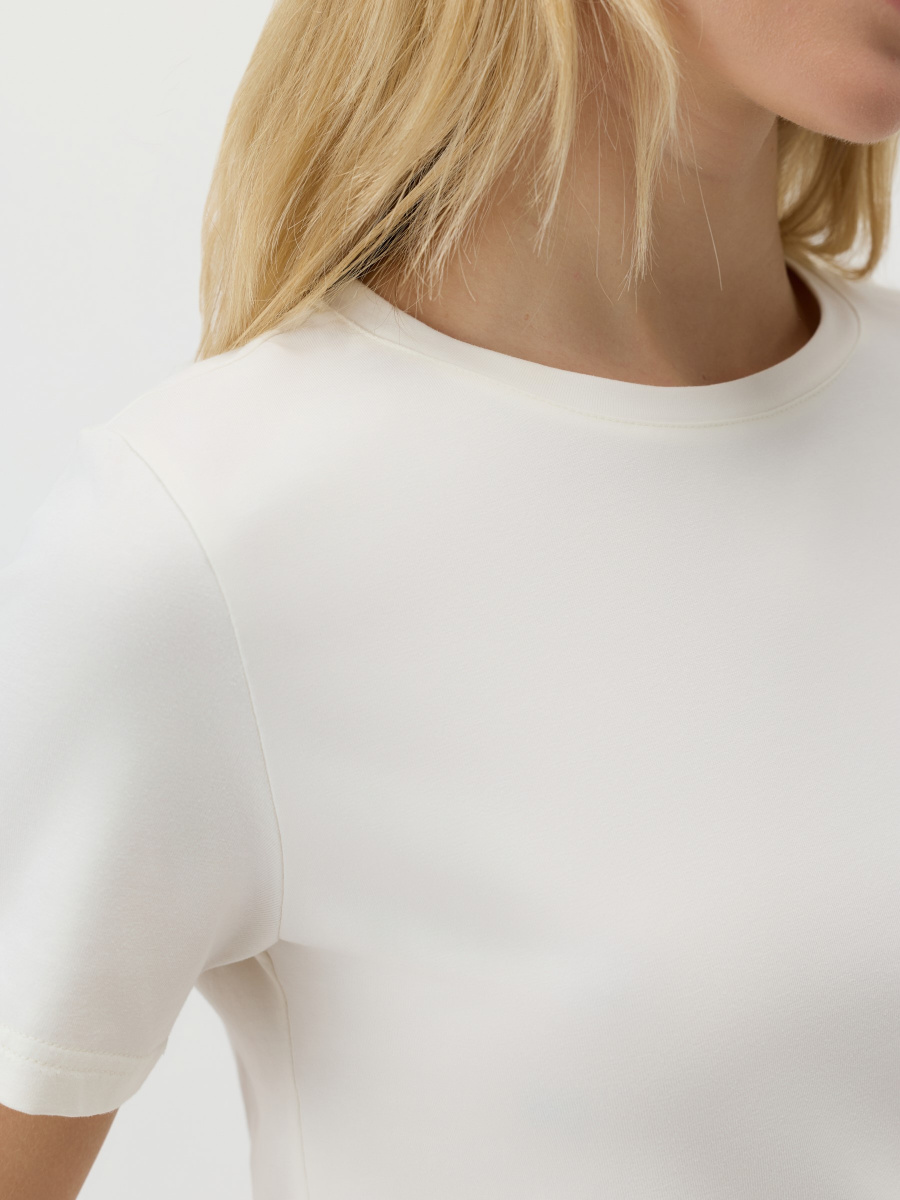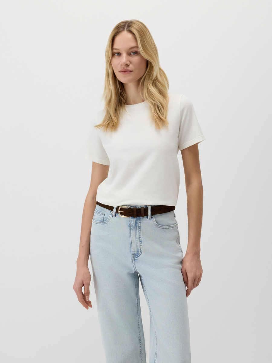 Универсальная базовая футболка — полуприлегающего силуэта, среднего облегания без обтягивания и с классическим круглым вырезом. Длина до линии бедер позволяет легко заправлять или носить изделие навыпуск. Мягкий хлопок с лайкрой обеспечивает комфорт и чуть тянется, адаптируясь под особенности фигуры.